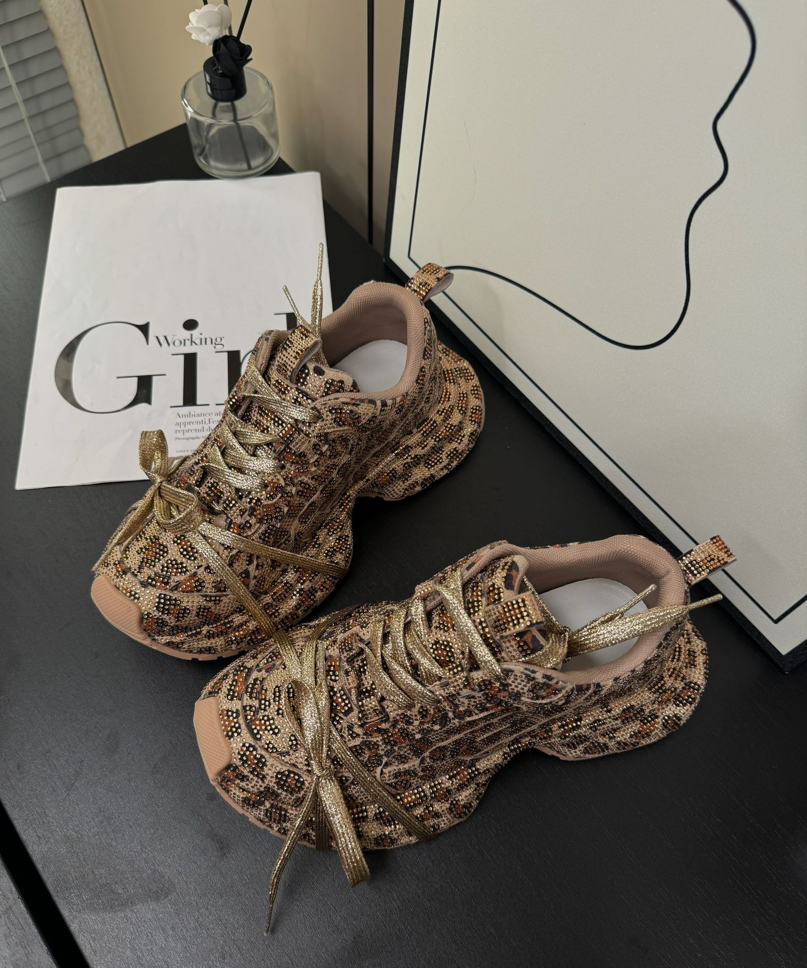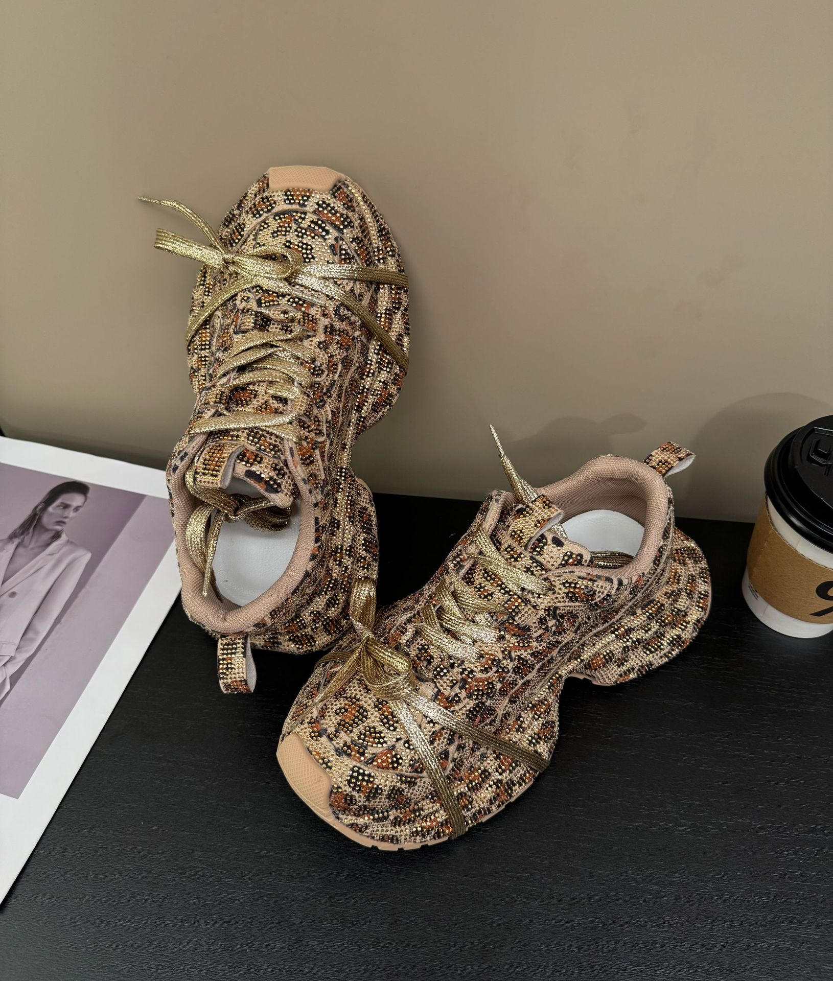 2024 가을 여성용 아빠 신발, 인스 스타일, 풀 다이아몬드 장식, 레오파드 프린트, 골드 컬러, 독특한 디자인, 멋스러운 키높이 효과