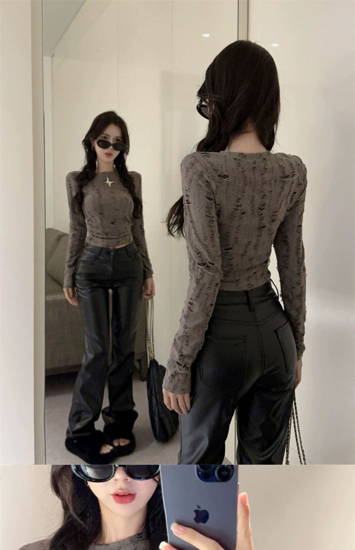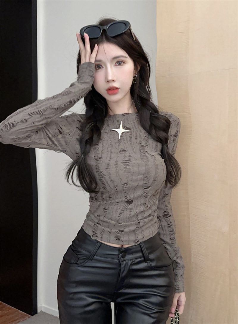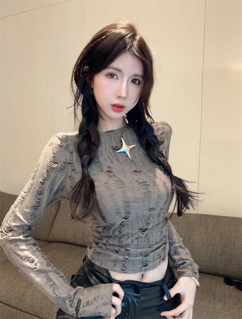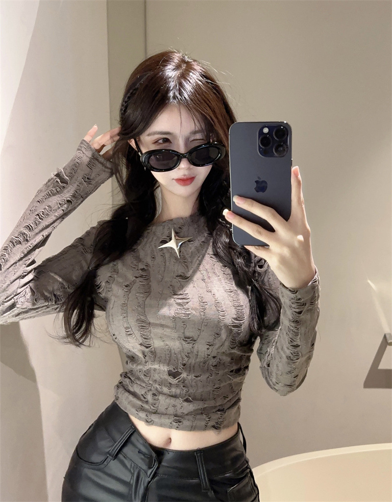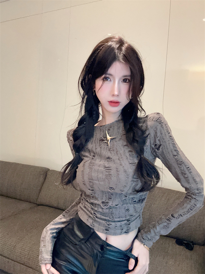 순수한 향신료 소녀 Y2K 짧은 최고 여성의 가을과 겨울 폐기물 지구 스타일 미국 구멍 할로우 긴 소매 티셔츠 베이스 셔츠