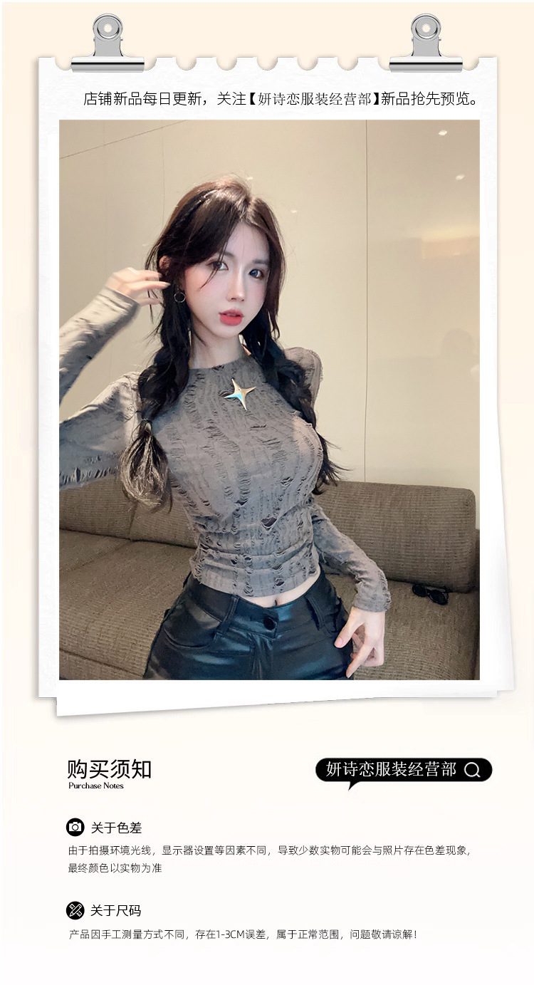 순수한 향신료 소녀 Y2K 짧은 최고 여성의 가을과 겨울 폐기물 지구 스타일 미국 구멍 할로우 긴 소매 티셔츠 베이스 셔츠스토어 가기
