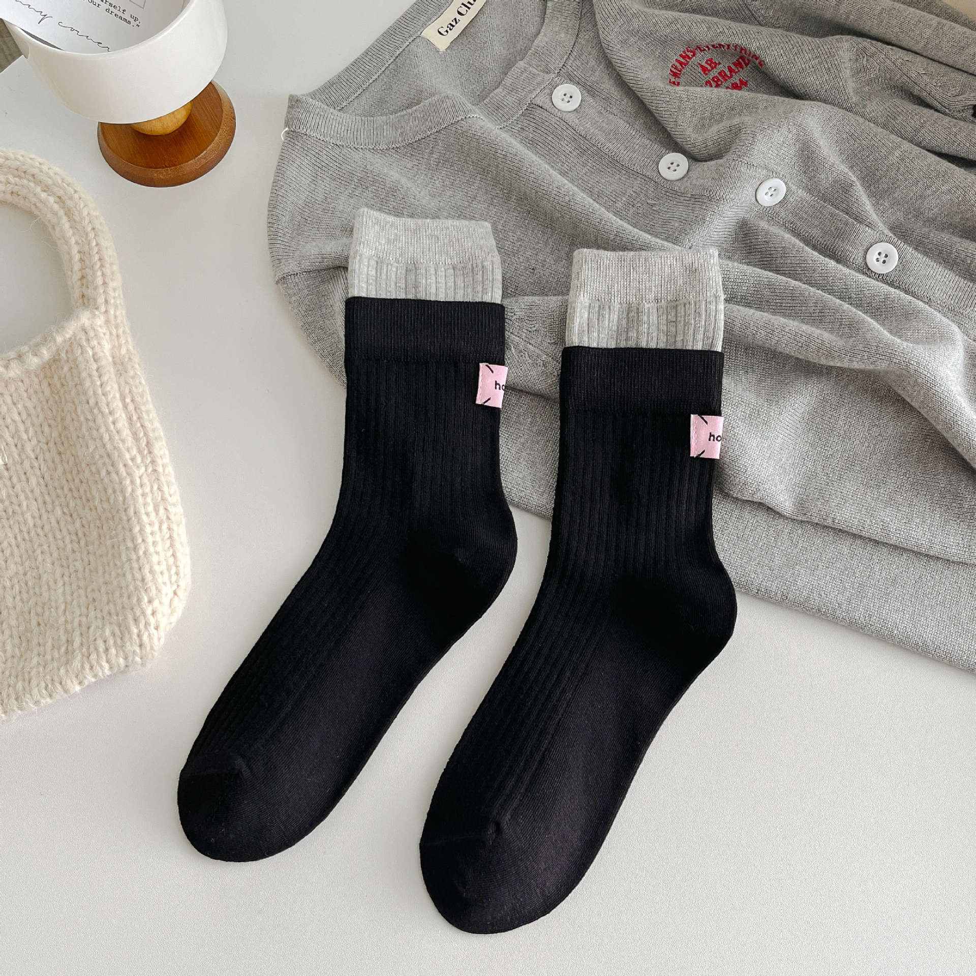 양말 여성용 더블 레이어 스티칭 대비 컬러 힐 패브릭 라벨 중간 길이 양말 Ins 유행 스포츠 스타일 스택 양말