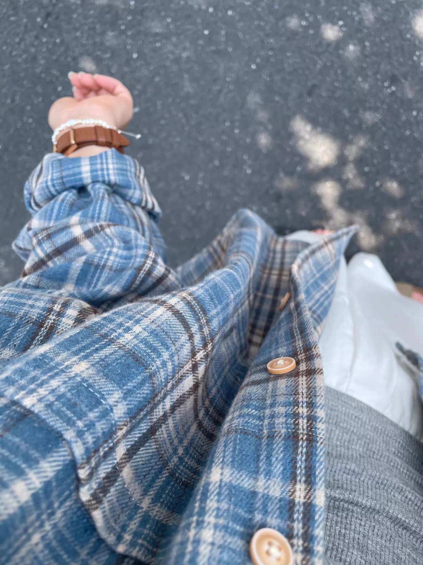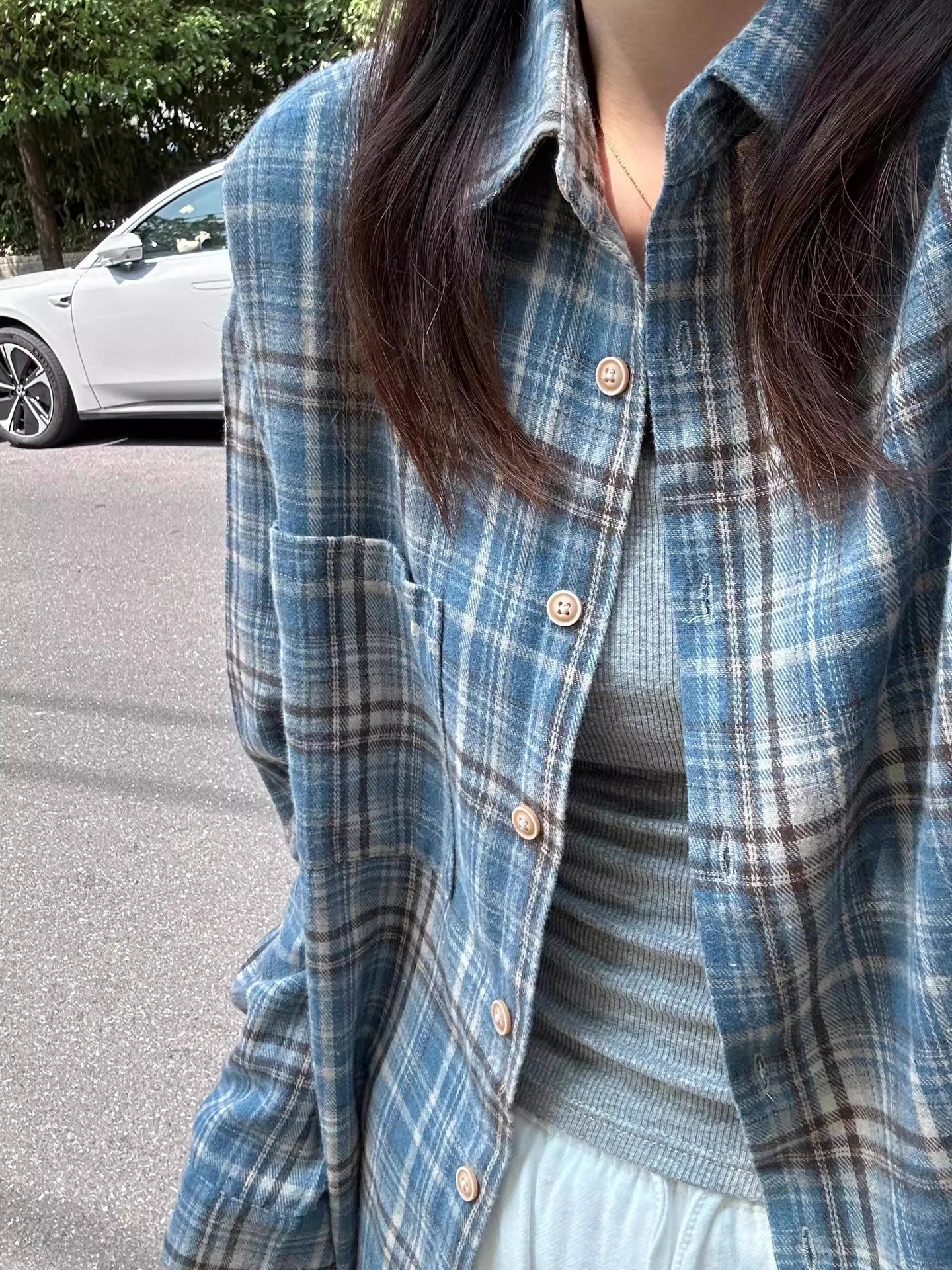 미국 레트로 블루 격자 무늬 긴 소매 셔츠 여자의 중간 길이 2024 가을 캐주얼 올 매치 셔츠 재킷 얇은스토어 가기
