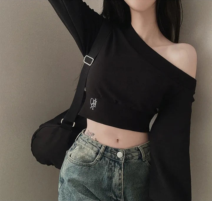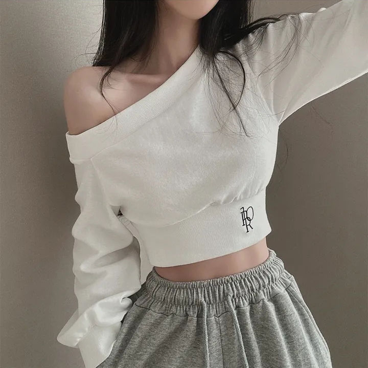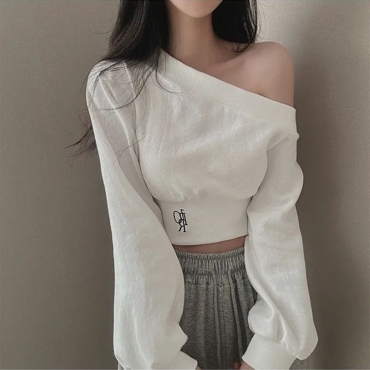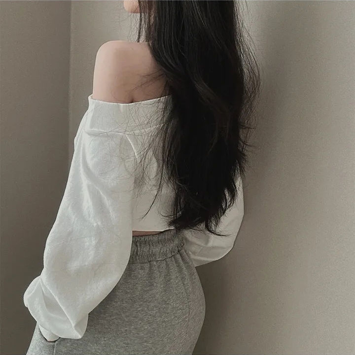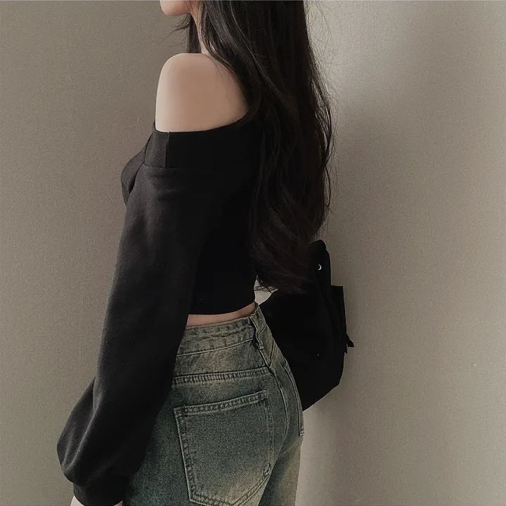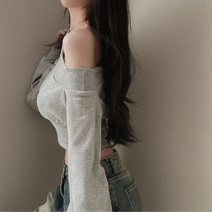 辣妹一字短款露肩卫衣女纯欲风设计高级感宽松春秋薄款长袖上衣潮스토어 가기