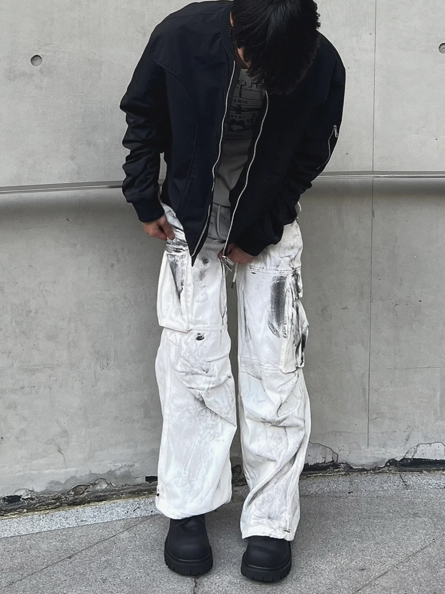 디자인 스트레이트 걸레 청바지 화이트 스플래시 잉크 타이-염료 남성과 여성의 느슨한 미국 스타일 하이 스트리트 멀티 포켓 툴링 바지스토어 가기