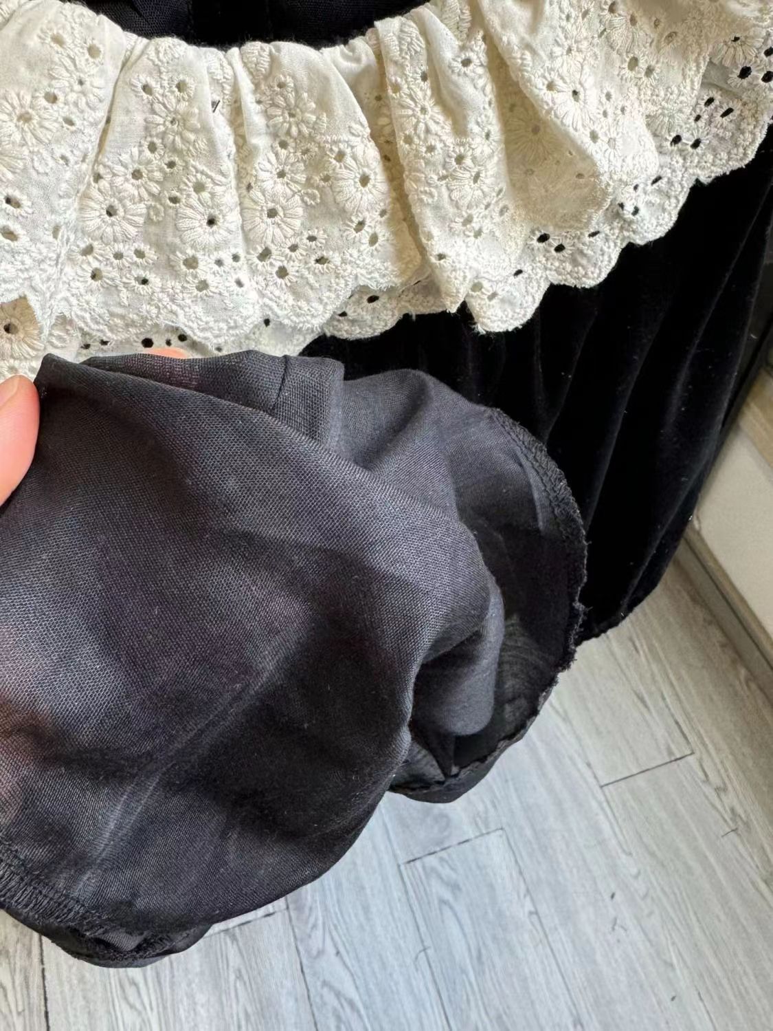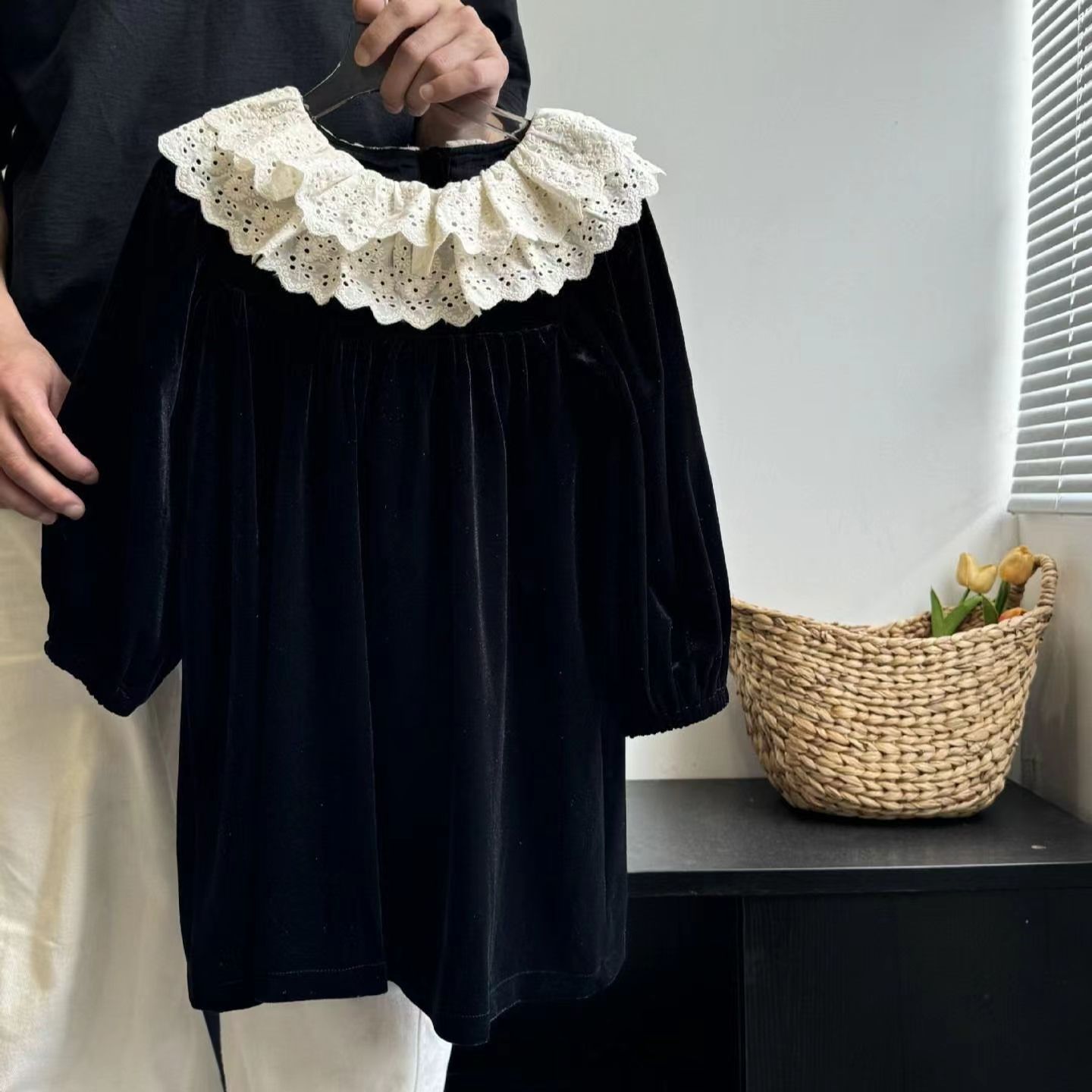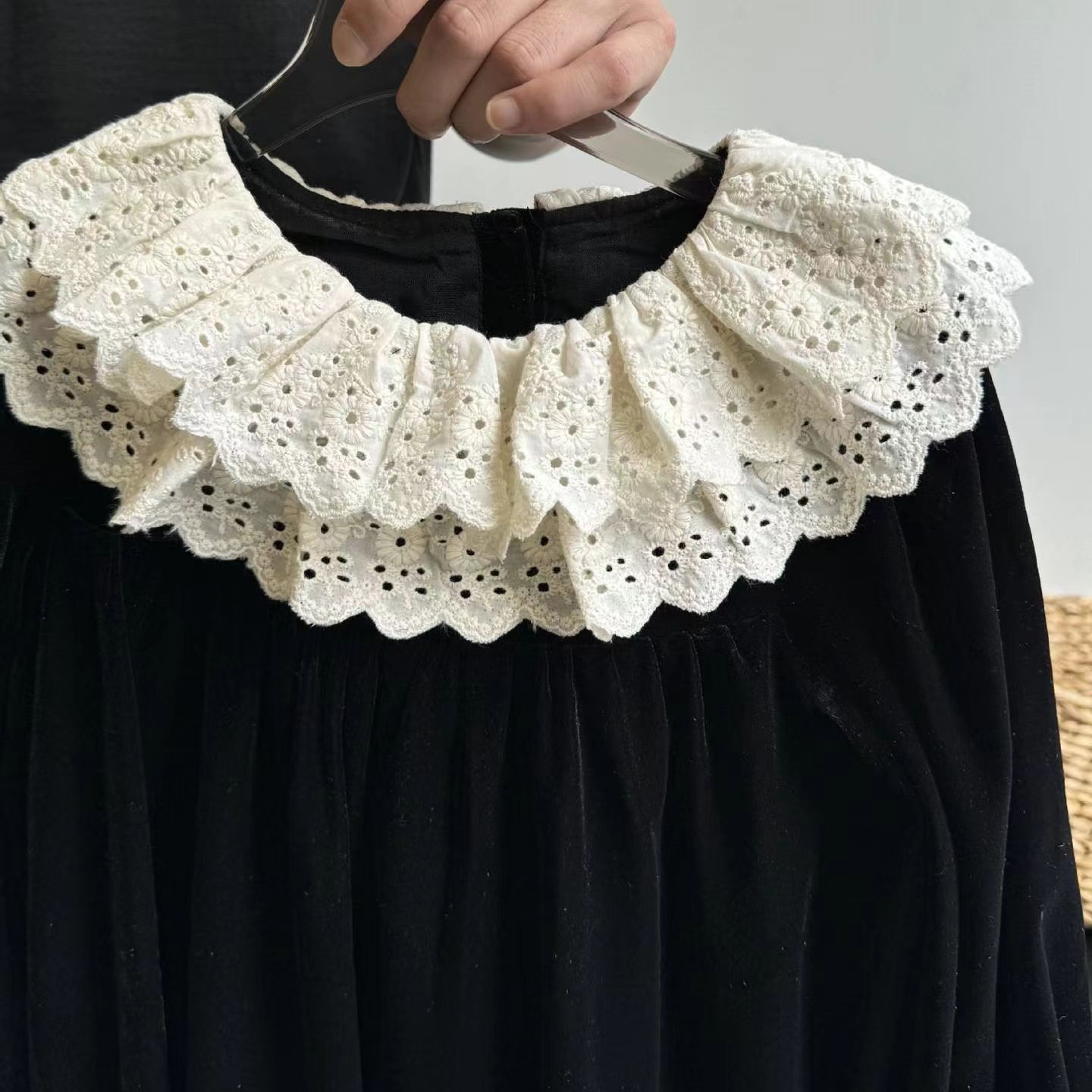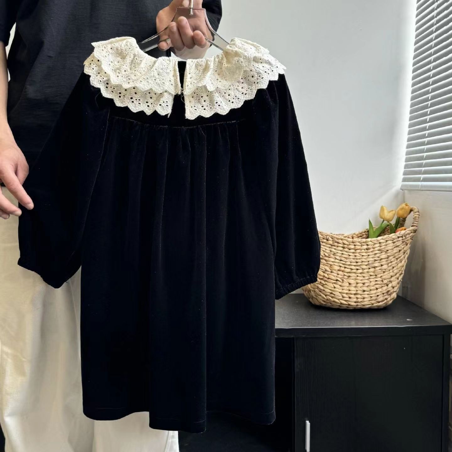가을 2024 소녀 황금 벨벳 원피스 아기 소녀 레이스 칼라 긴 소매 치마 소녀 검은 공주 원피스 트렌디스토어 가기