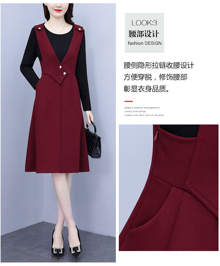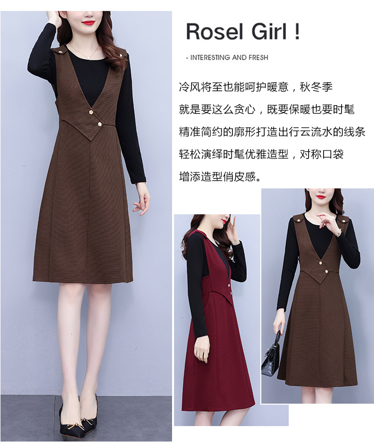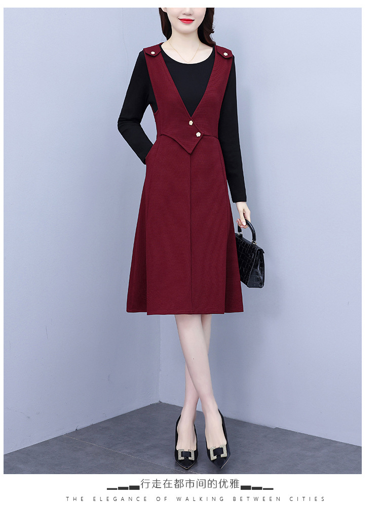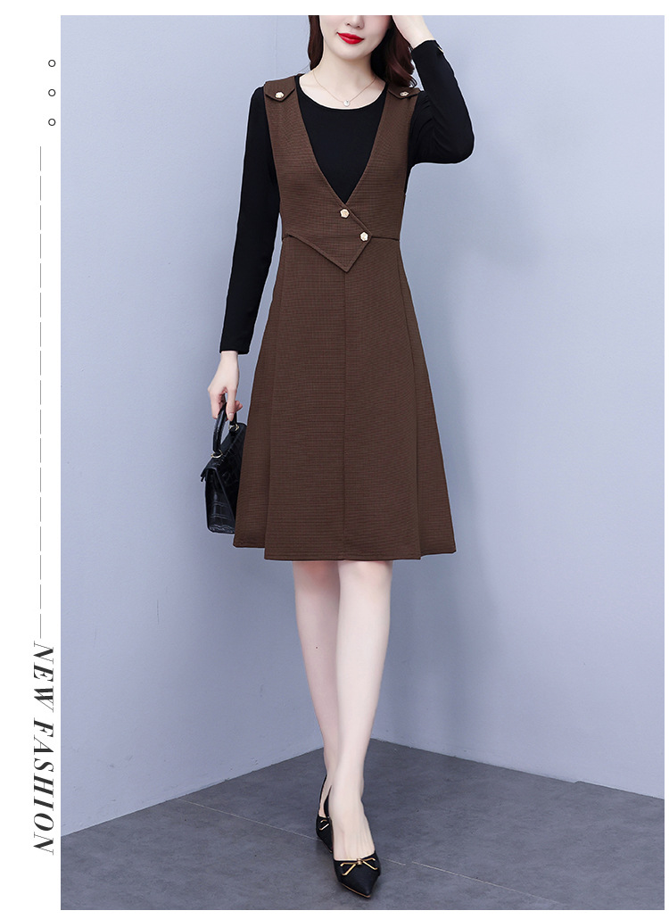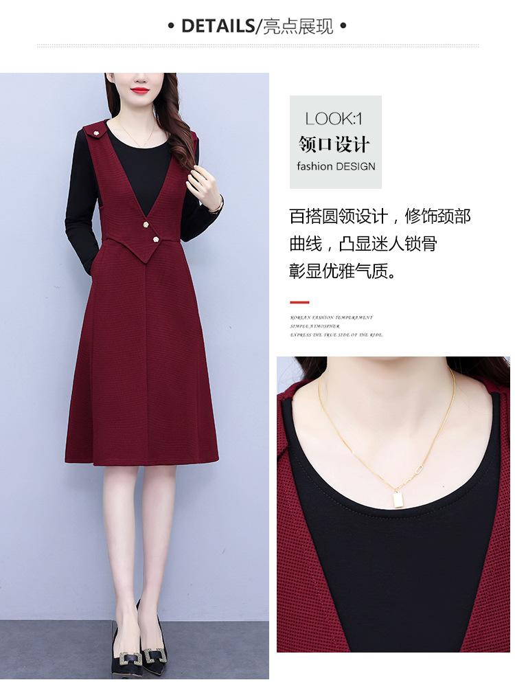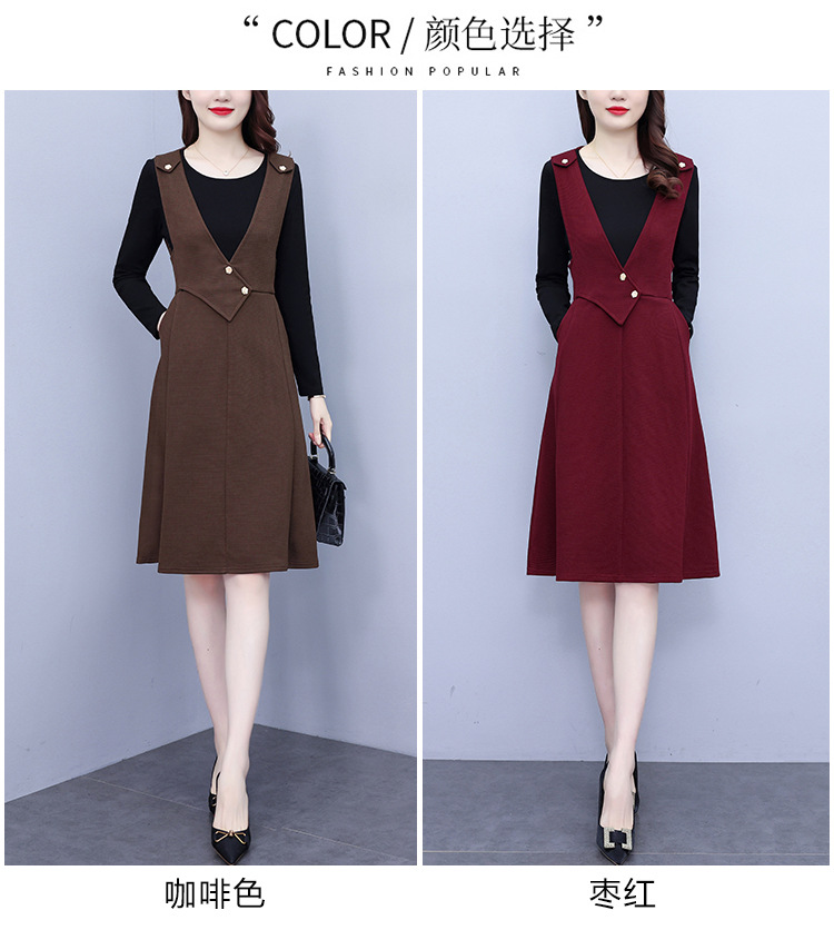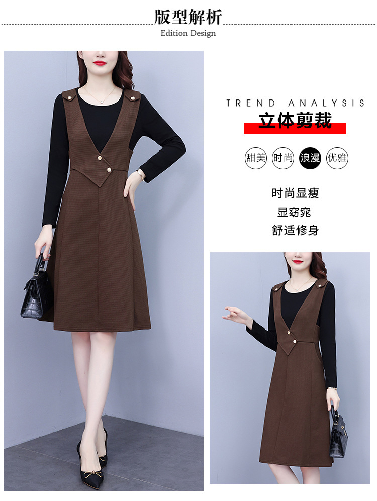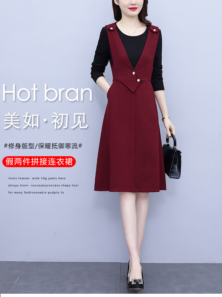 2024 년 가을 새로운 한국식 접합 치마 가짜 2 피스 세트 플러스 사이즈 슬림 핏 슬리밍 원피스스토어 가기