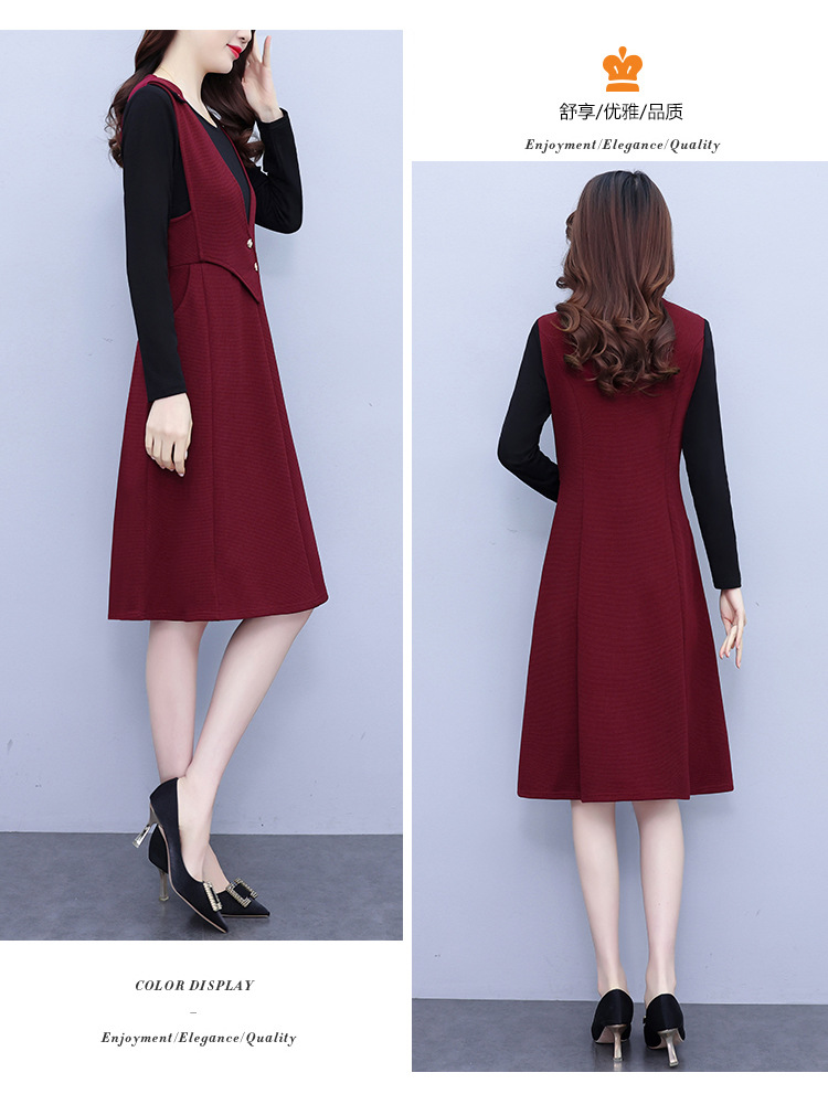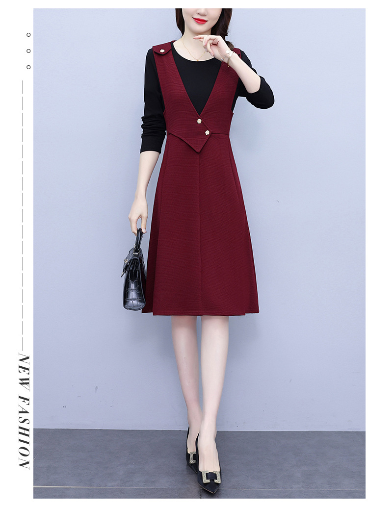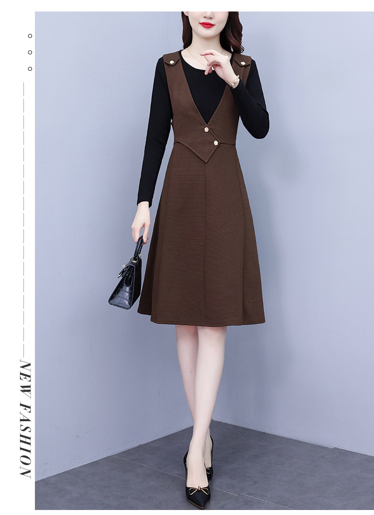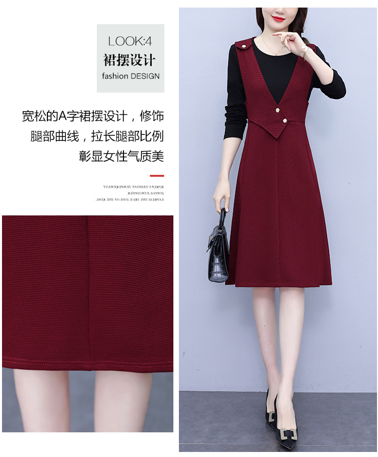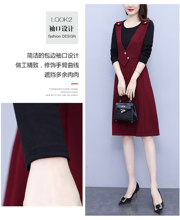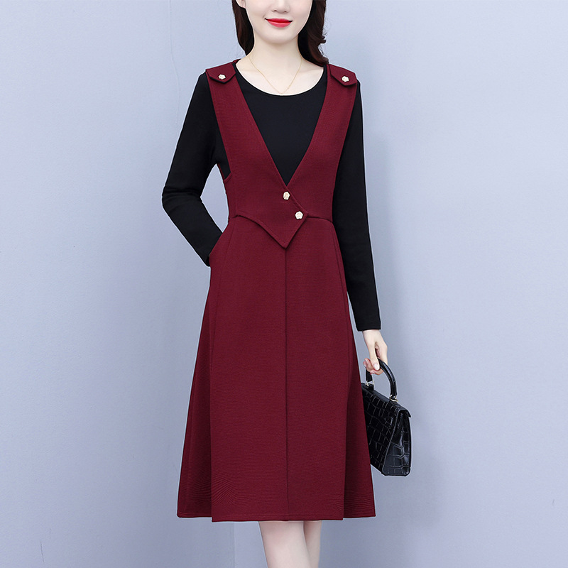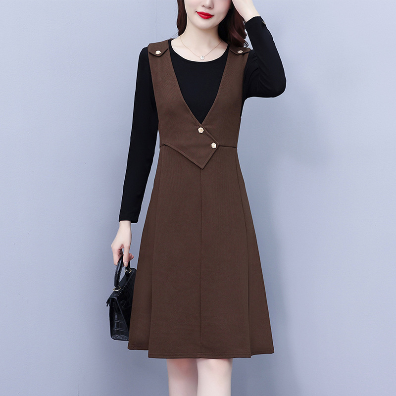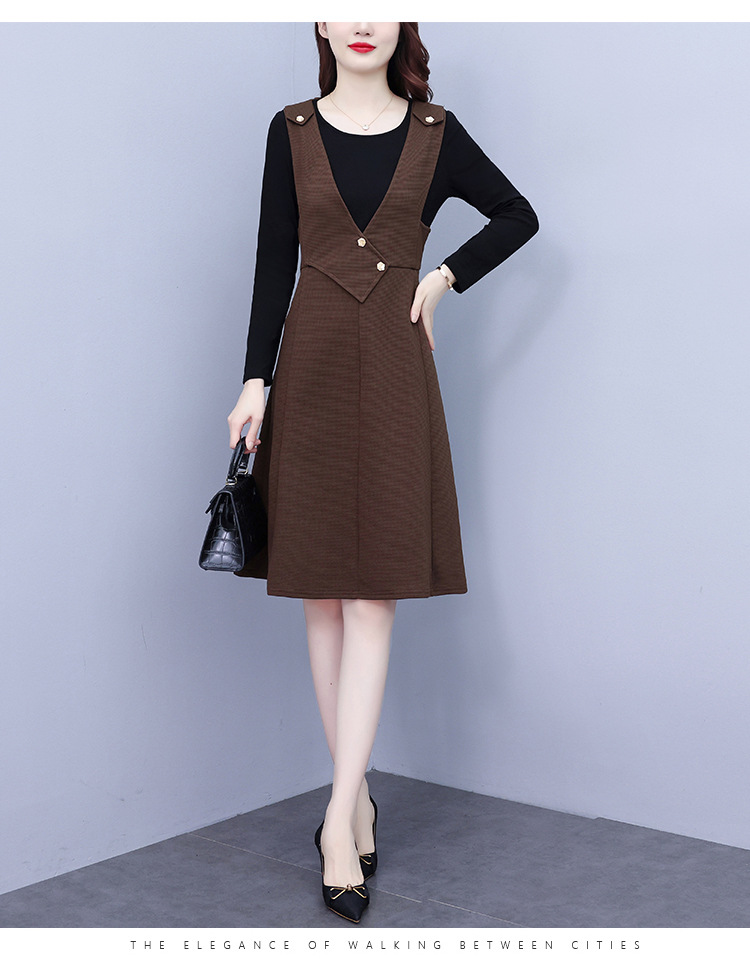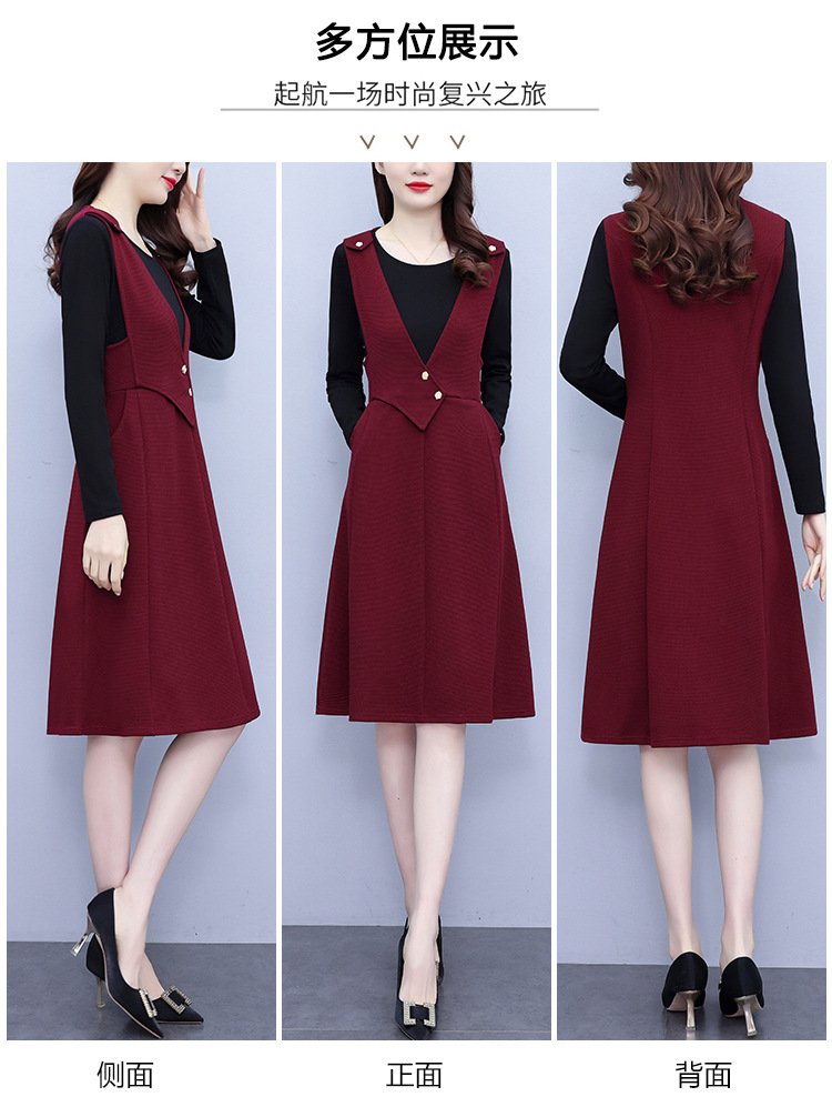 2024 년 가을 새로운 한국식 접합 치마 가짜 2 피스 세트 플러스 사이즈 슬림 핏 슬리밍 원피스스토어 가기