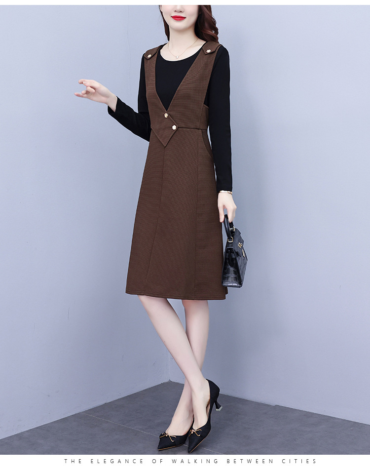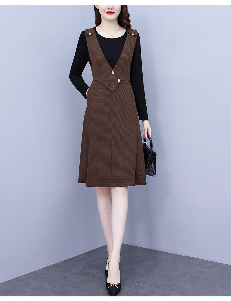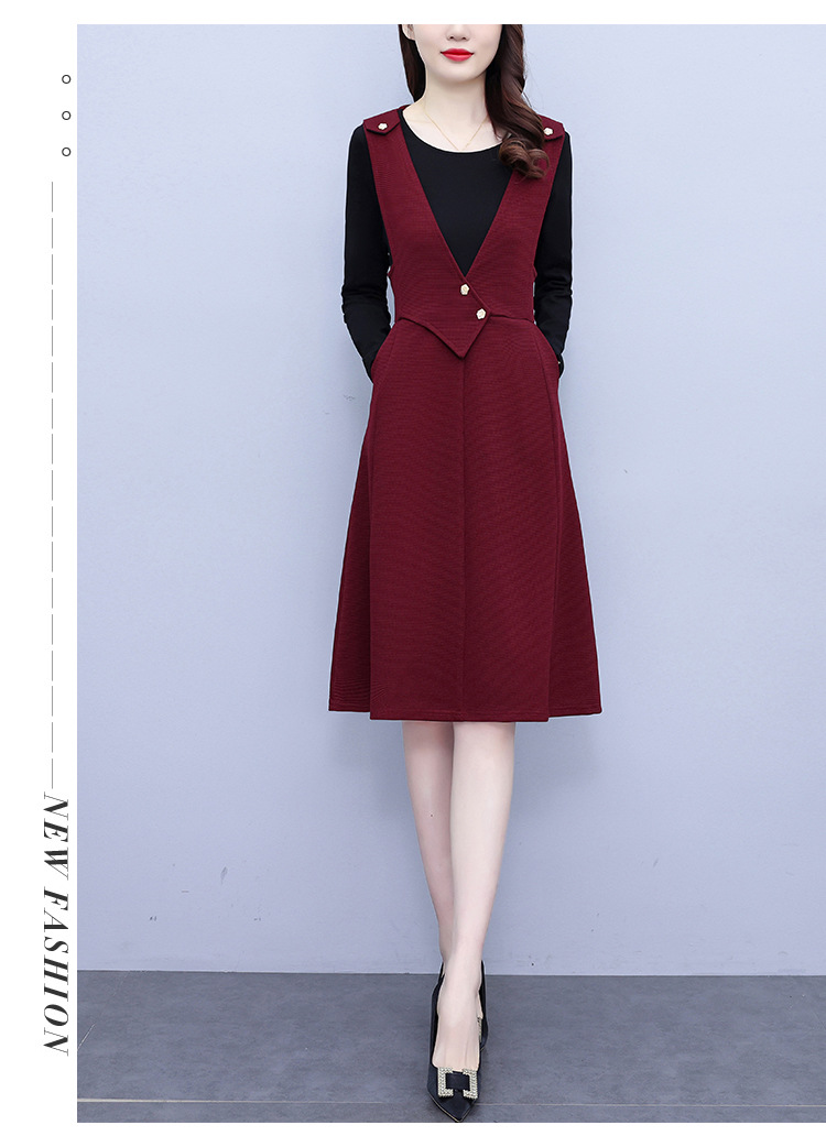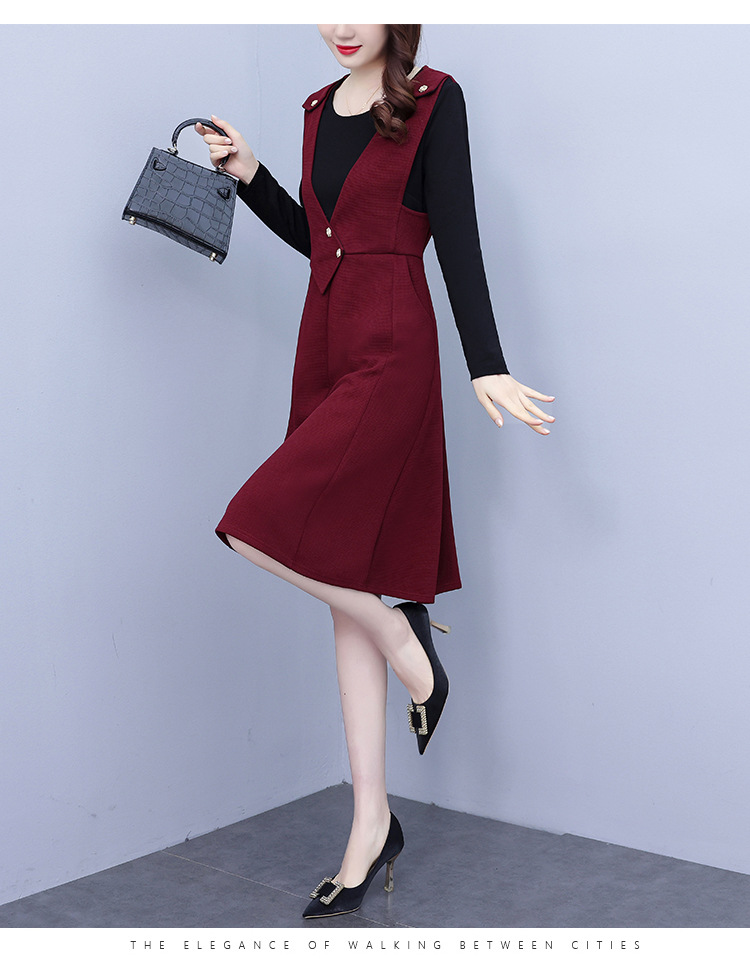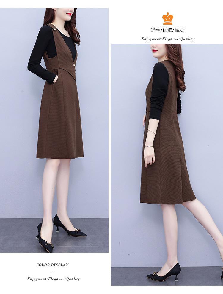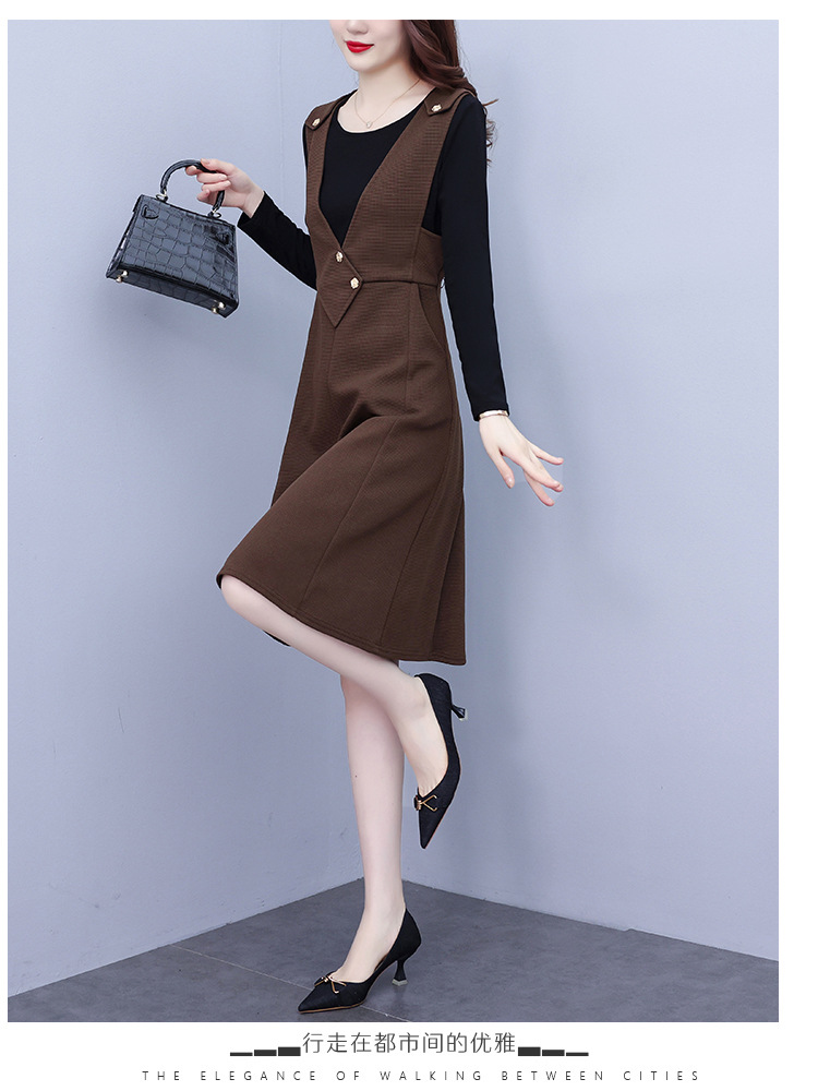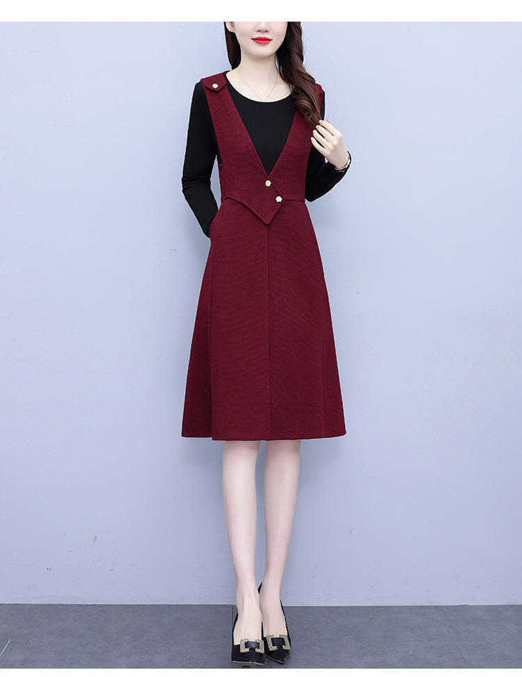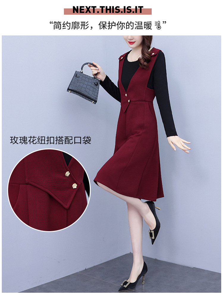 2024 년 가을 새로운 한국식 접합 치마 가짜 2 피스 세트 플러스 사이즈 슬림 핏 슬리밍 원피스스토어 가기
