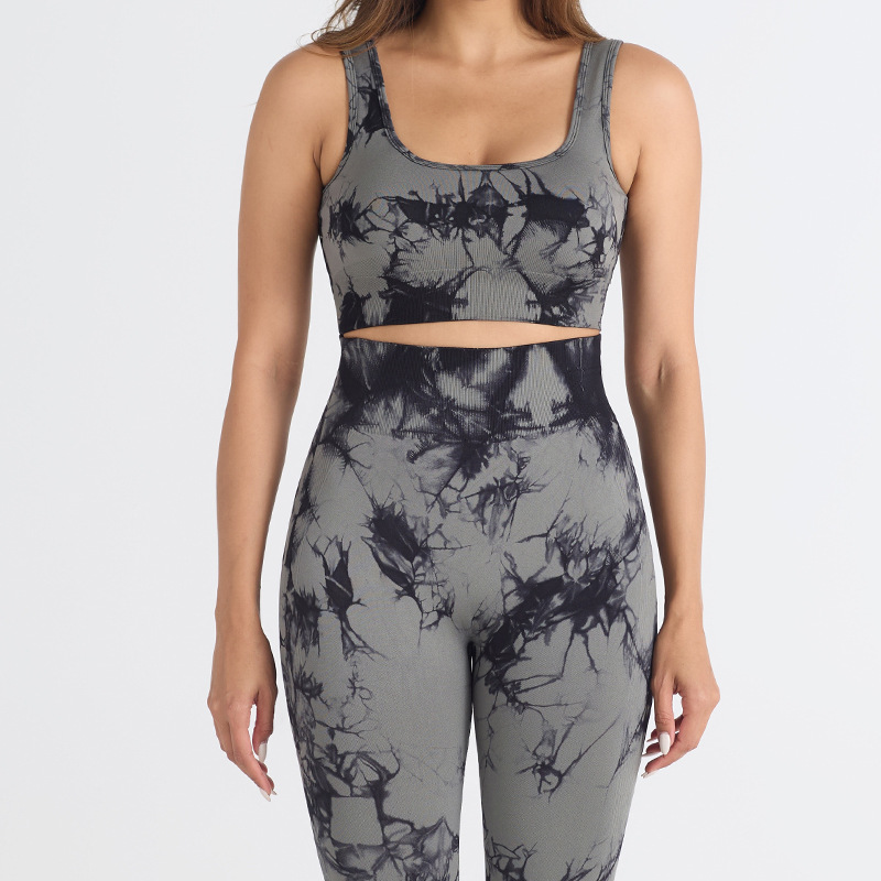 새로운 유럽과 미국의 원활한 높은 허리 스포츠 엉덩이 빠른 건조 요가 세트 3 종 세트 여성용 타이트 염색 요가 바지