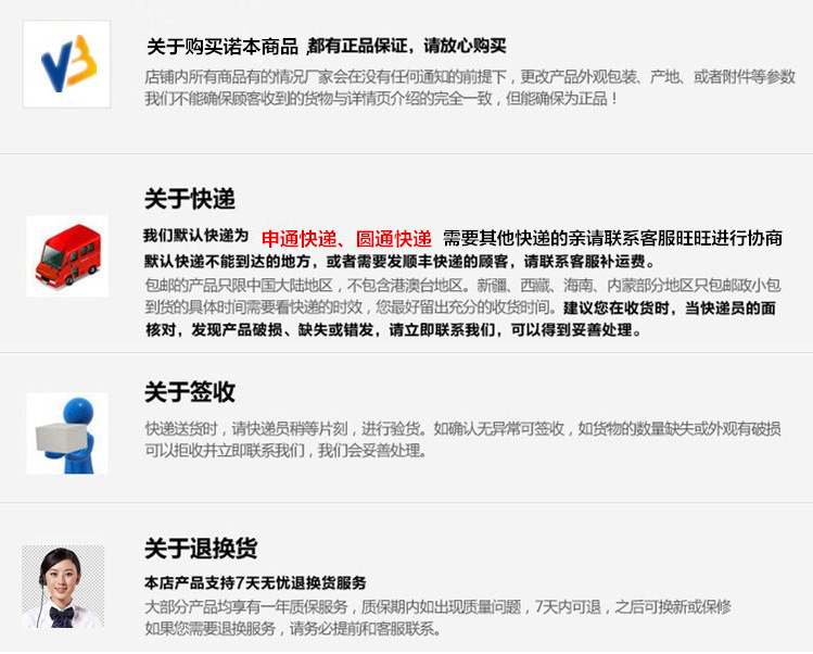 3.产品本身没有质量问题的,属于人为损坏的,超过质保期的,一律不可退换货。