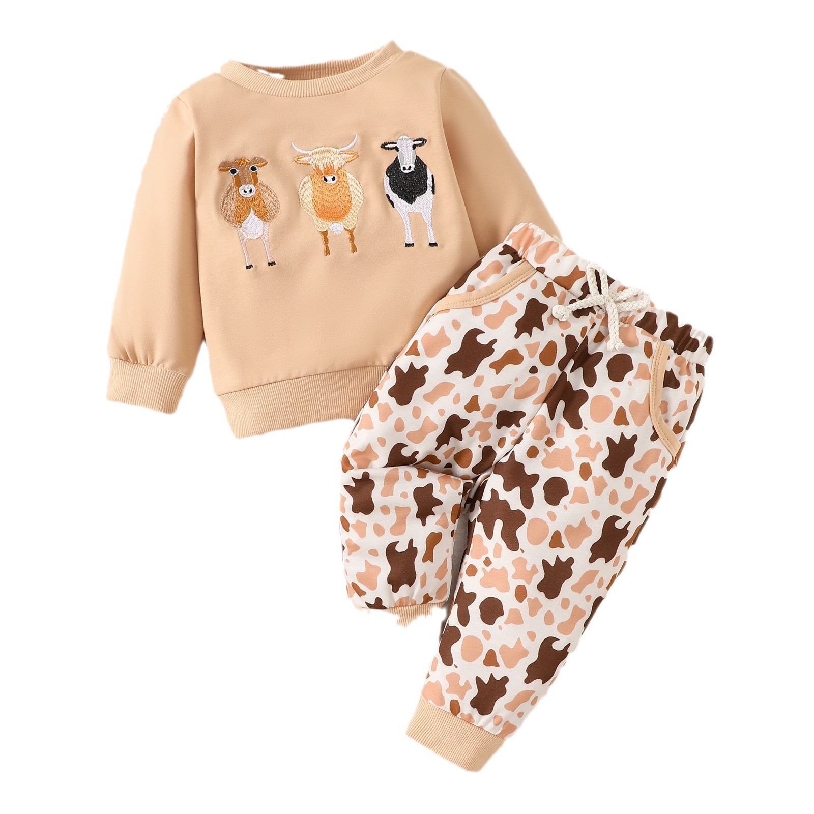 2024 가을 신상 유아 남아 농장 스타일 만화 소 자수 스웨트셔츠와 바지 세트 캐주얼 홈웨어