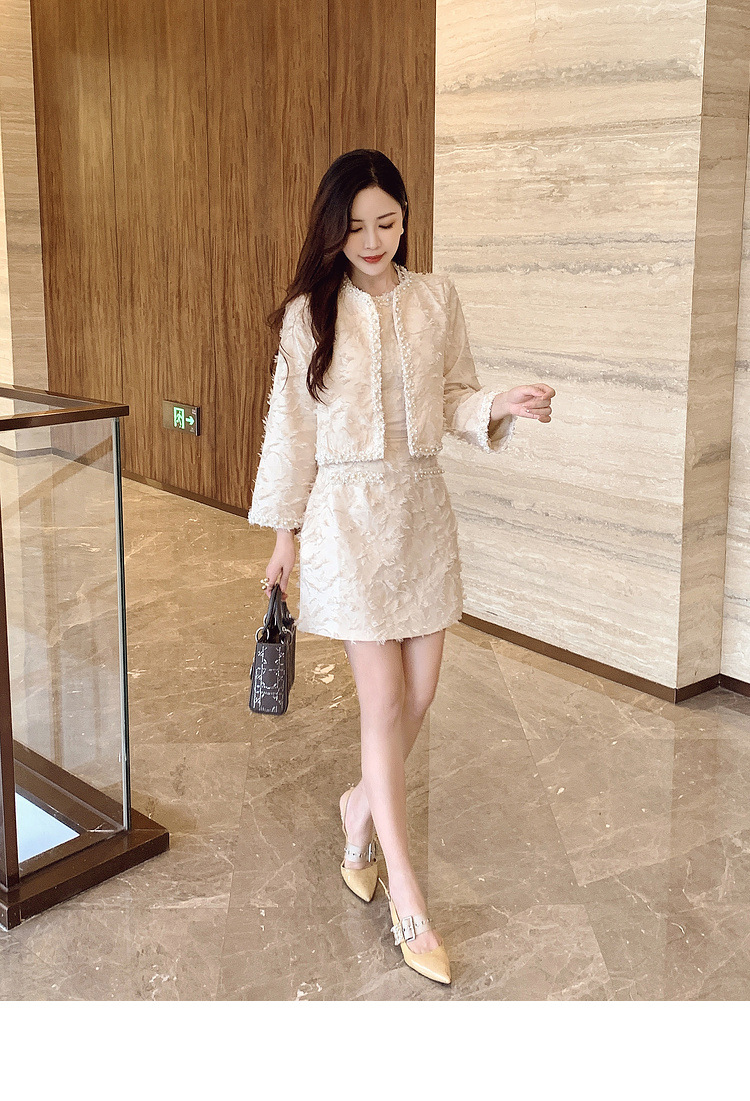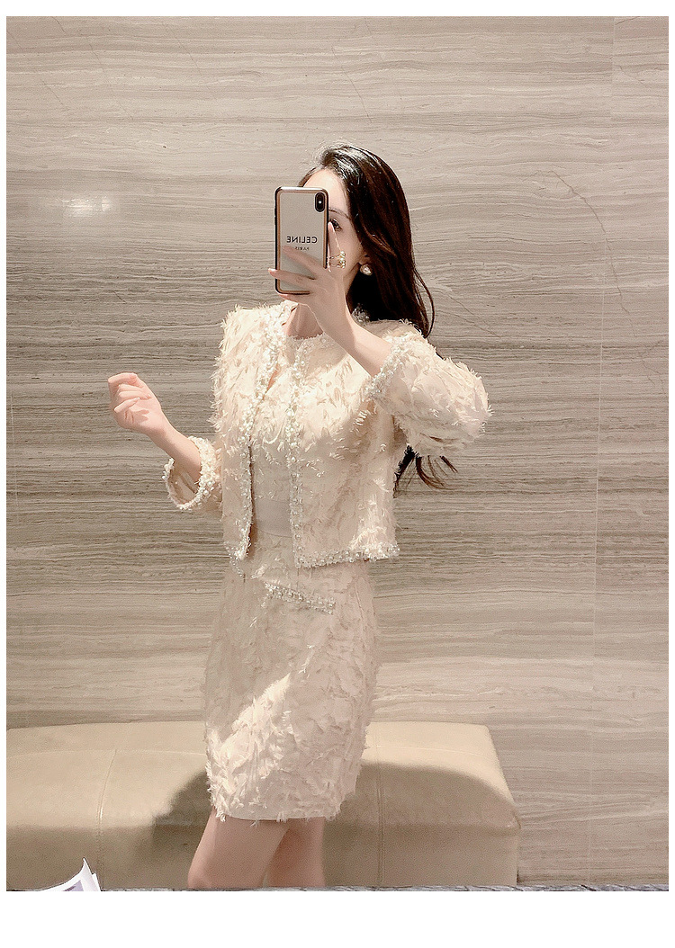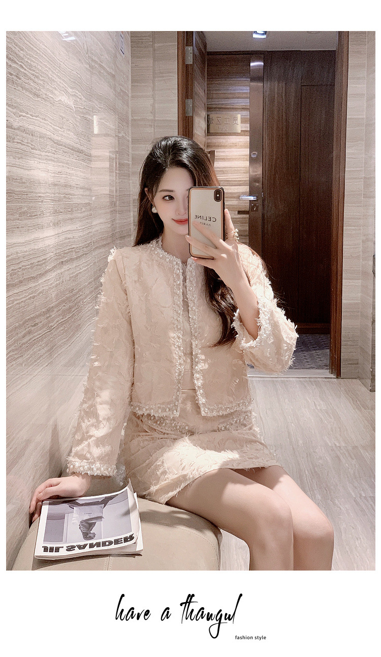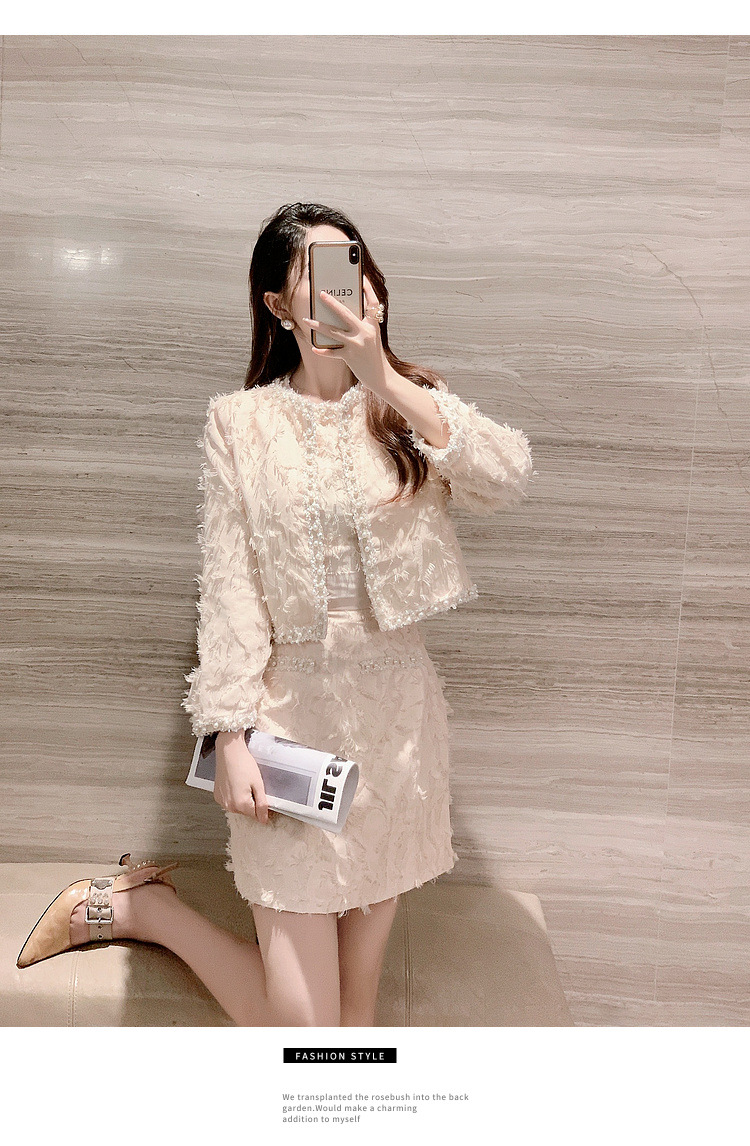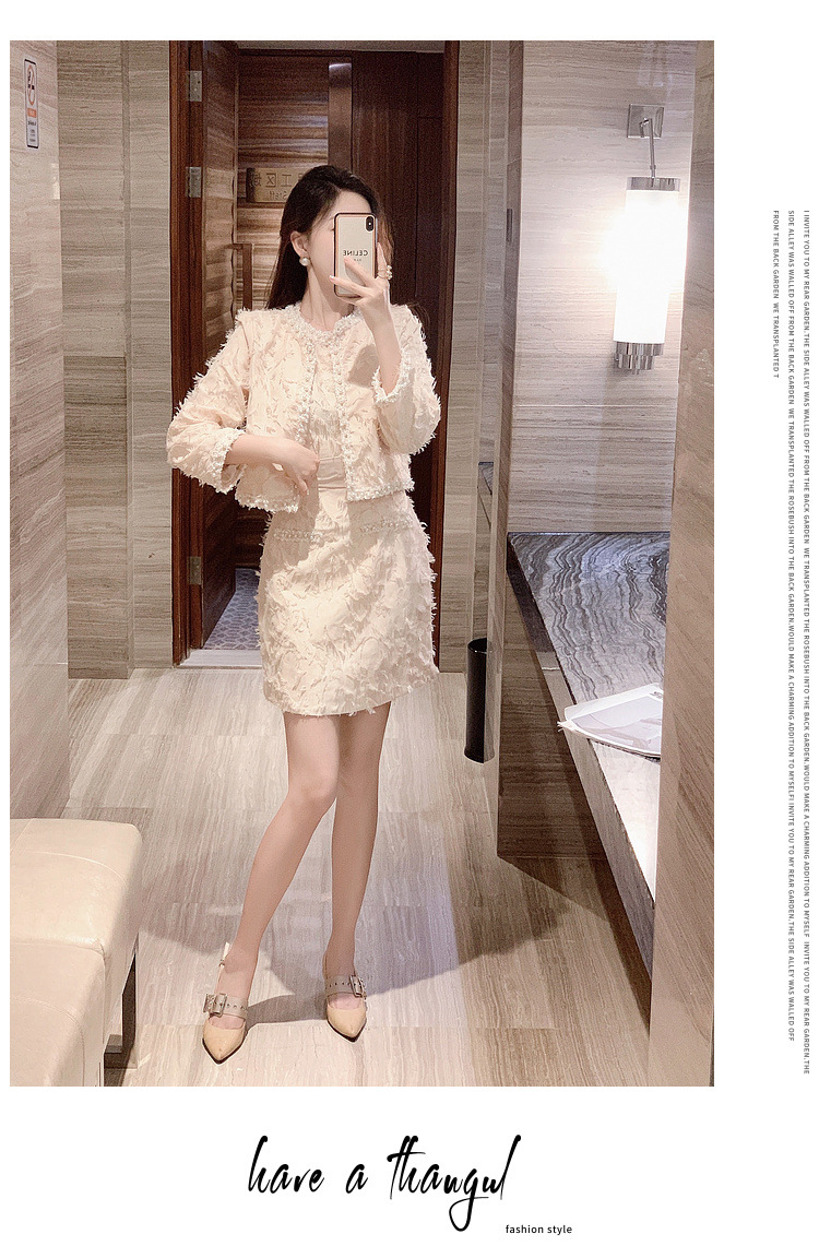 기질 빛 성숙한 연예인 세트 여성의 2024 가을/겨울 중공업 구슬 짧은 재킷 슬림 핏 조끼 스커트 투피스 세트스토어 가기