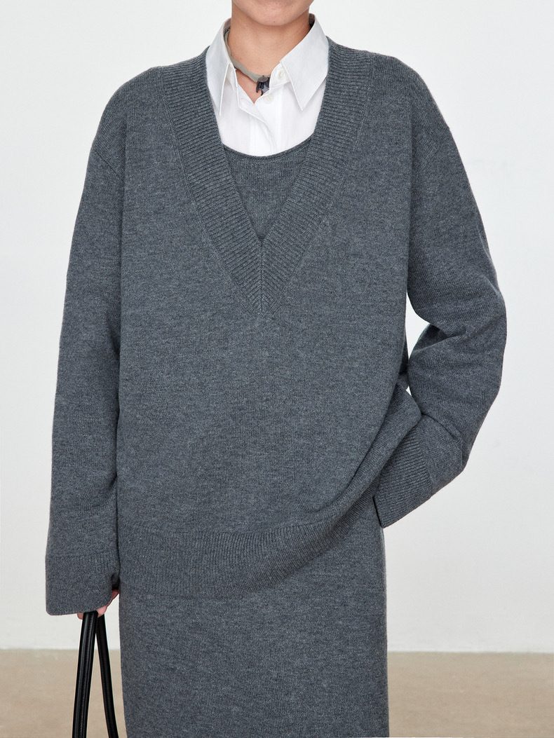 틈새 미니멀리스트 ROW 스타일 2025 가을과 겨울 양모 스웨터 대형 V-넥 탑 게으른 니트 스웨터 그레이 스웨터 여성복