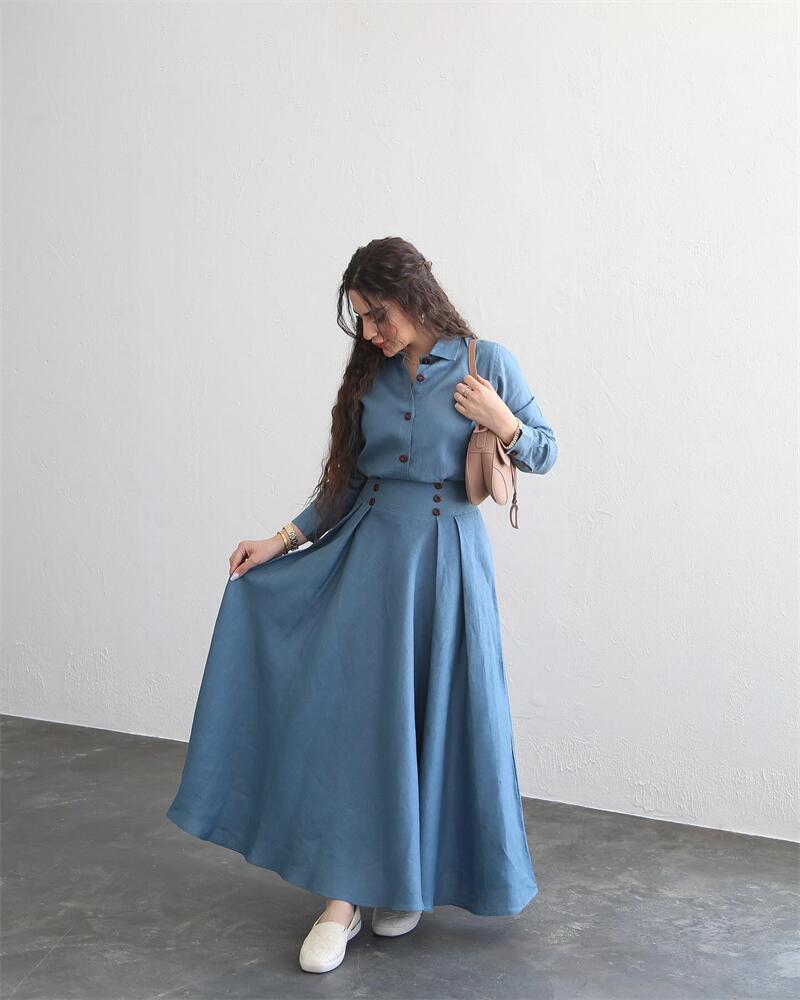 대외 무역 재고 여성의 2024 가을 새로운 린넨 패션 단색 느슨한 긴 소매 셔츠 스커트 투피스 세트