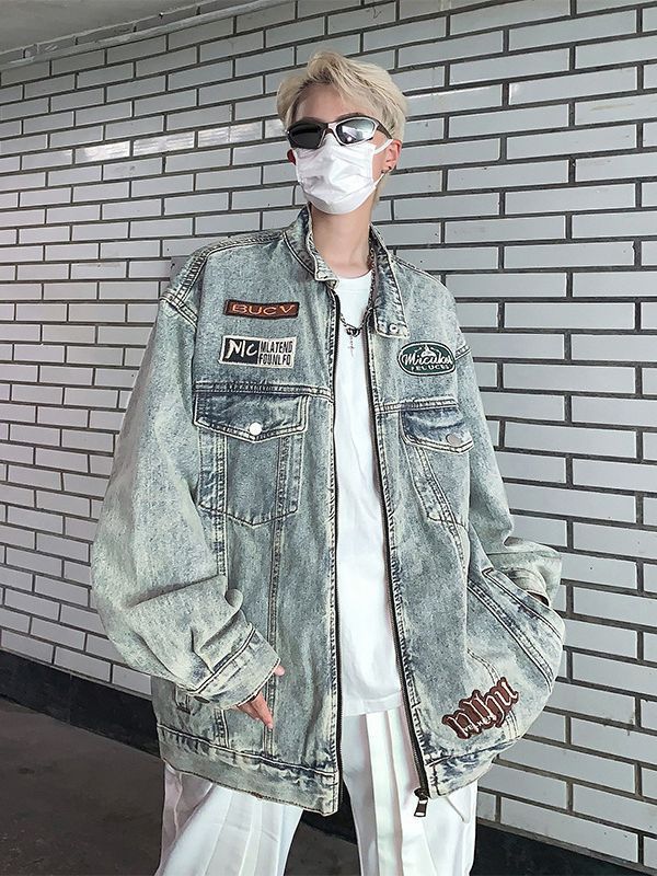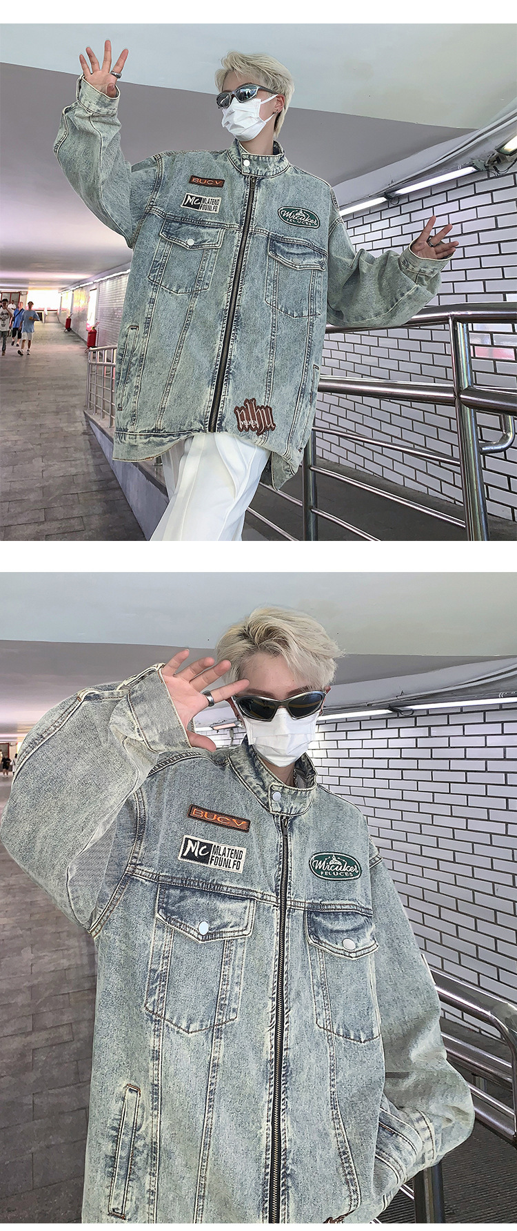 수직 칼라 자수 데님 재킷 남성 봄과 가을 미국 빈티지 바이브 워크 재킷 유행 브랜드 루즈 트렌디스토어 가기