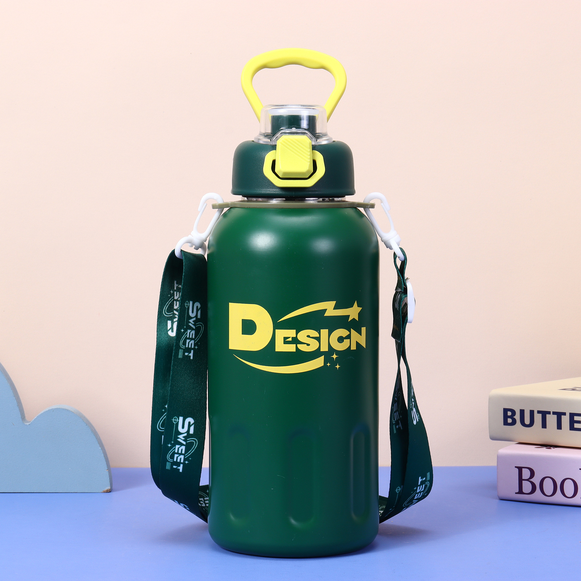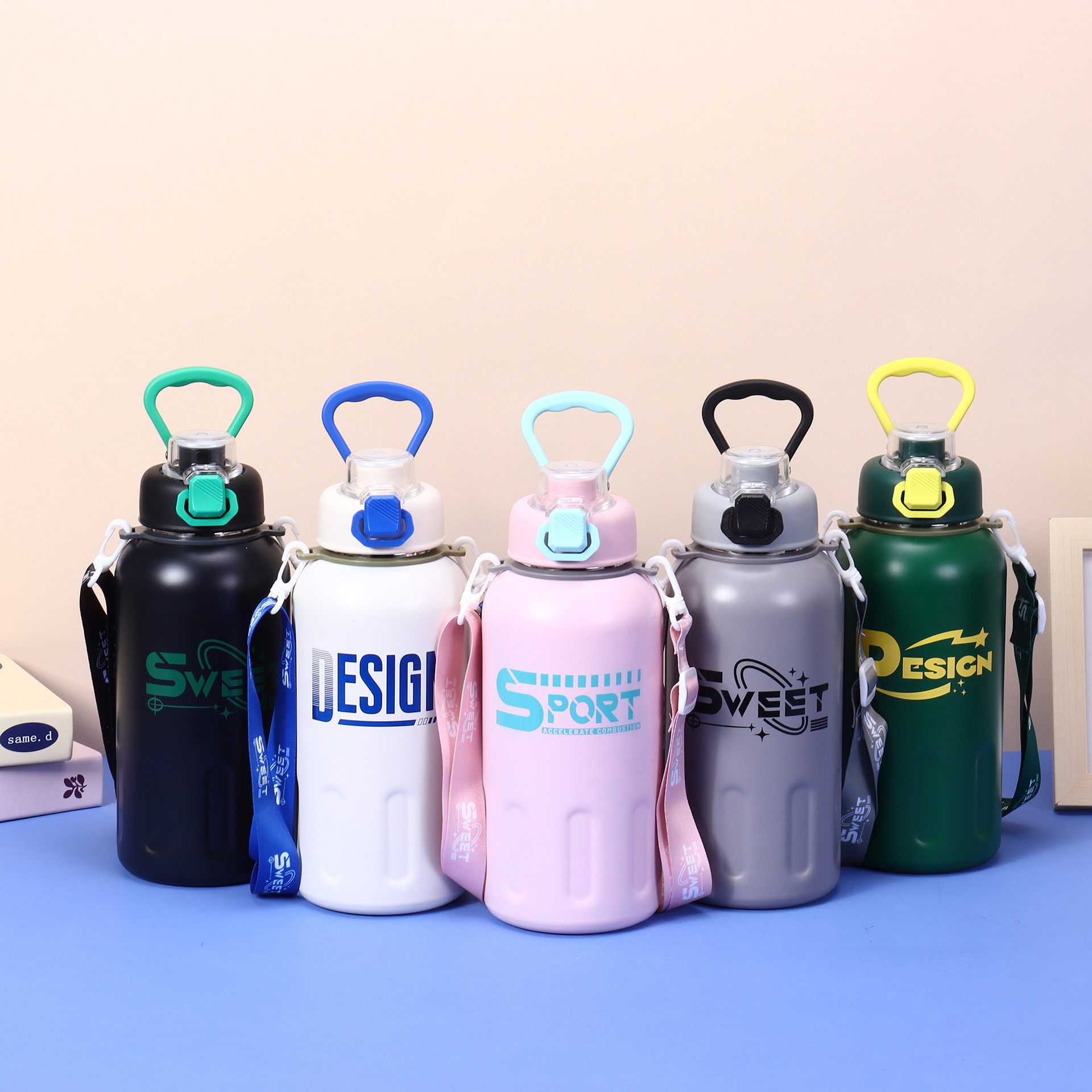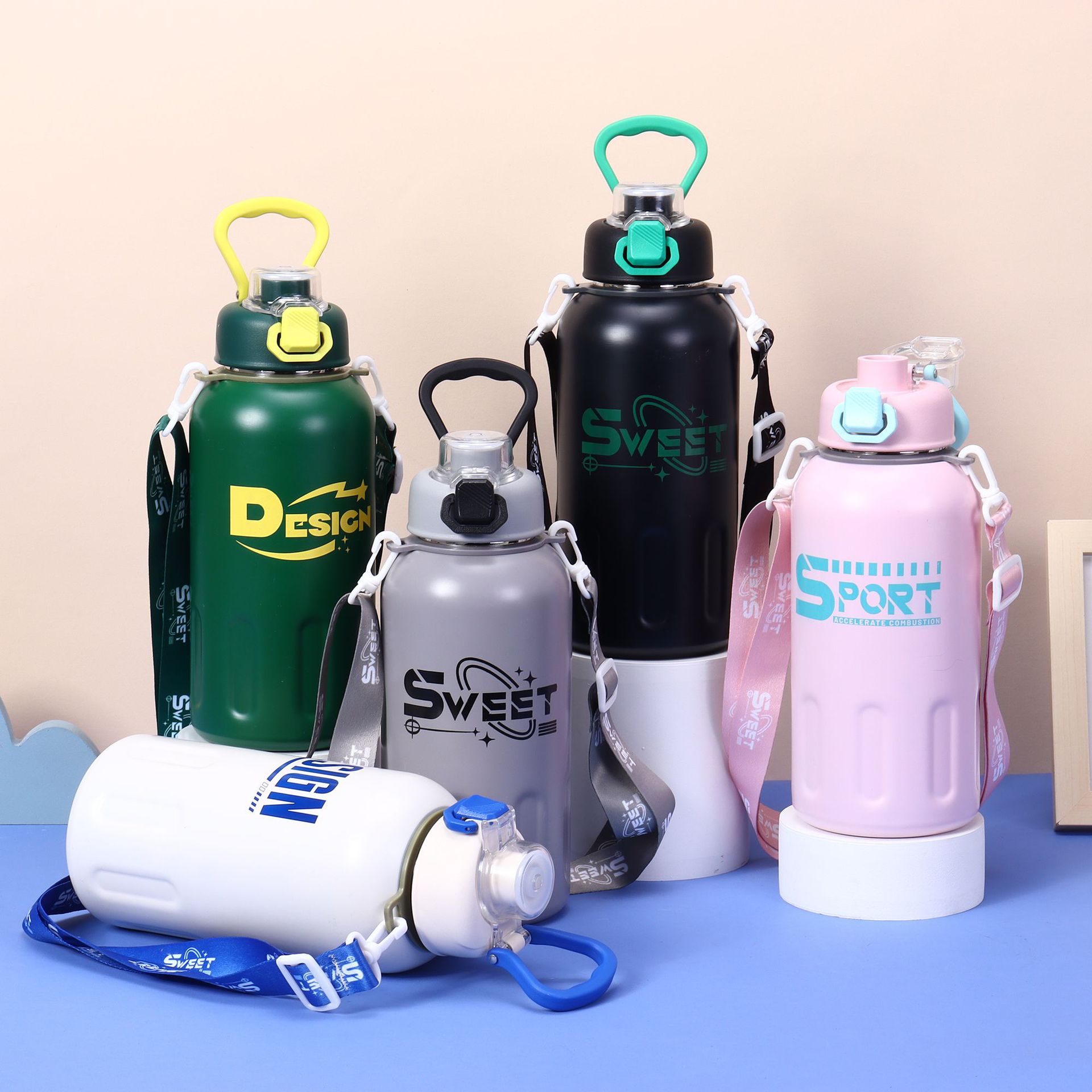 높은 색상 가치 새로운 스테인레스 스틸 보온병 컵 패션 진공 더블 마시는 핸들 컵 야외 휴대용 등산 물병