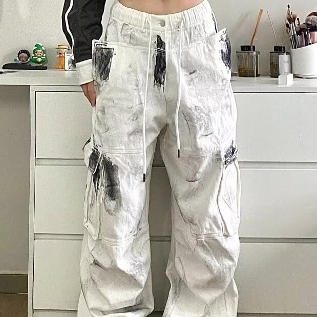 미국식 분위기 타이 염색 복고풍 멀티 포켓 드레스 청바지 남성과 여성의 하이 스트리트 느슨한 스트레이트 레그 드롭 오프 바지스토어 가기