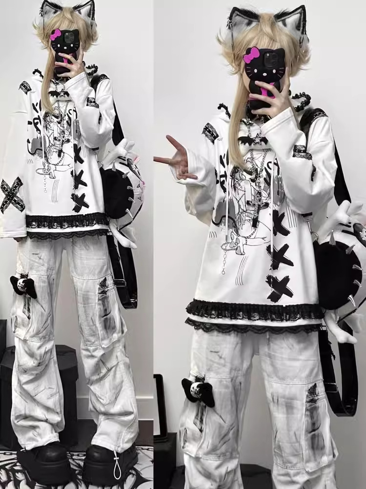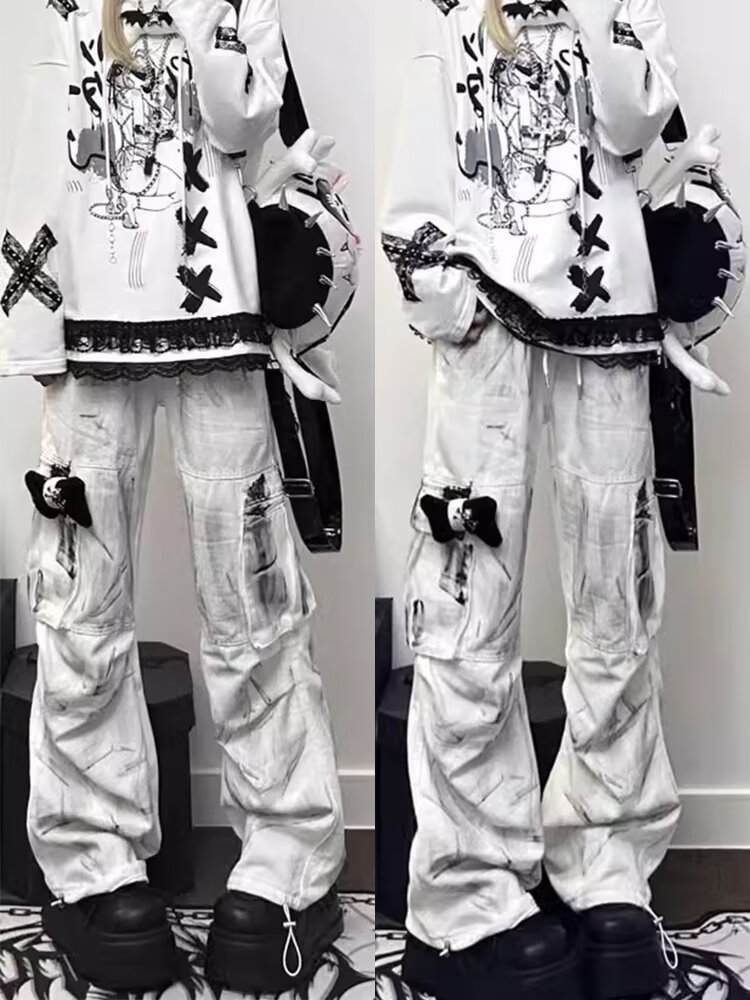 미국식 분위기 타이 염색 복고풍 멀티 포켓 드레스 청바지 남성과 여성의 하이 스트리트 느슨한 스트레이트 레그 드롭 오프 바지