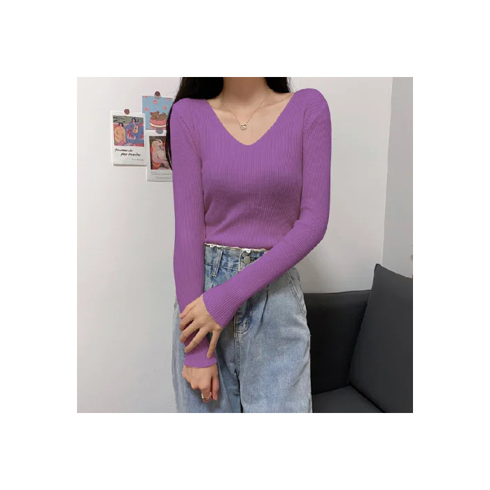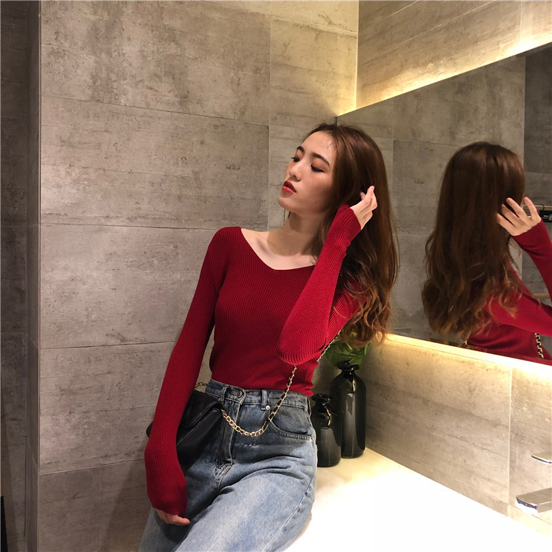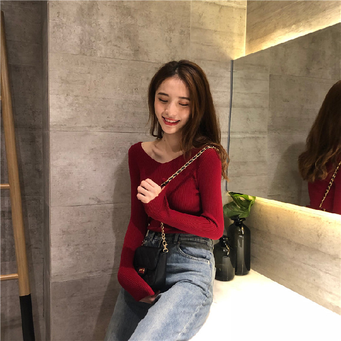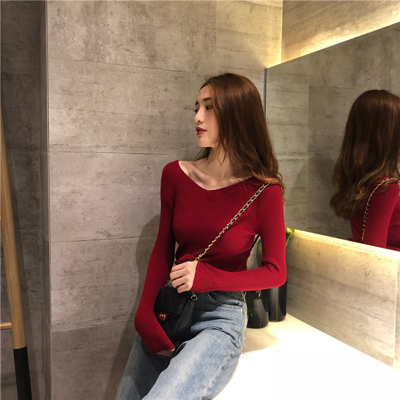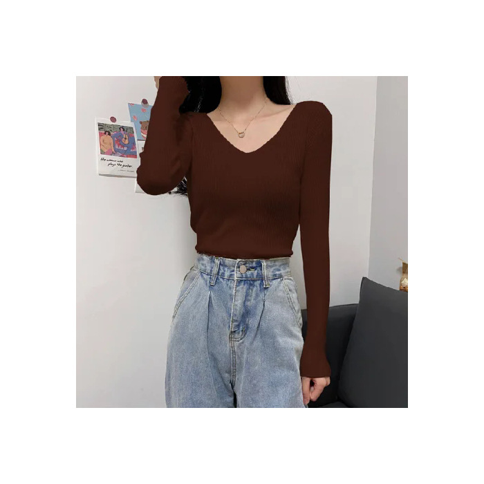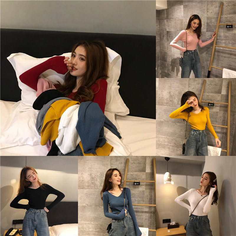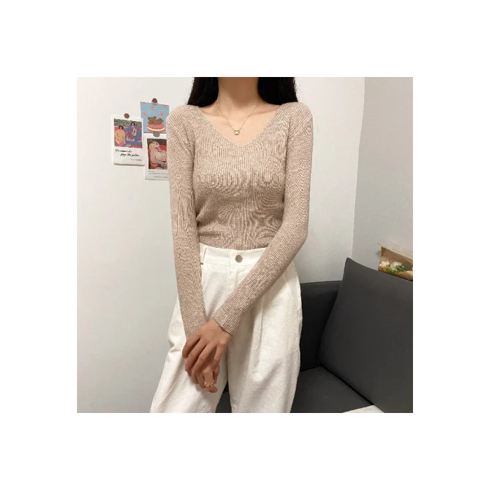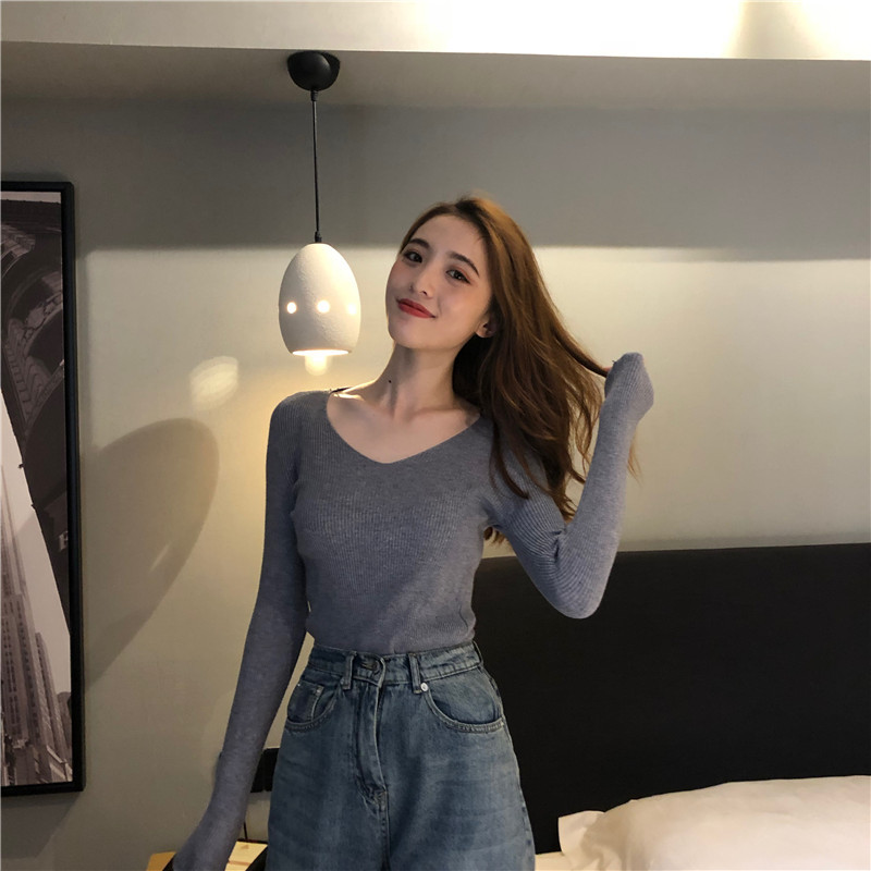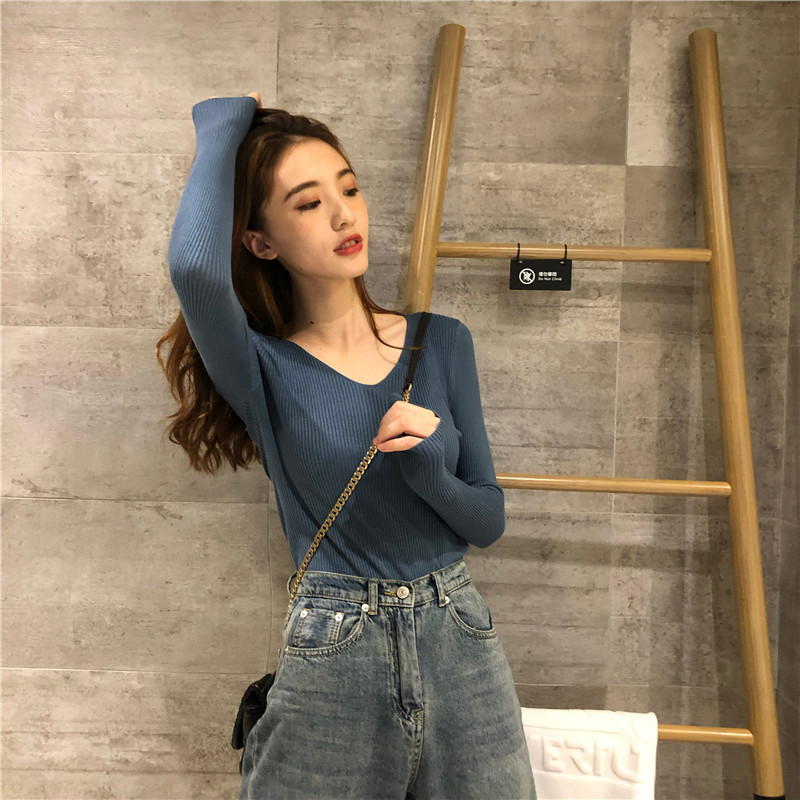 베이스 셔츠 여자 내부 2024 새로운 서양식 슬림 핏 봄과 가을 올 매치 V 넥 스웨터 타이트 니트 탑스토어 가기