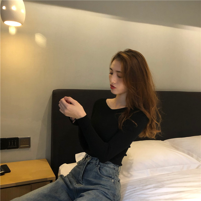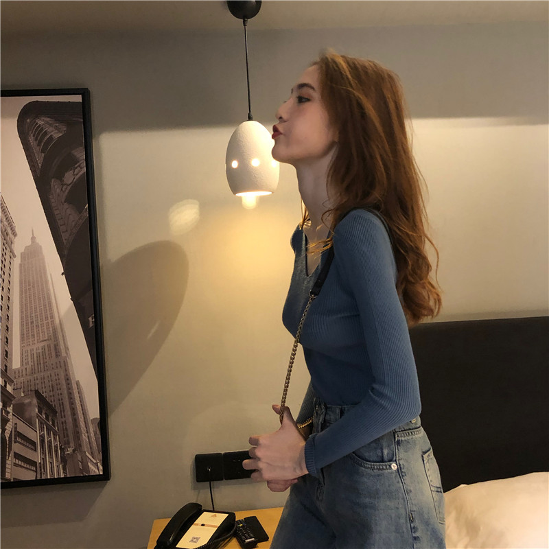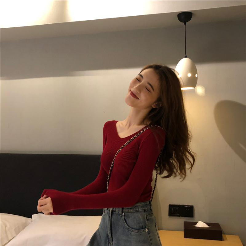베이스 셔츠 여자 내부 2024 새로운 서양식 슬림 핏 봄과 가을 올 매치 V 넥 스웨터 타이트 니트 탑