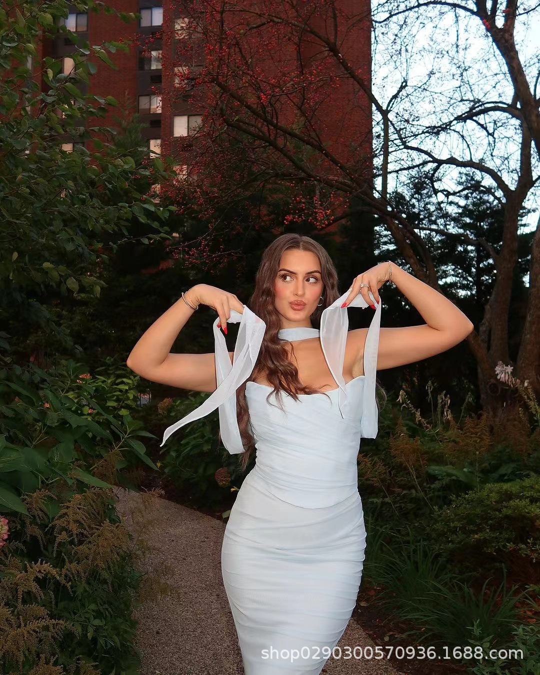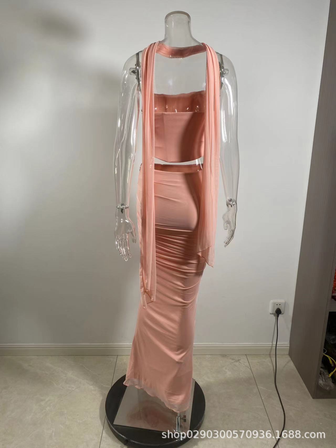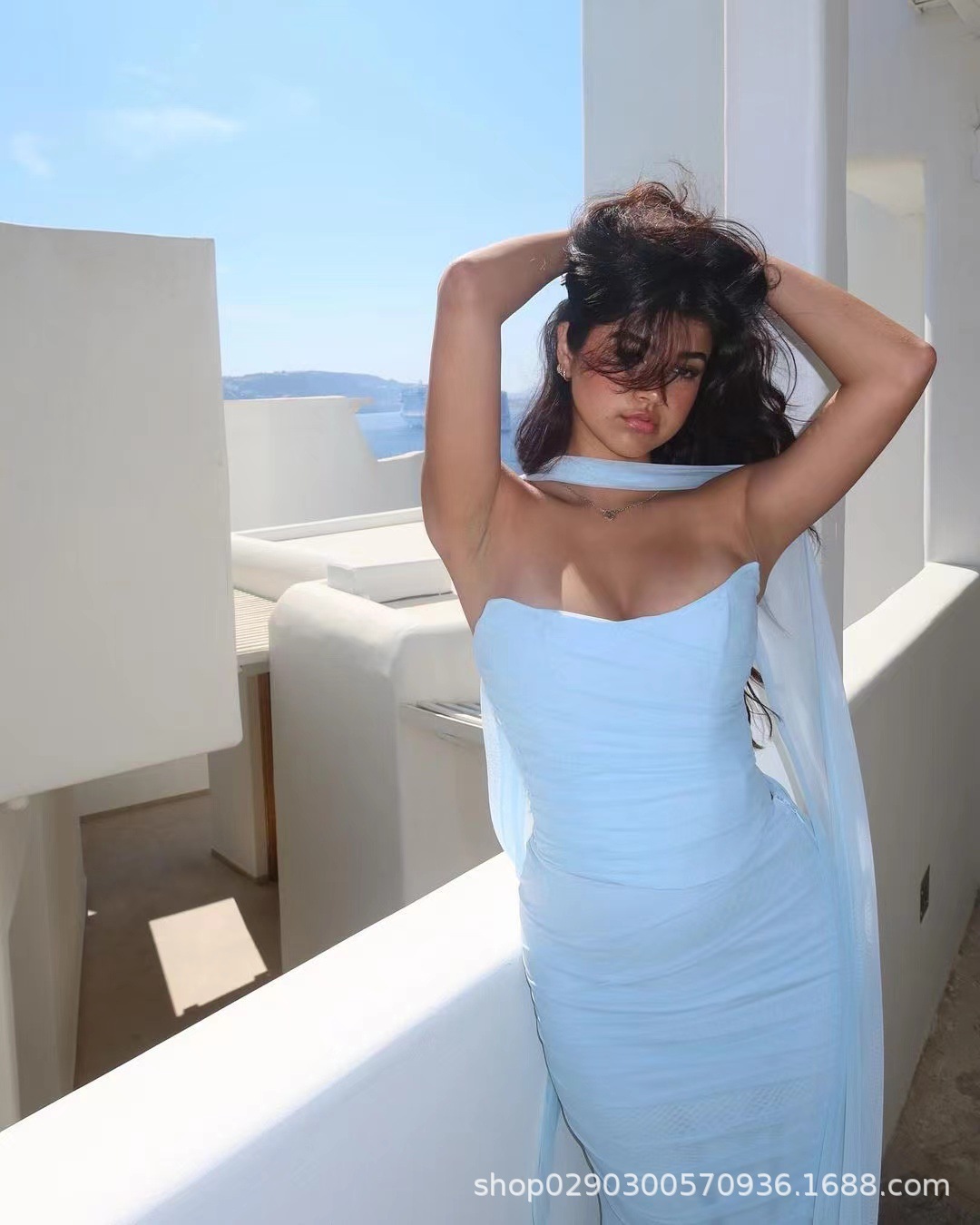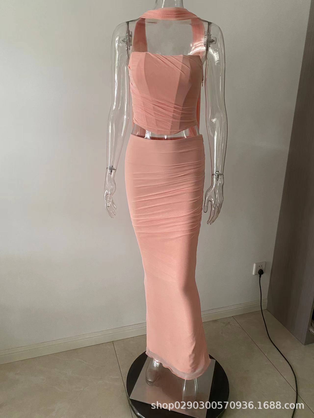 유럽과 미국 스타일의 여성 가을 새로운 스타일의 기질 하늘색 튜브 상단/높은 허리 오버 스커트 세트 타이트한 원피스스토어 가기