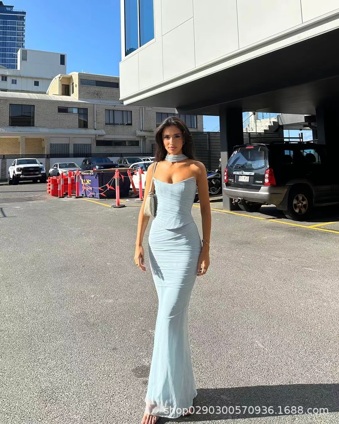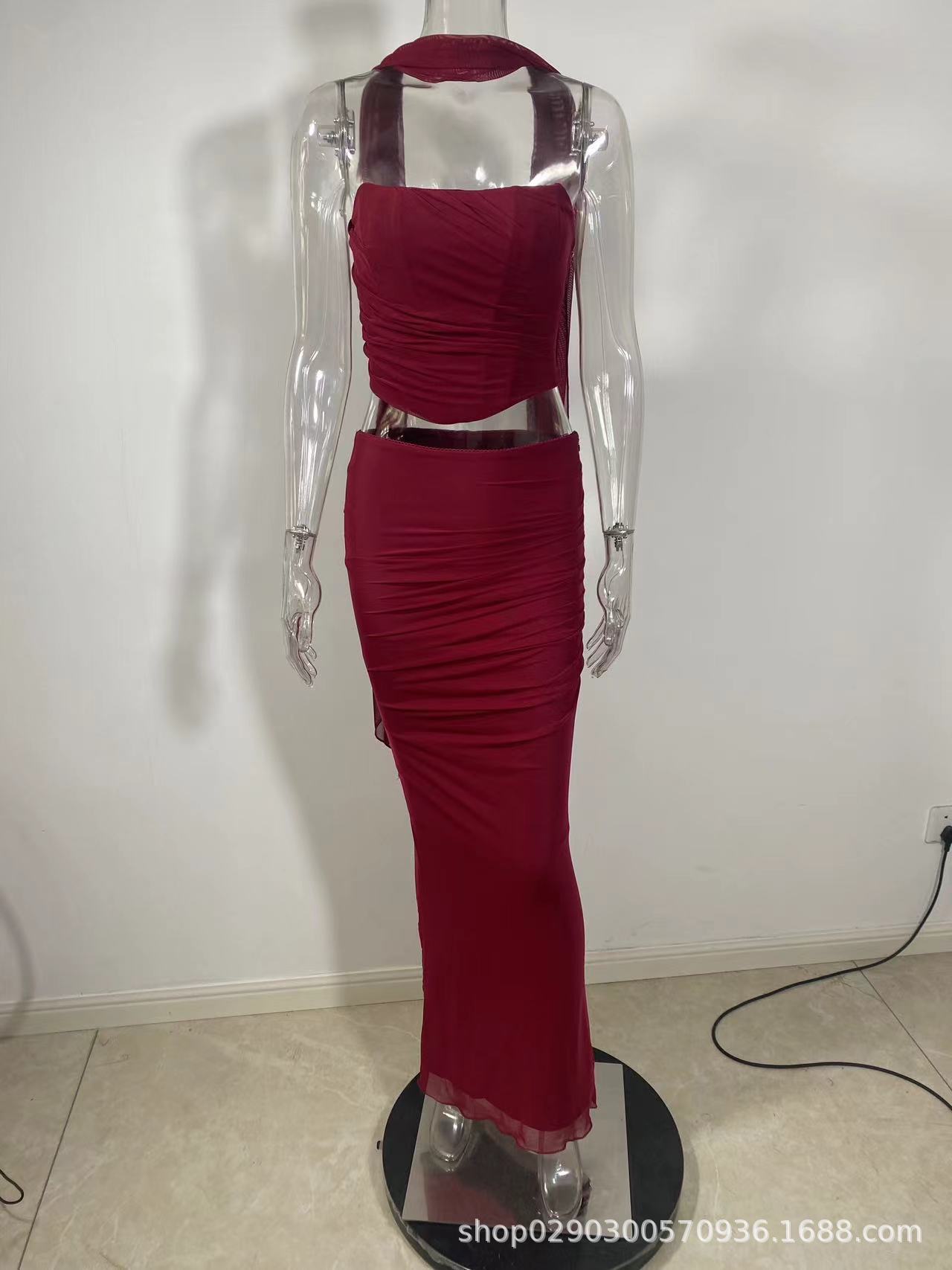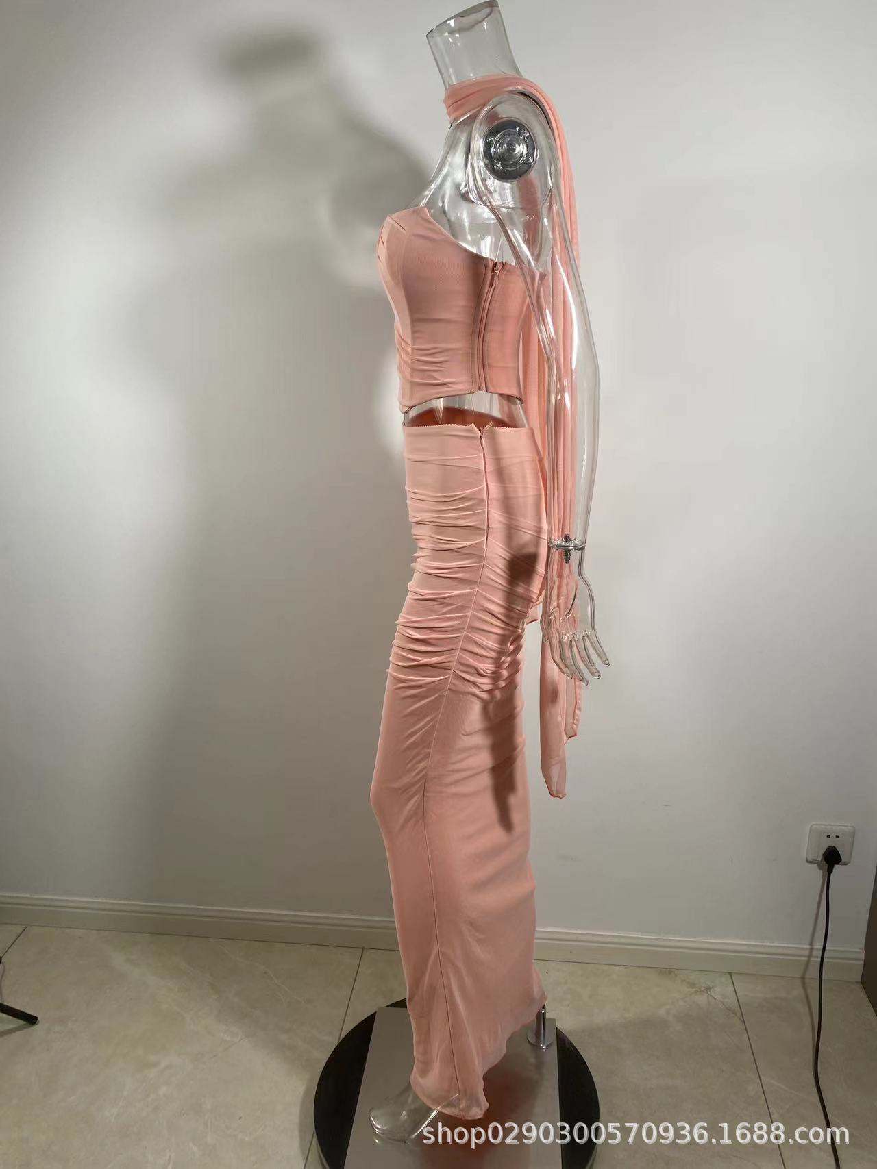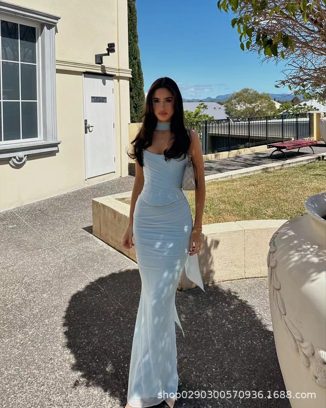 유럽과 미국 스타일의 여성 가을 새로운 스타일의 기질 하늘색 튜브 상단/높은 허리 오버 스커트 세트 타이트한 원피스스토어 가기