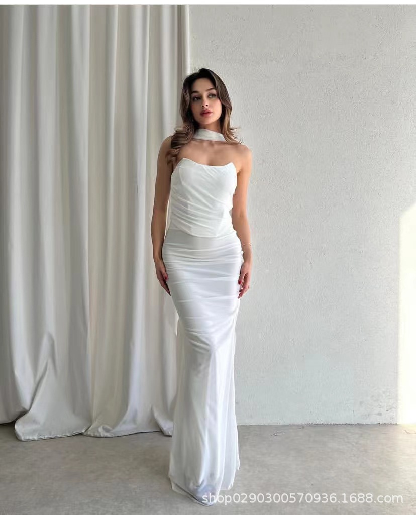 유럽과 미국 스타일의 여성 가을 새로운 스타일의 기질 하늘색 튜브 상단/높은 허리 오버 스커트 세트 타이트한 원피스
