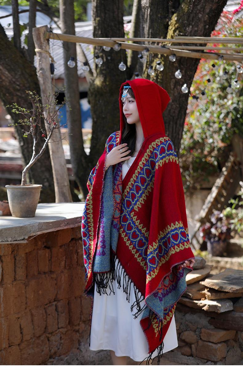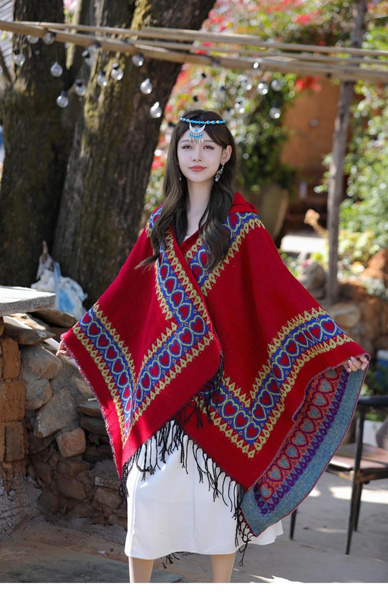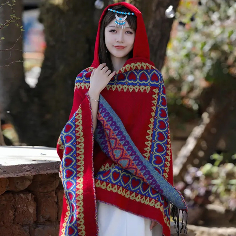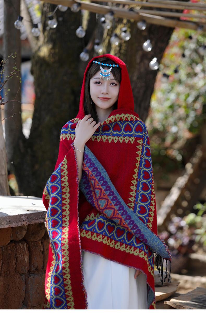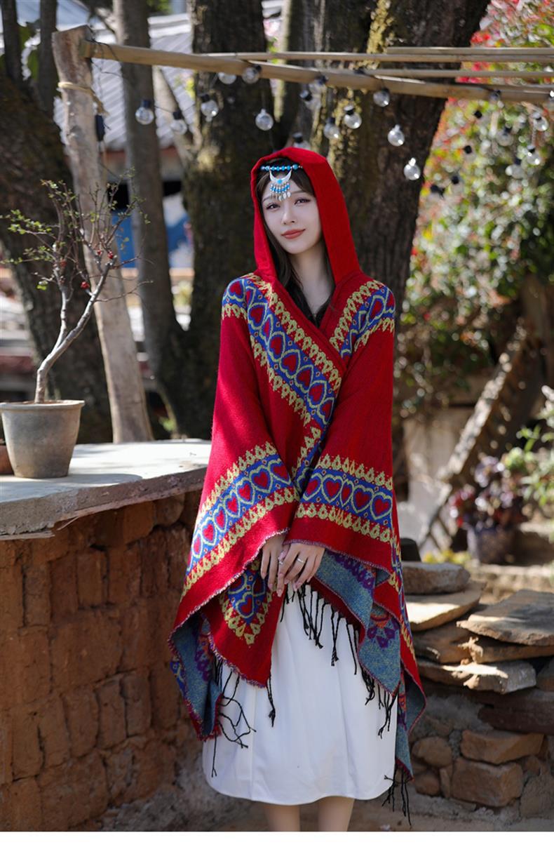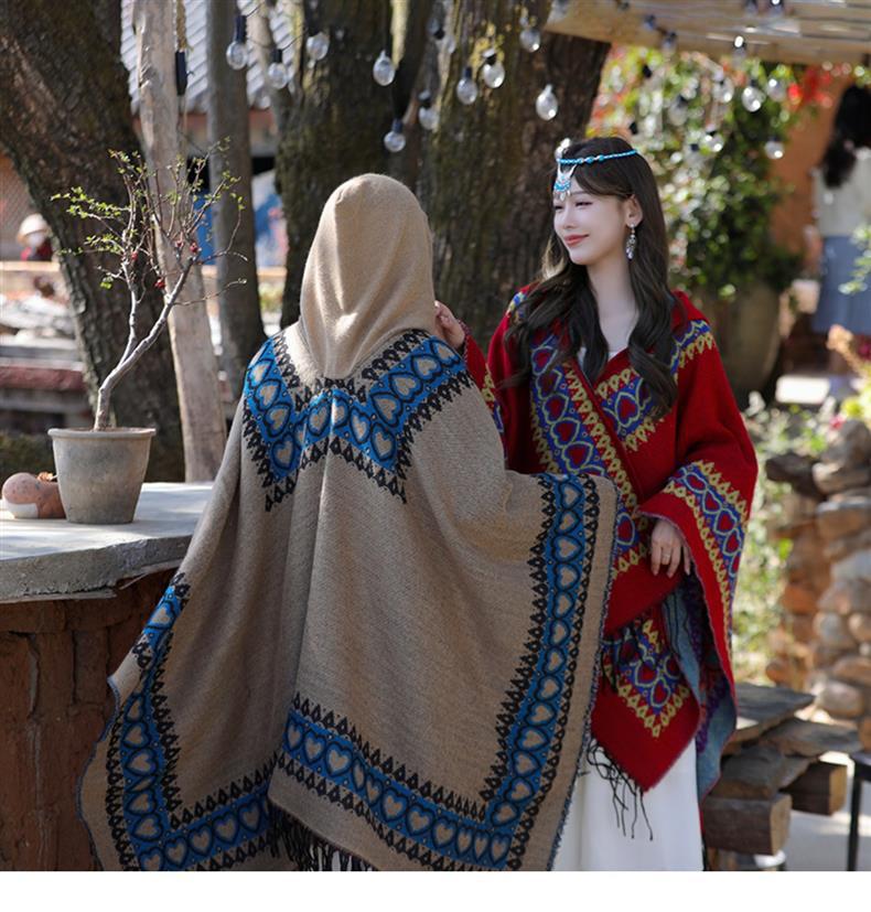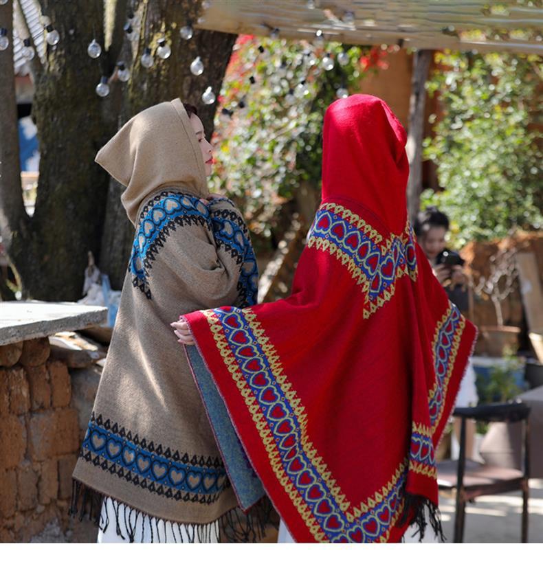 붉은 민족 스타일 스카프 두꺼운 따뜻한 목도리 여성 여행 복장 윈난 신장 티베트 케이프 후드 망토스토어 가기