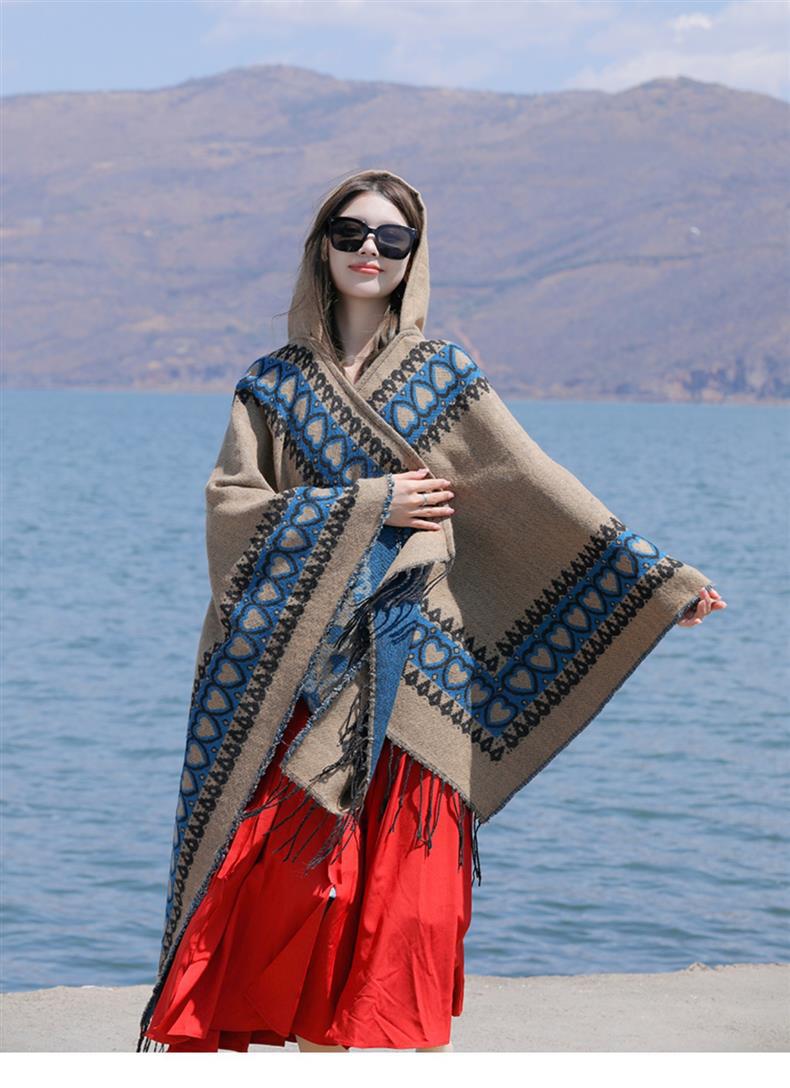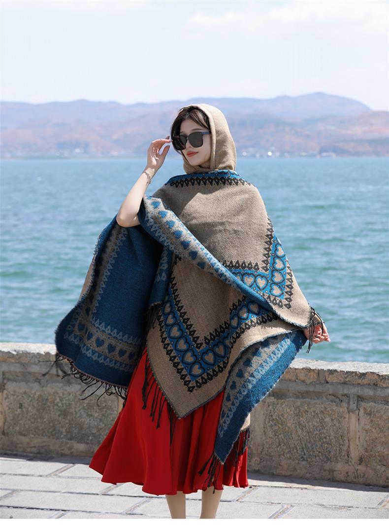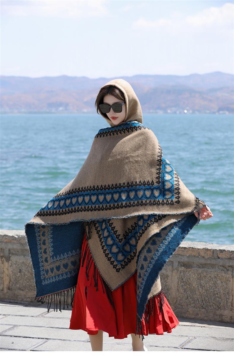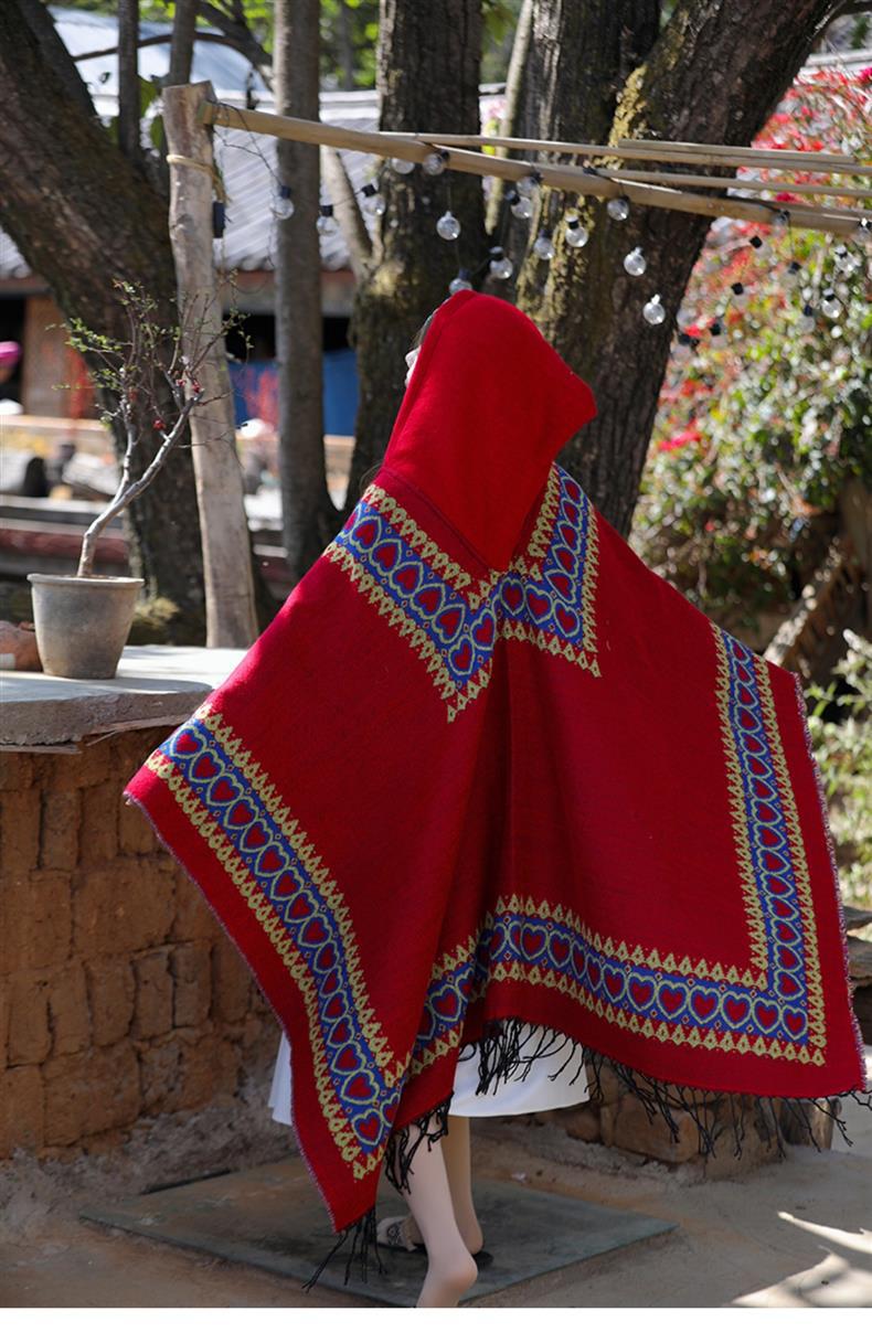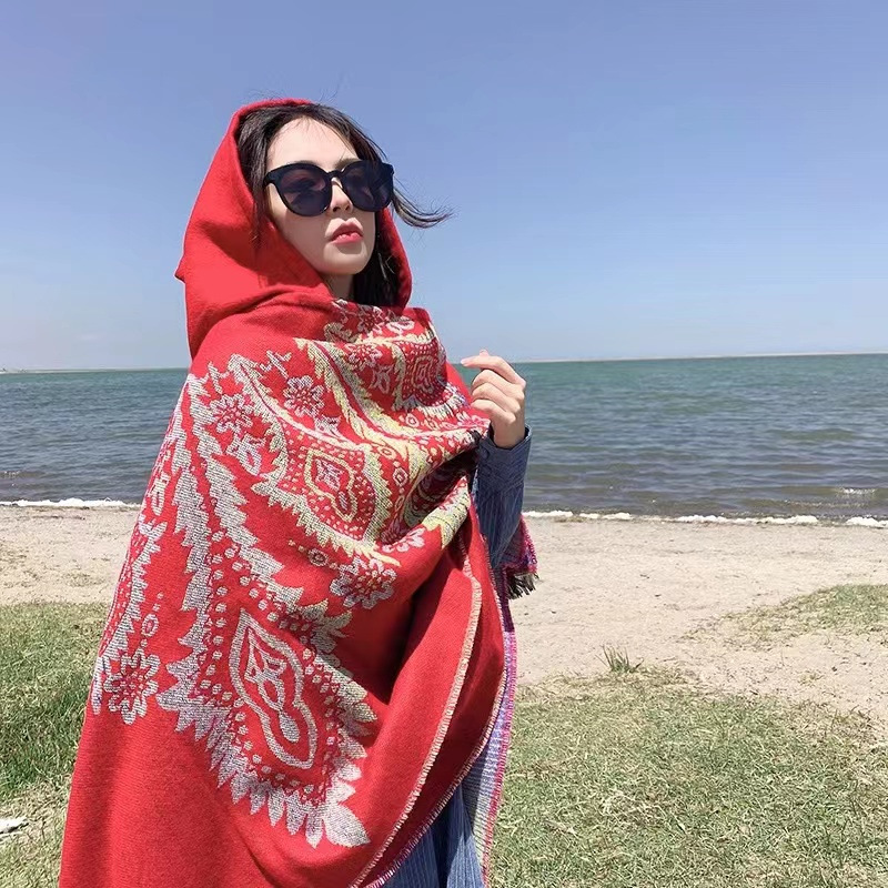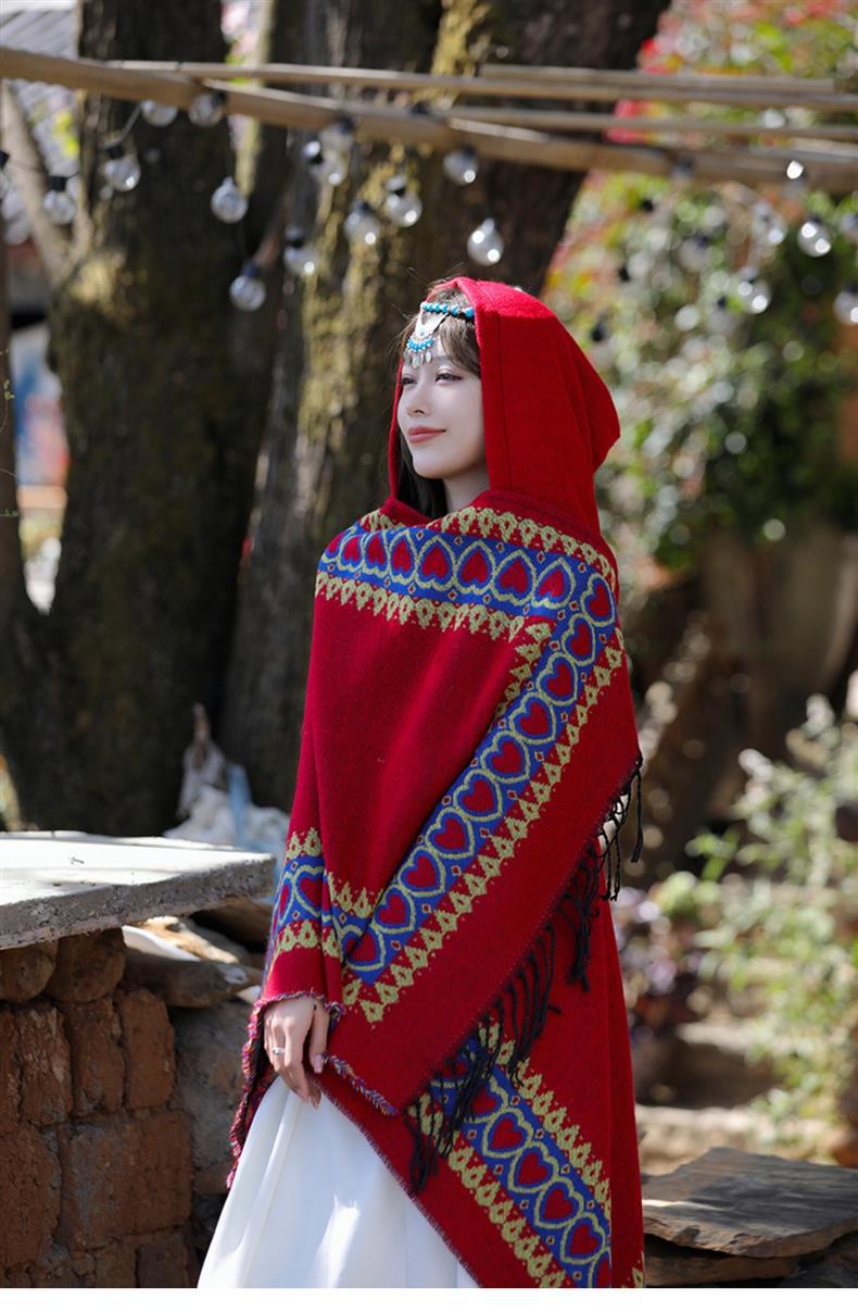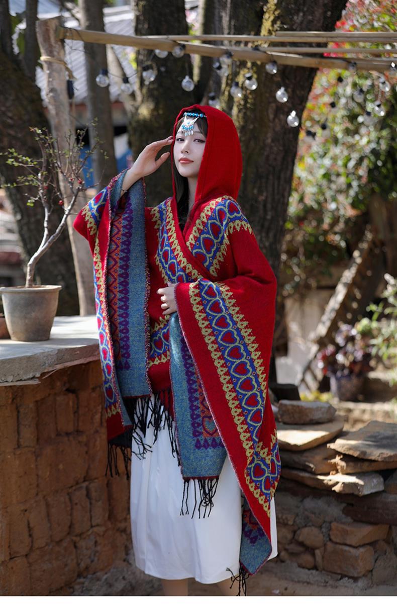 붉은 민족 스타일 스카프 두꺼운 따뜻한 목도리 여성 여행 복장 윈난 신장 티베트 케이프 후드 망토스토어 가기