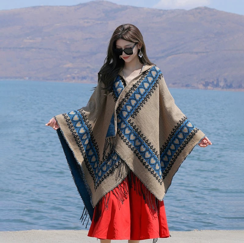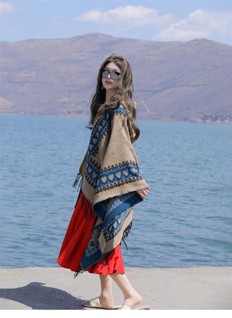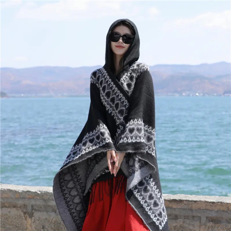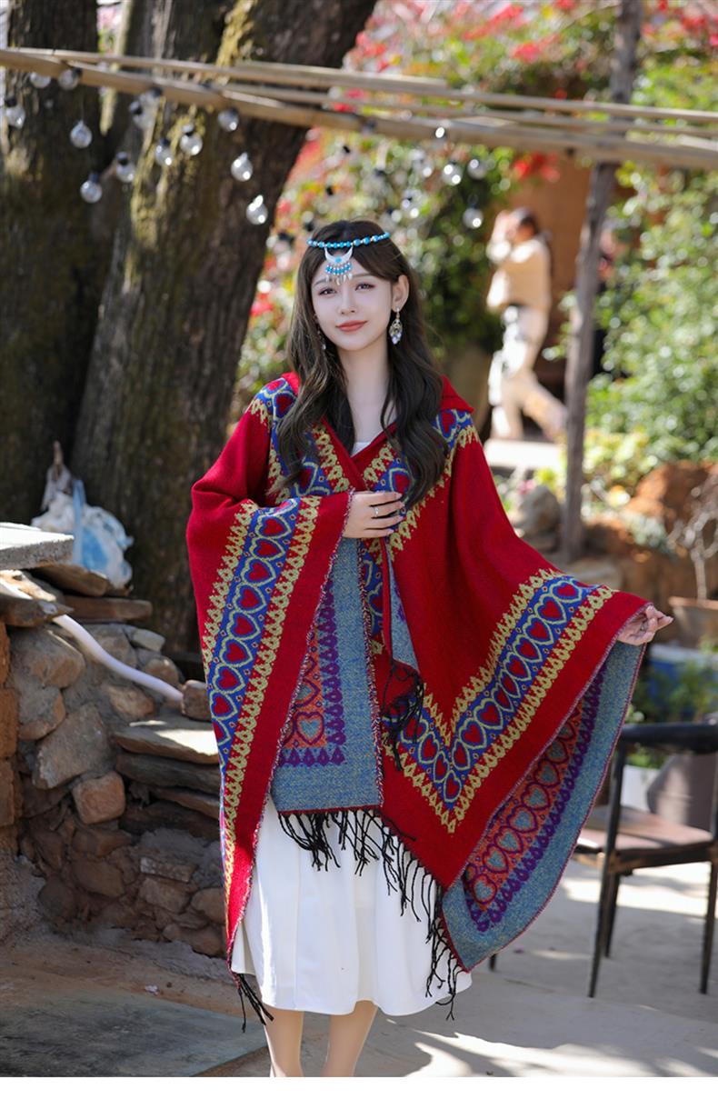 붉은 민족 스타일 스카프 두꺼운 따뜻한 목도리 여성 여행 복장 윈난 신장 티베트 케이프 후드 망토