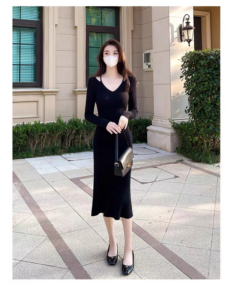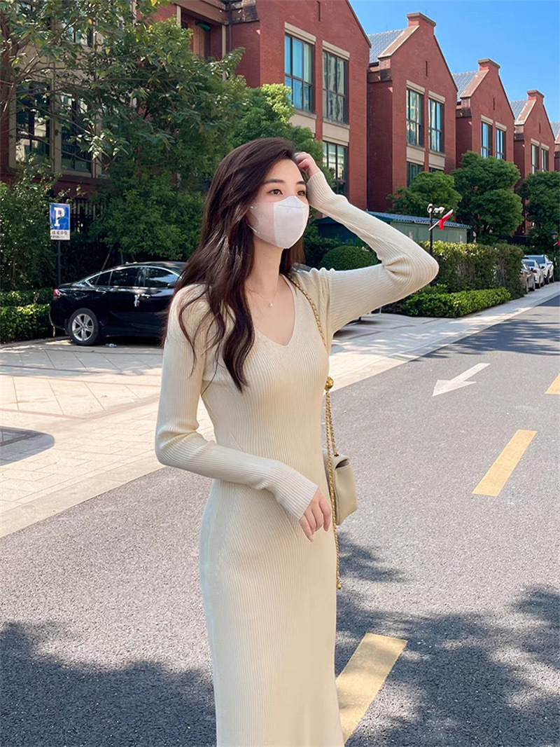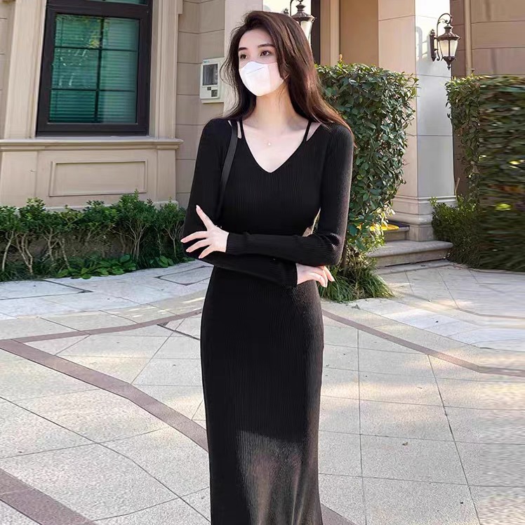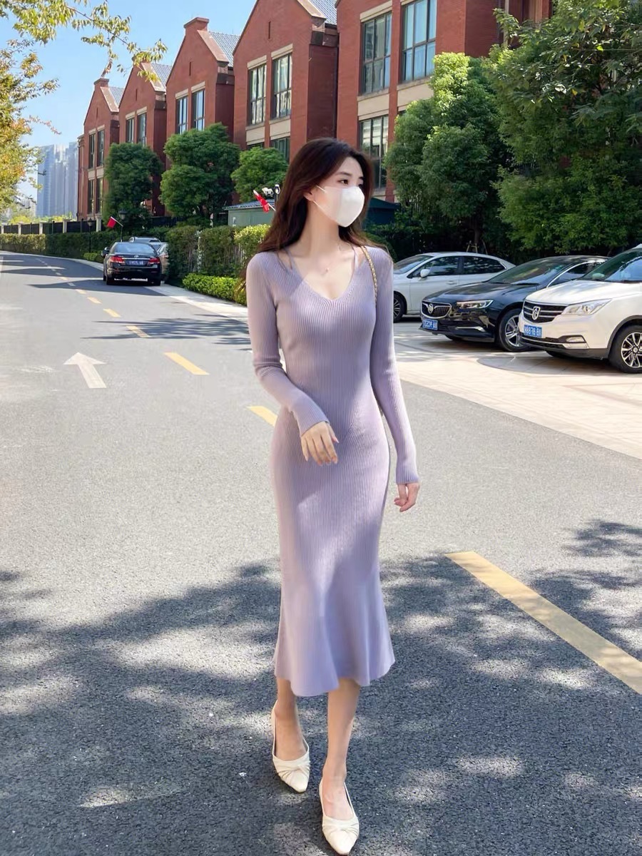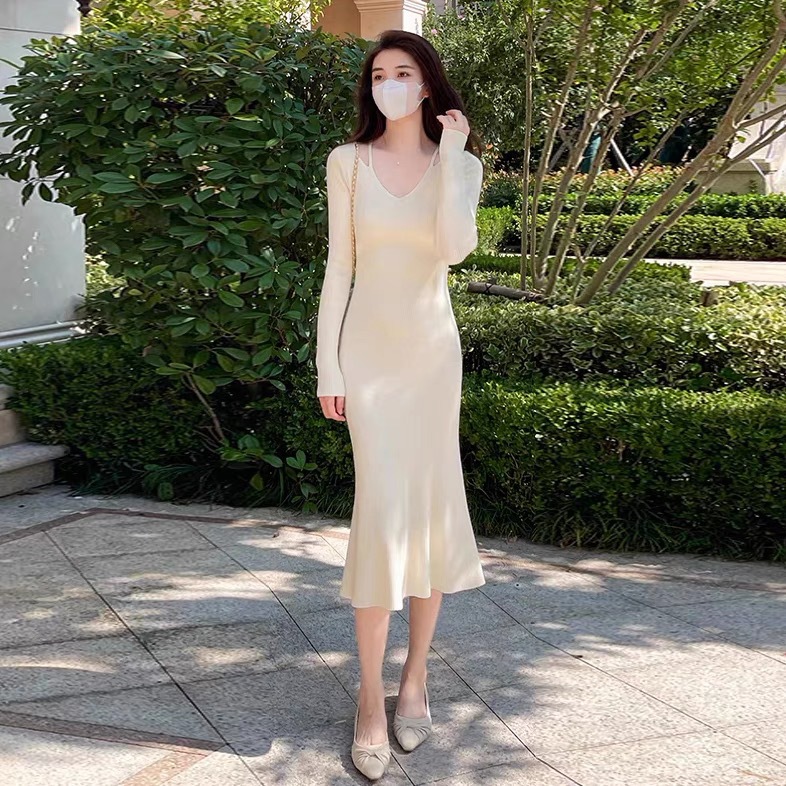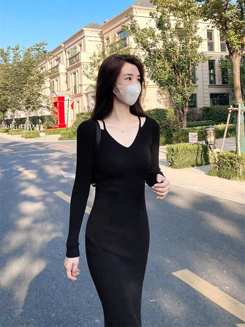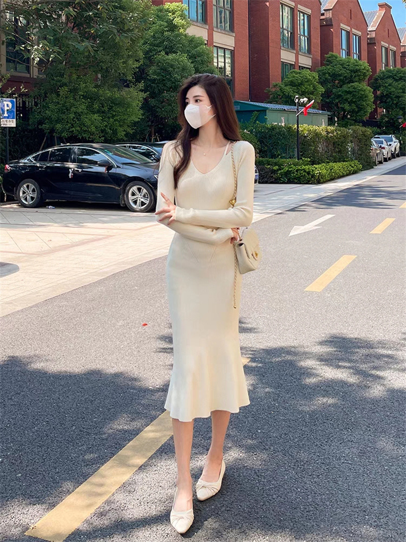니트 원피스 가을 밀크 부 서스펜더 연예인 올 매치 젠틀 우아한 슬림 핏 스웨터 V 넥 힙합 스커트스토어 가기