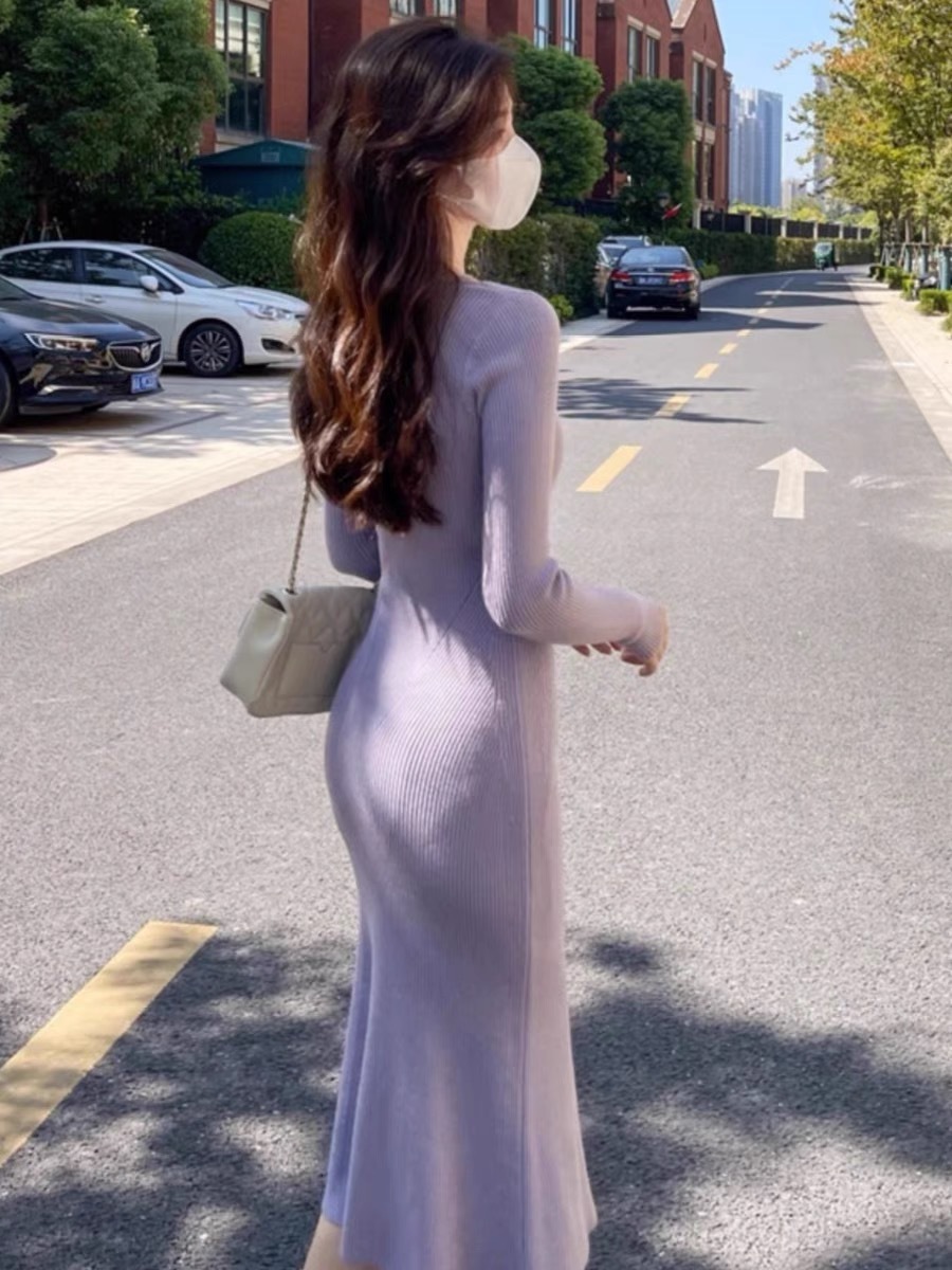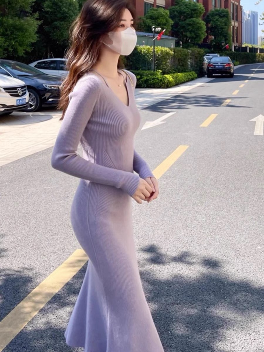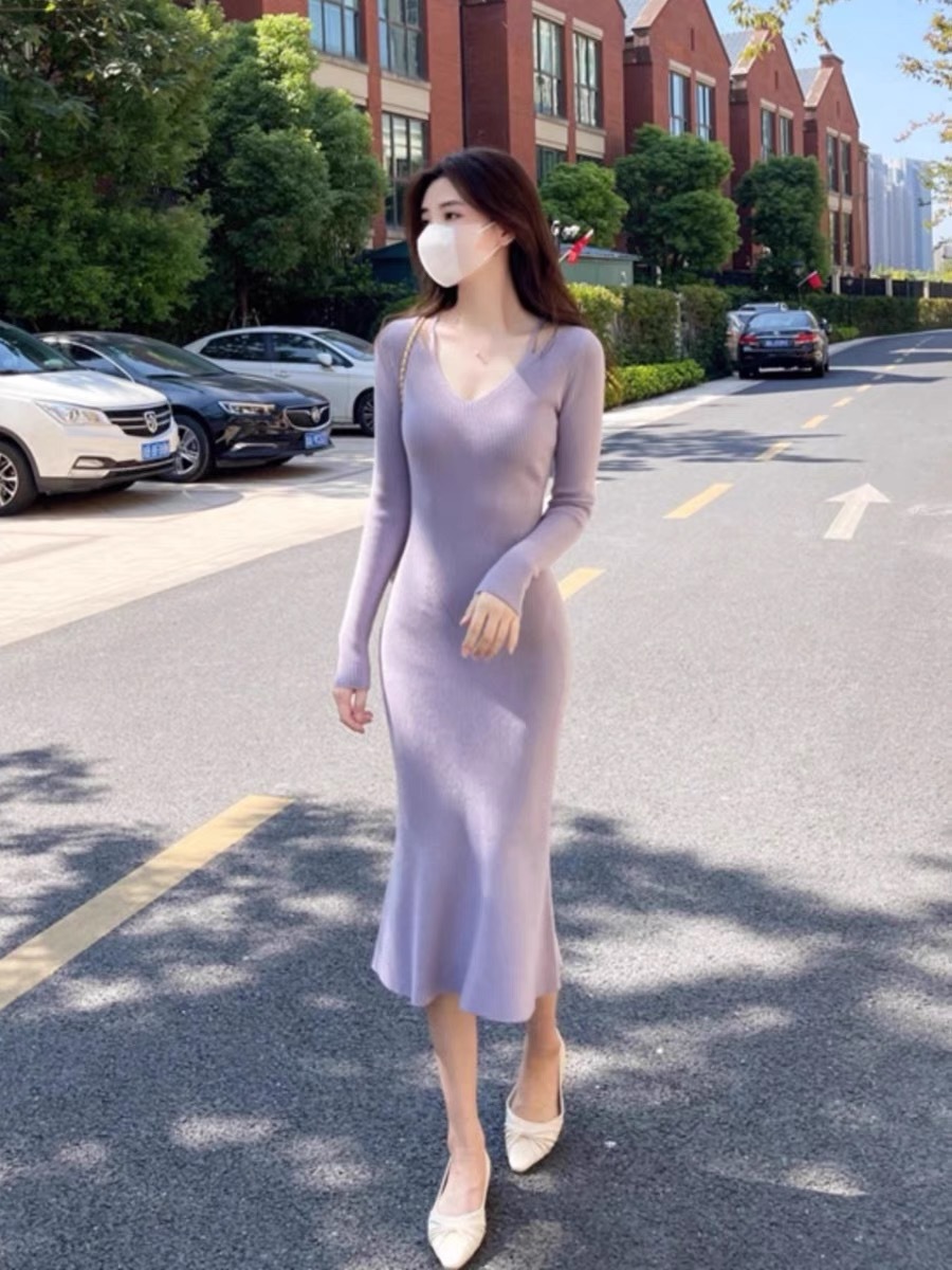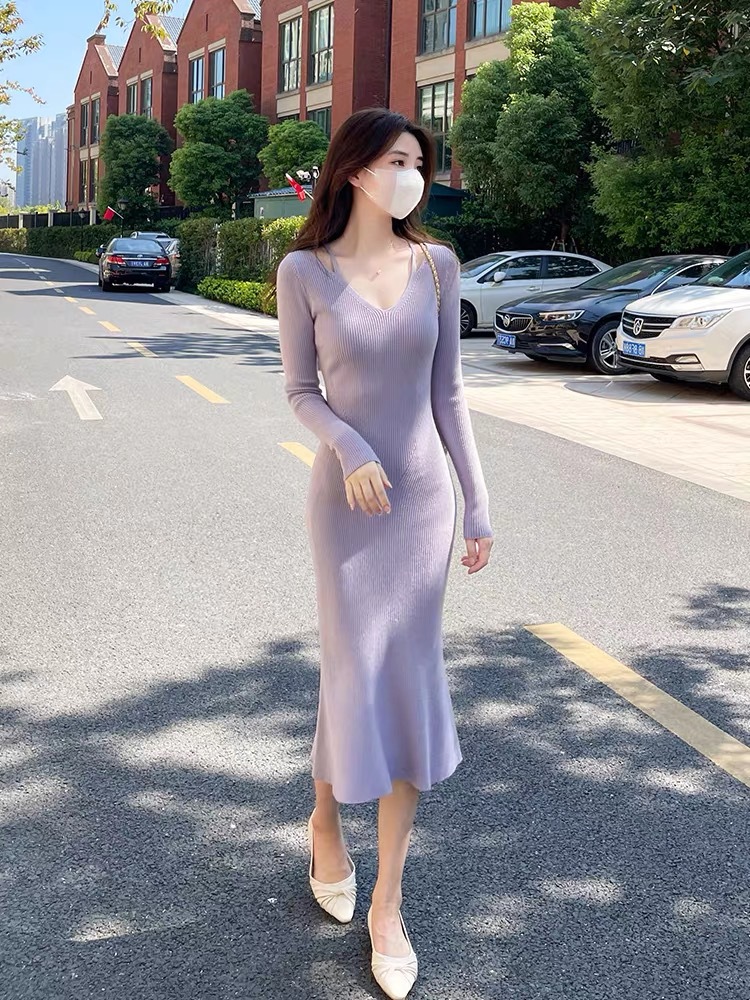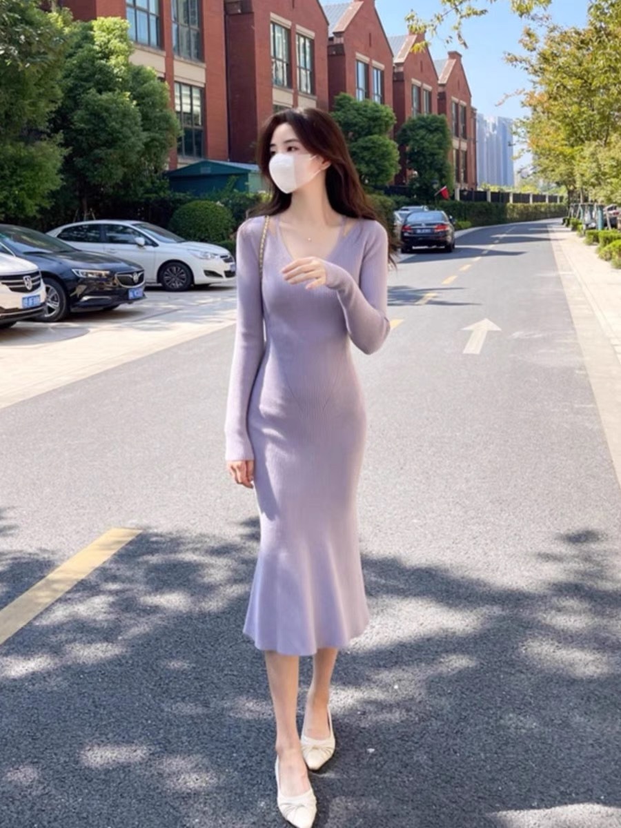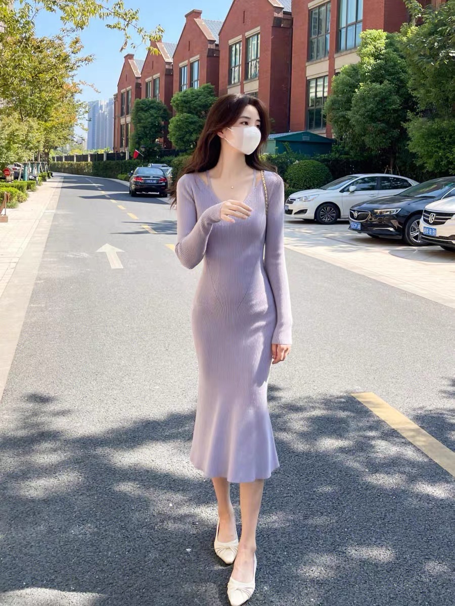 니트 원피스 가을 밀크 부 서스펜더 연예인 올 매치 젠틀 우아한 슬림 핏 스웨터 V 넥 힙합 스커트스토어 가기