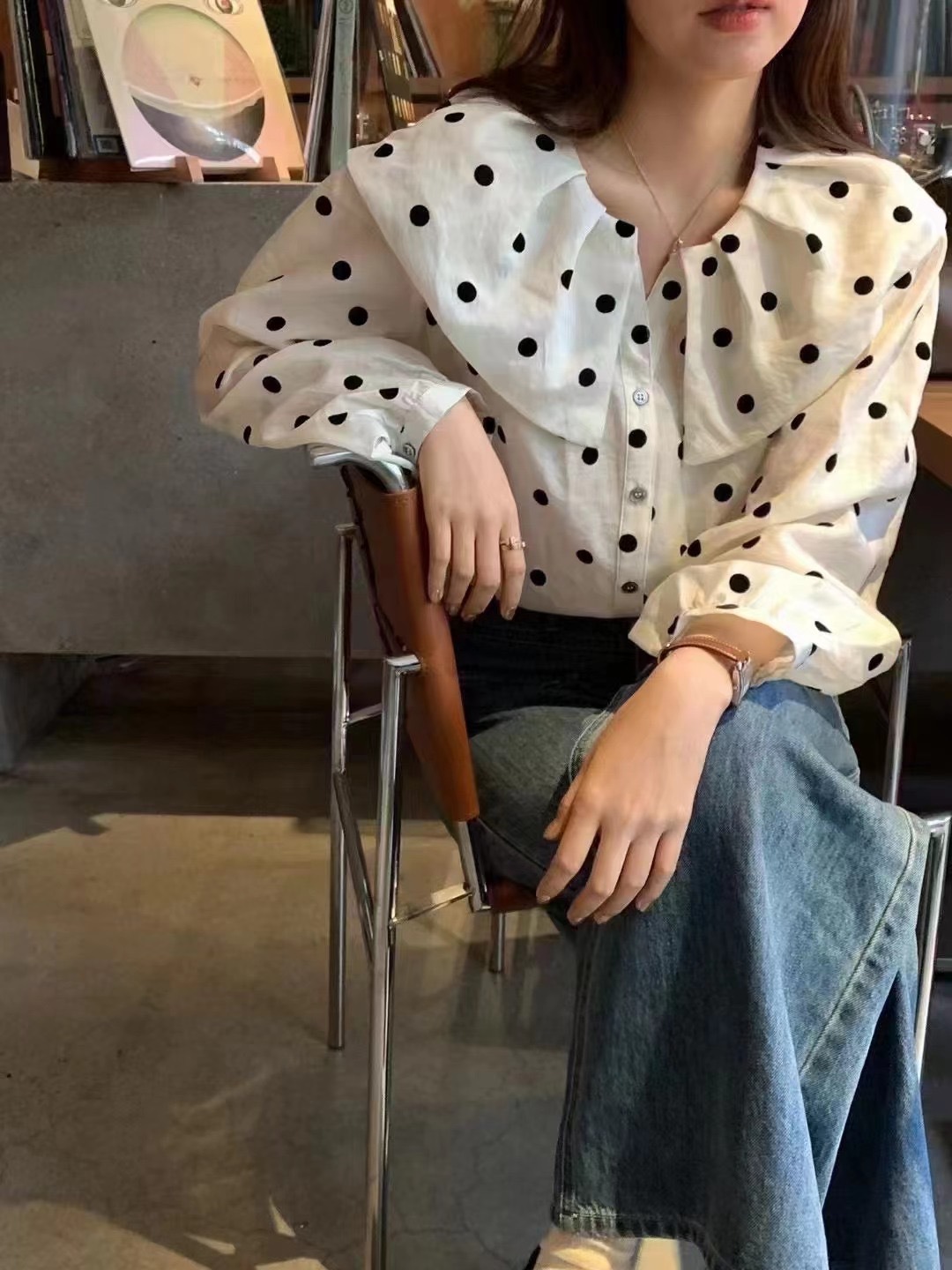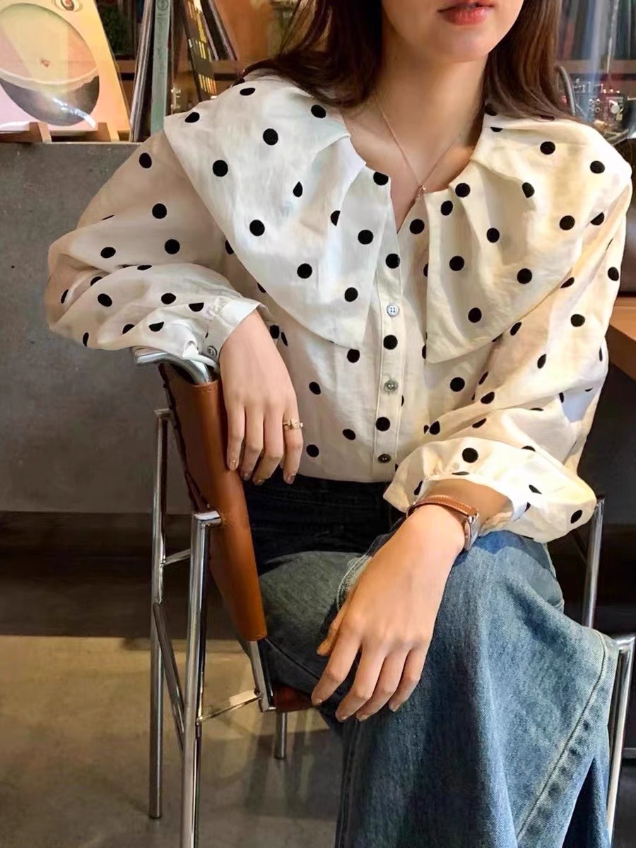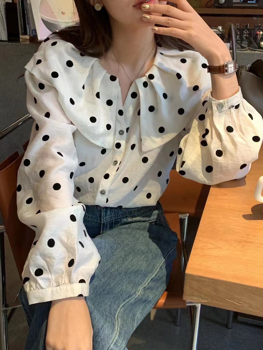 인형 칼라 긴팔 셔츠 여성의 2024 가을 새로운 한국 스타일 달콤한 스타일 콘트라스트 컬러 웨이브 싱글 브레스트 캐주얼 셔츠스토어 가기