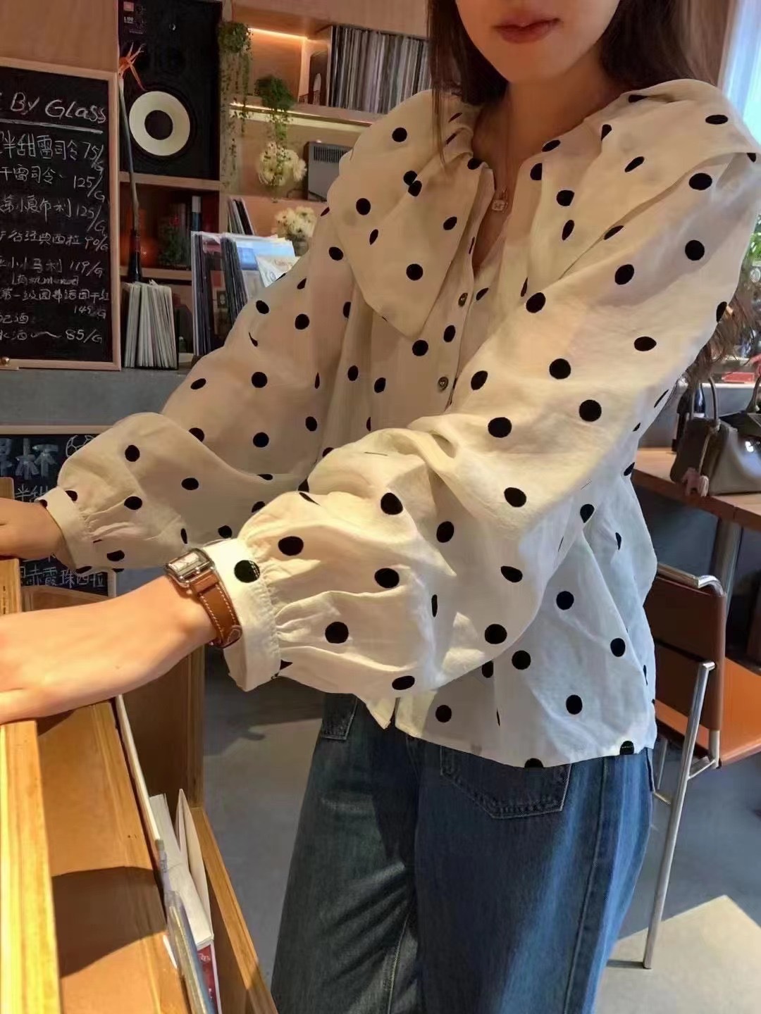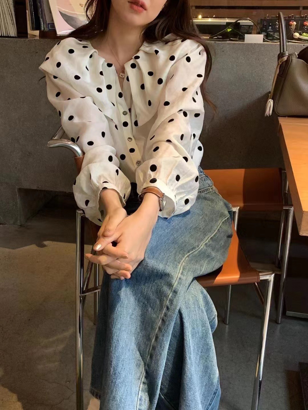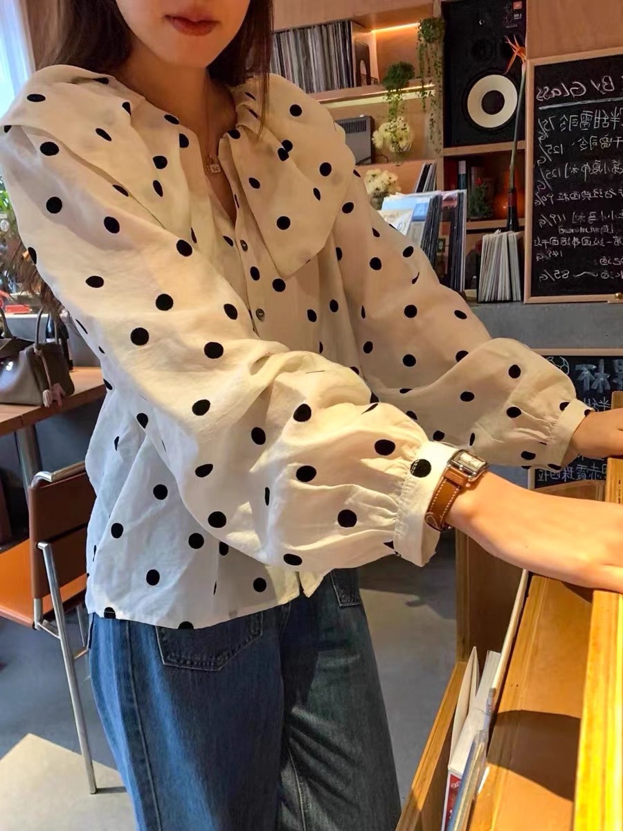 인형 칼라 긴팔 셔츠 여성의 2024 가을 새로운 한국 스타일 달콤한 스타일 콘트라스트 컬러 웨이브 싱글 브레스트 캐주얼 셔츠스토어 가기