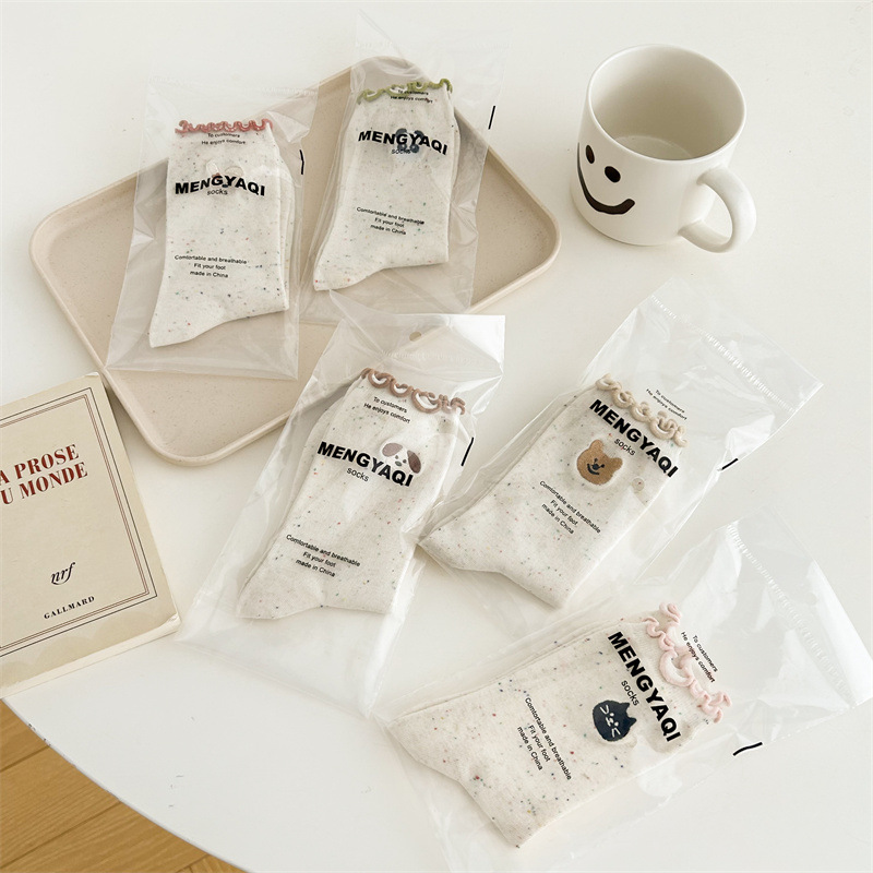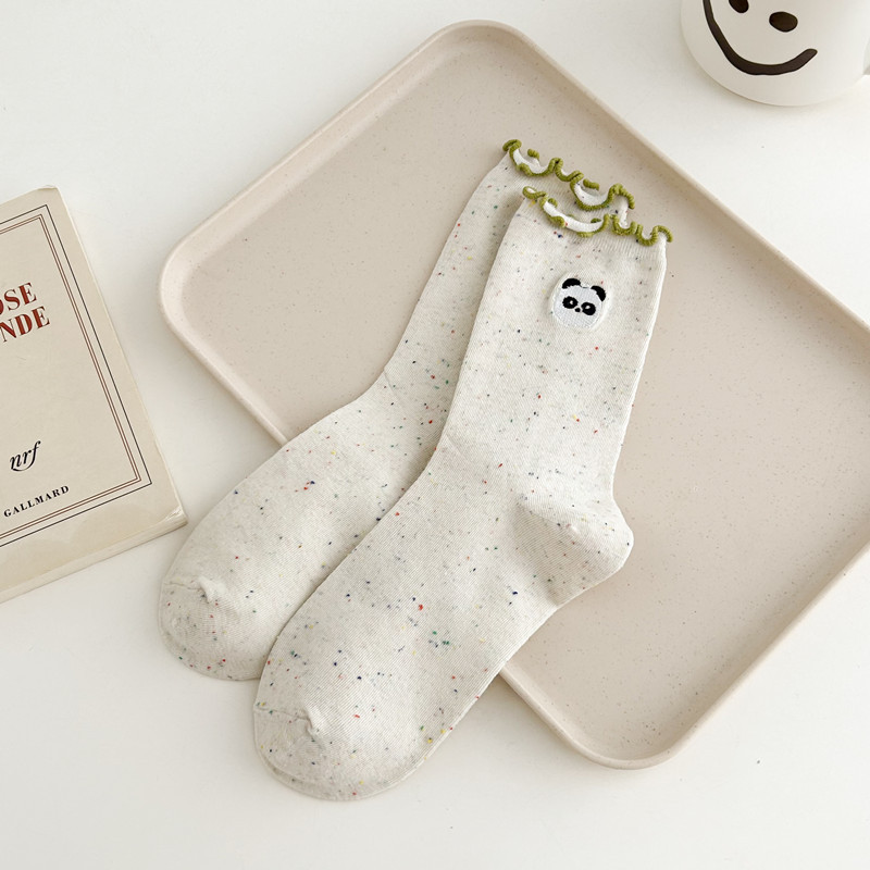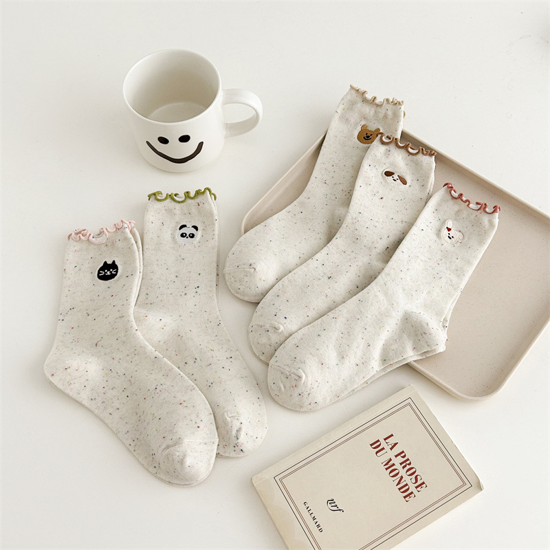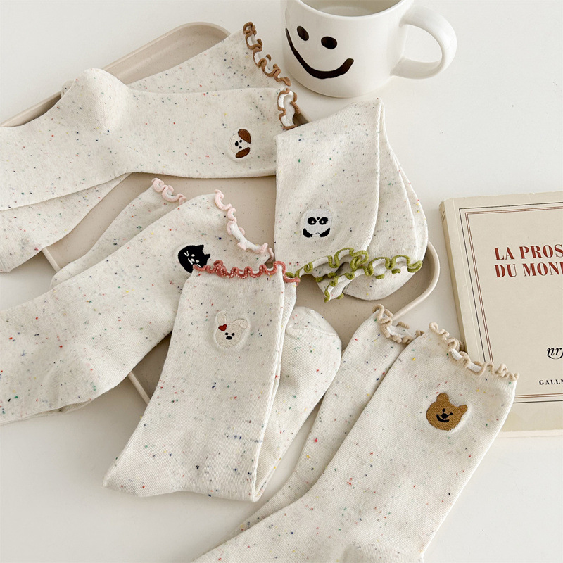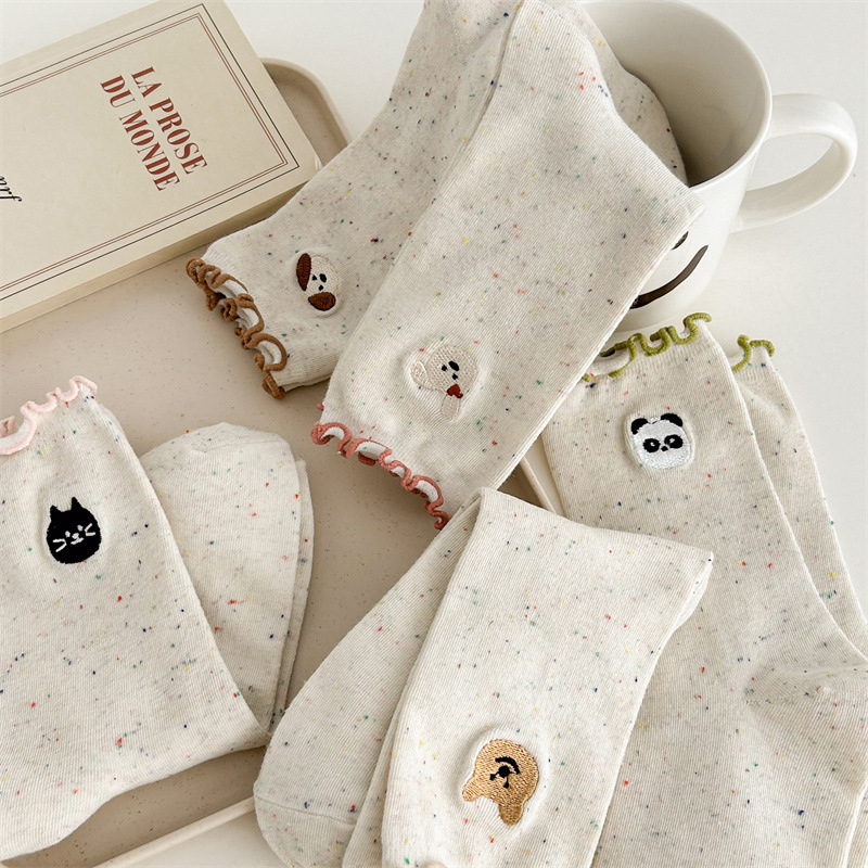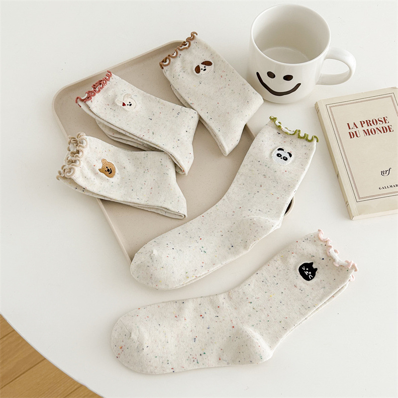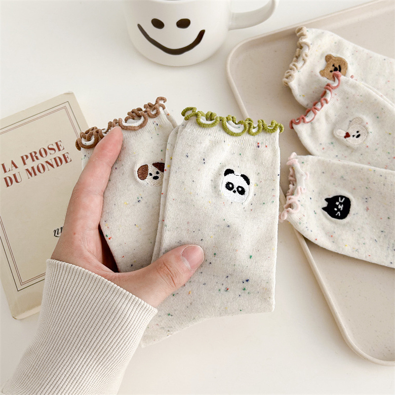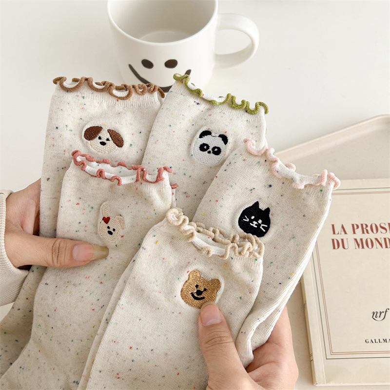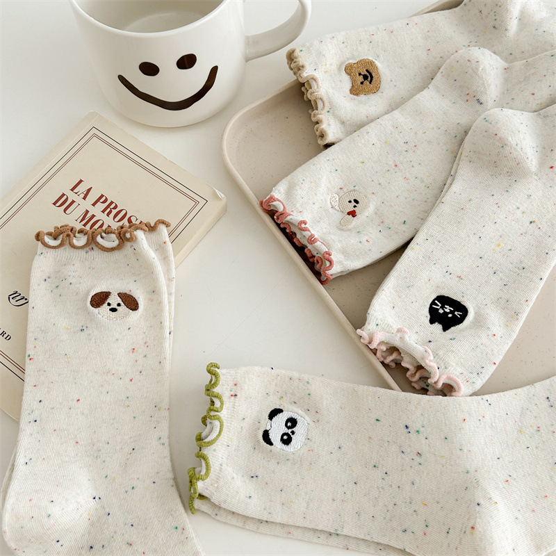 귀여운 레이스 양말 여성용 한국 강아지 중목 양말 도트무늬 레이스 트림 동물 자수 면 양말 롤업 양말