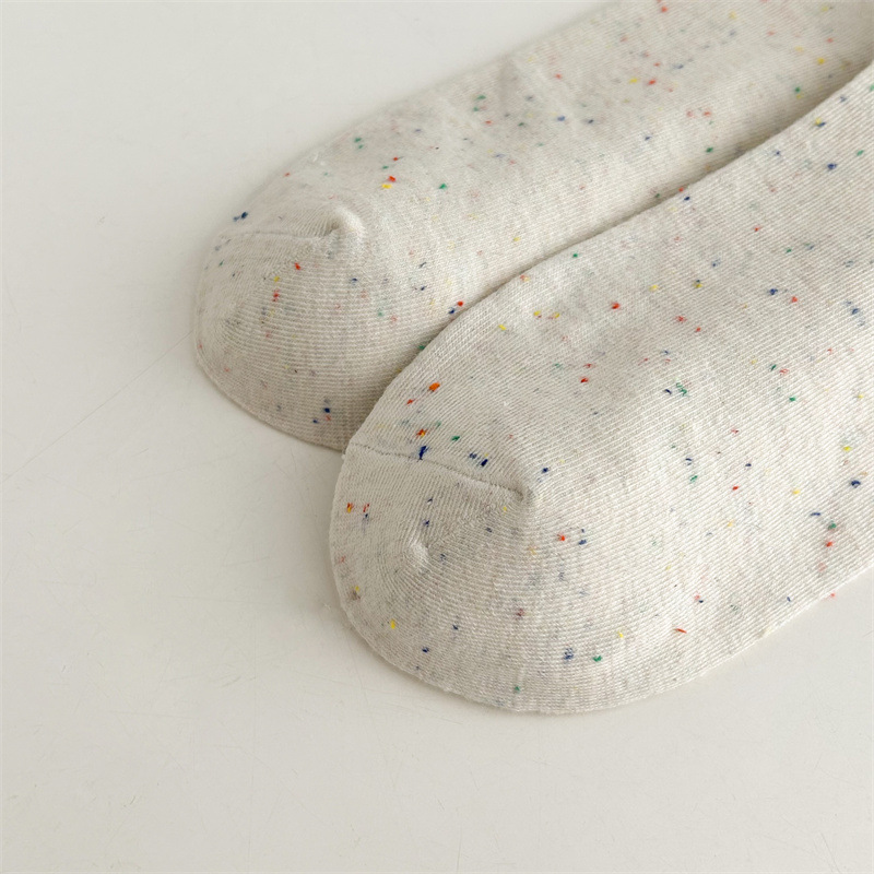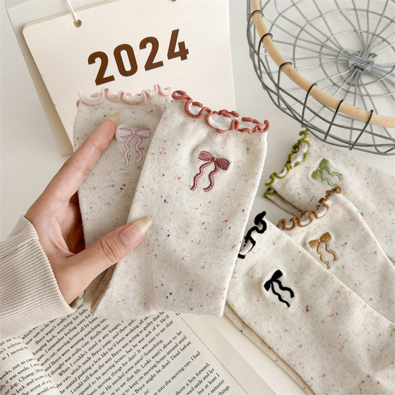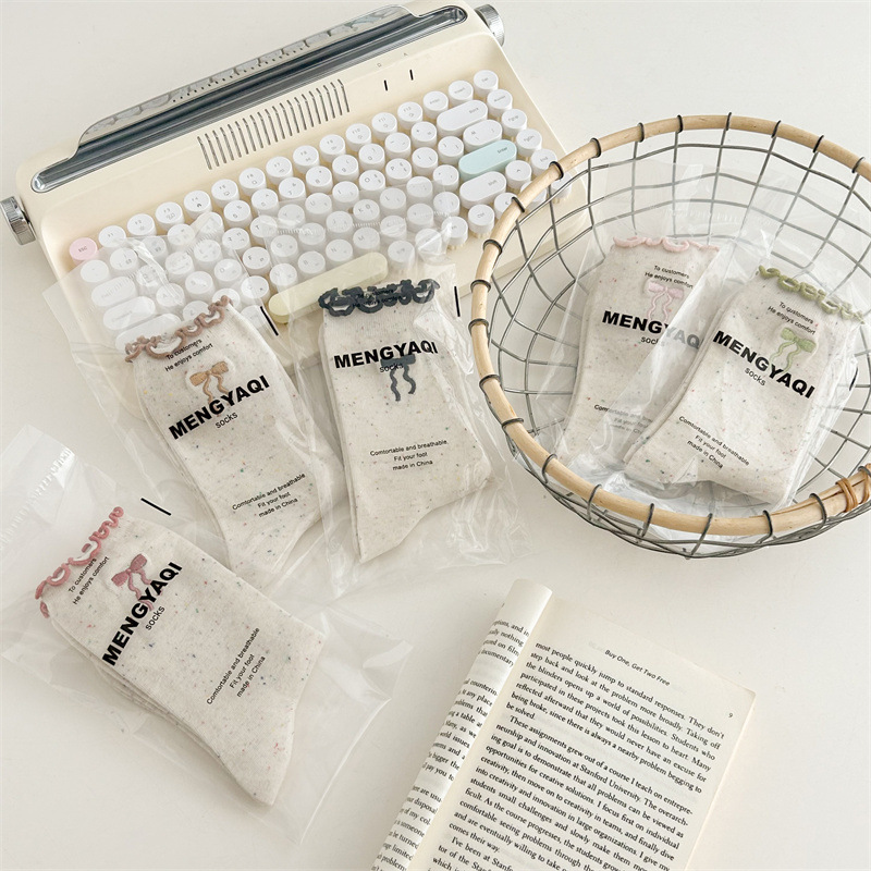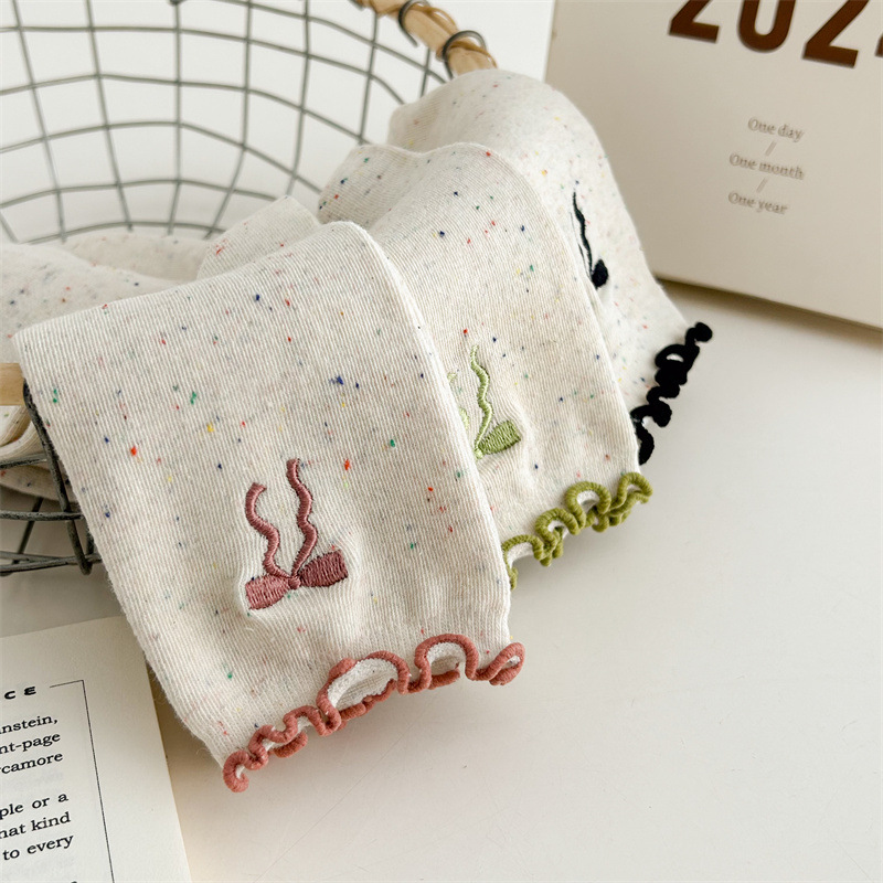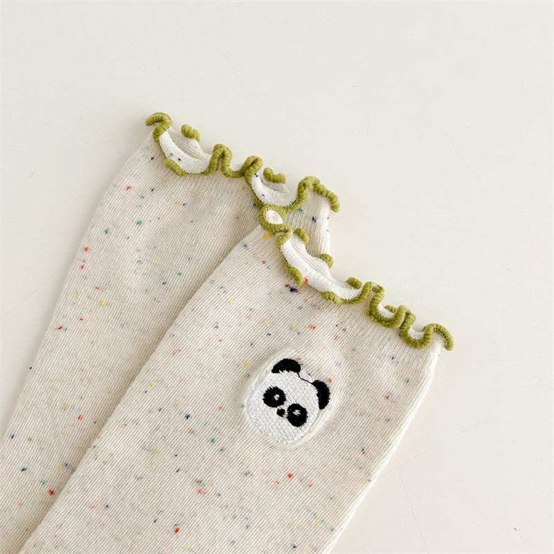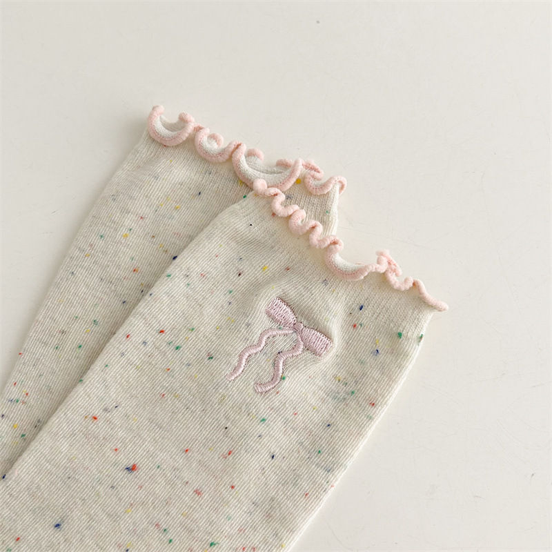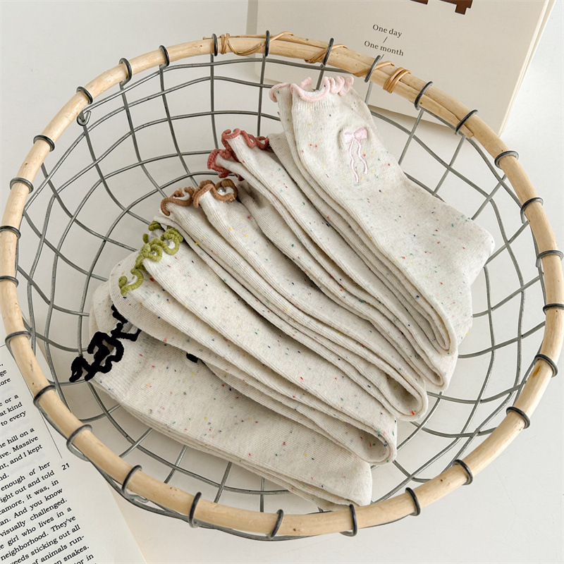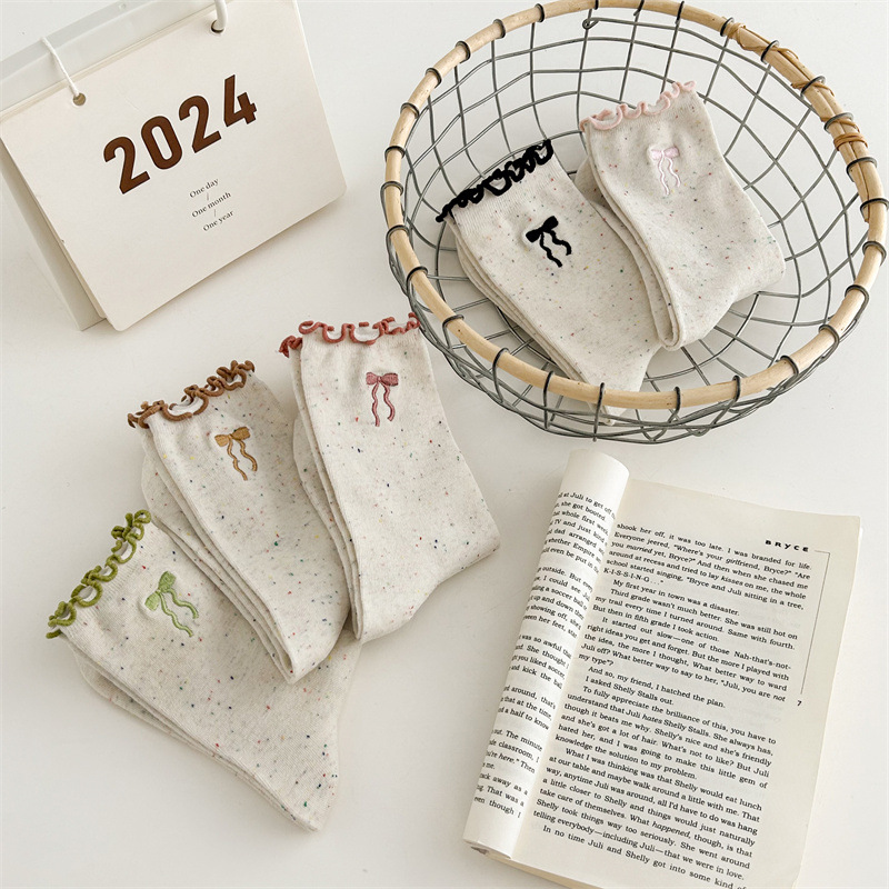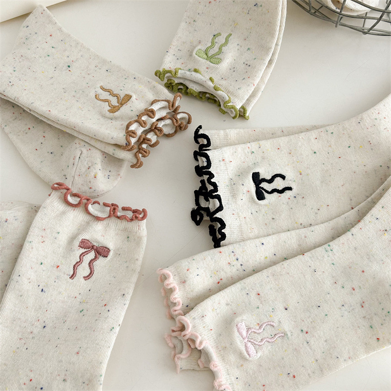 귀여운 레이스 양말 여성용 한국 강아지 중목 양말 도트무늬 레이스 트림 동물 자수 면 양말 롤업 양말