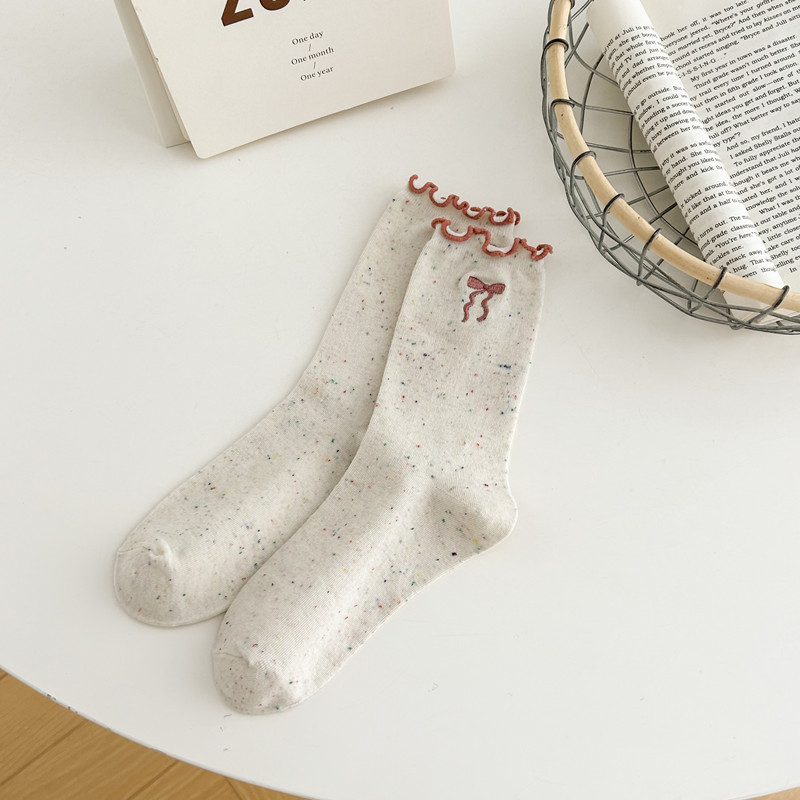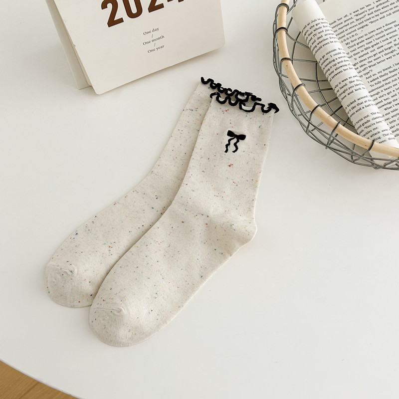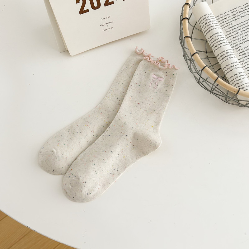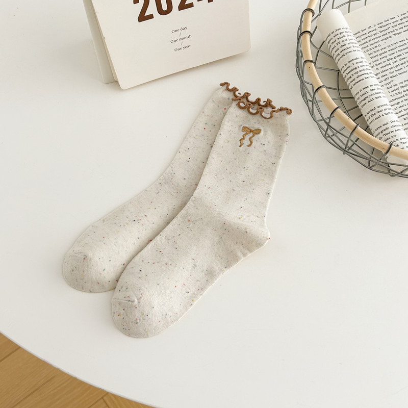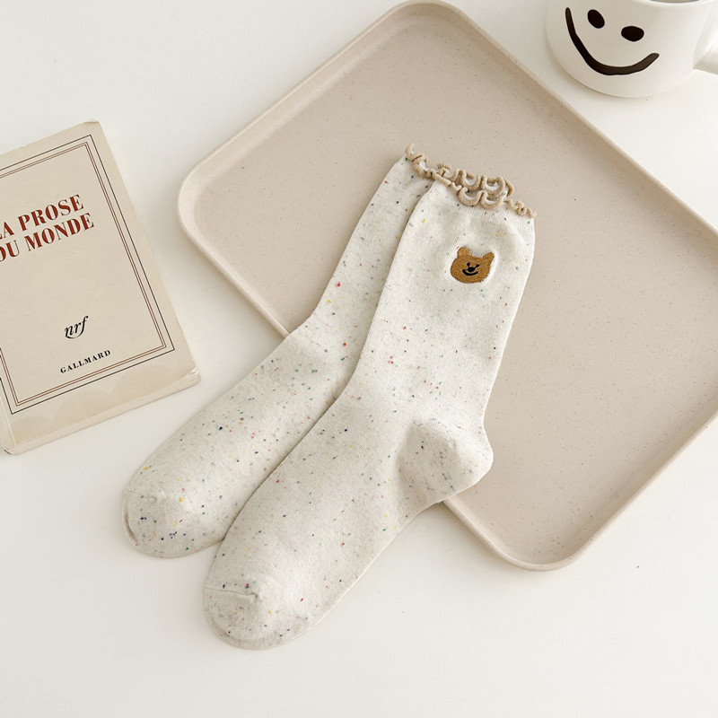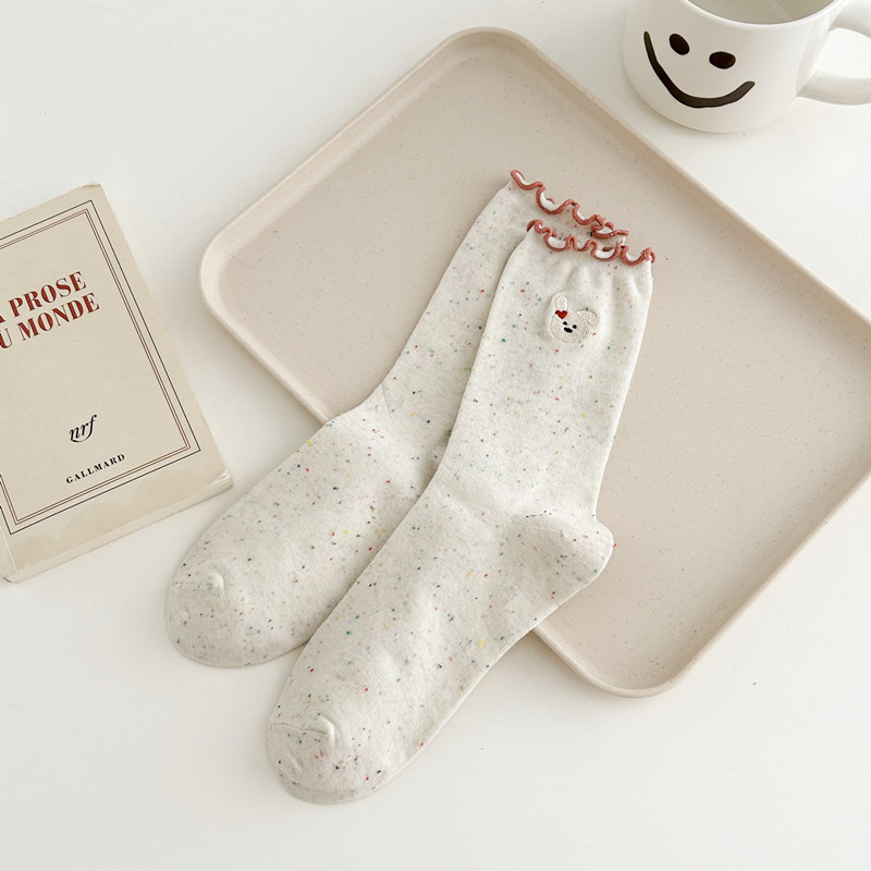 귀여운 레이스 양말 여성용 한국 강아지 중목 양말 도트무늬 레이스 트림 동물 자수 면 양말 롤업 양말스토어 가기