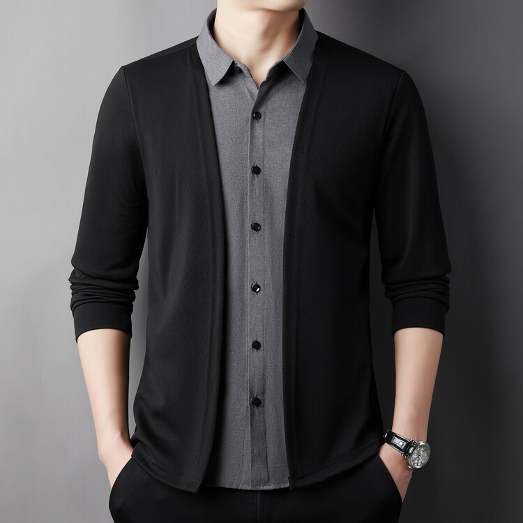 2025 새로운 가을 남성 가짜 투피스 셔츠 칼라 티셔츠 니트 카디건 캐주얼 비즈니스 스웨트 자켓 남성 의류스토어 가기