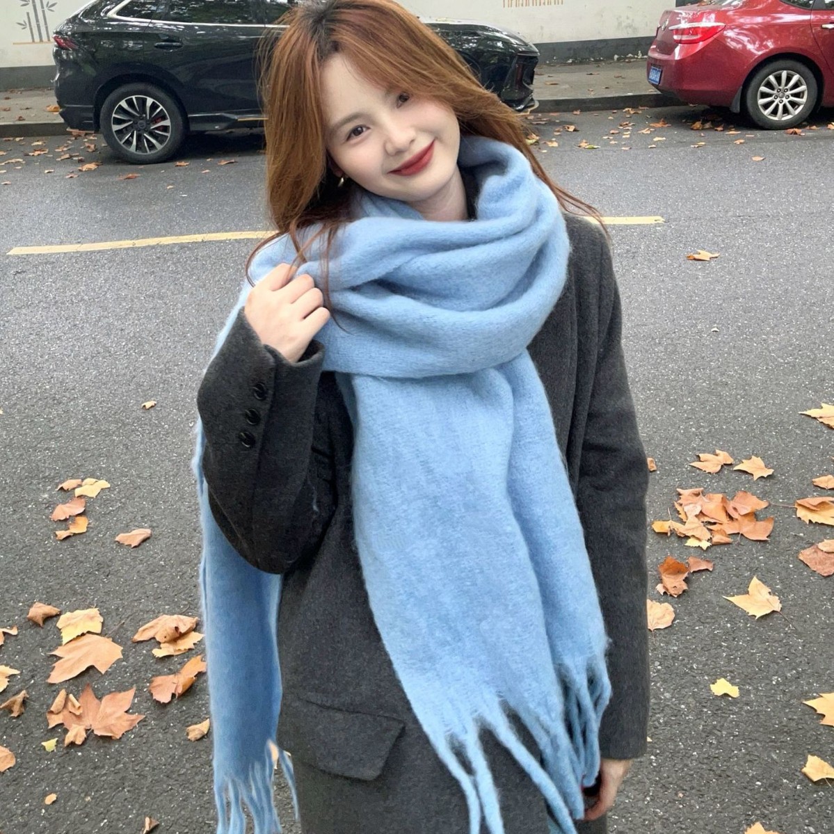 공장 새로운 단색 연무 블루 스카프 여성의 겨울 푹신한 머리카락이 두꺼운 학생 흰색 학생 따뜻한 스카프스토어 가기