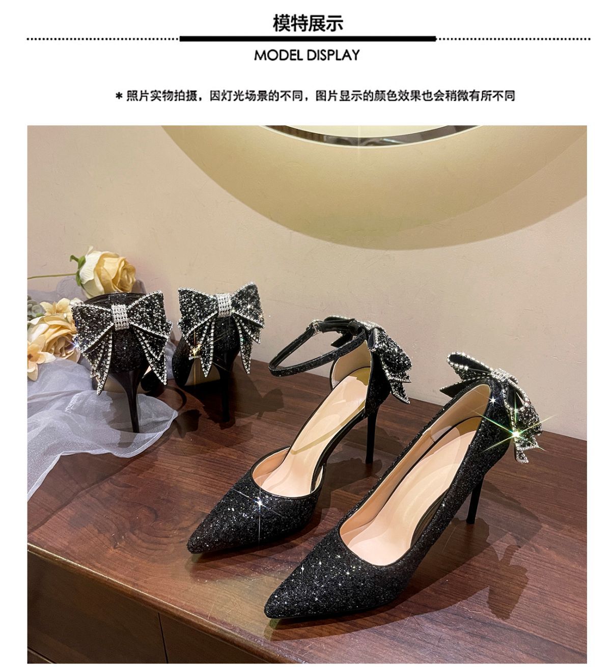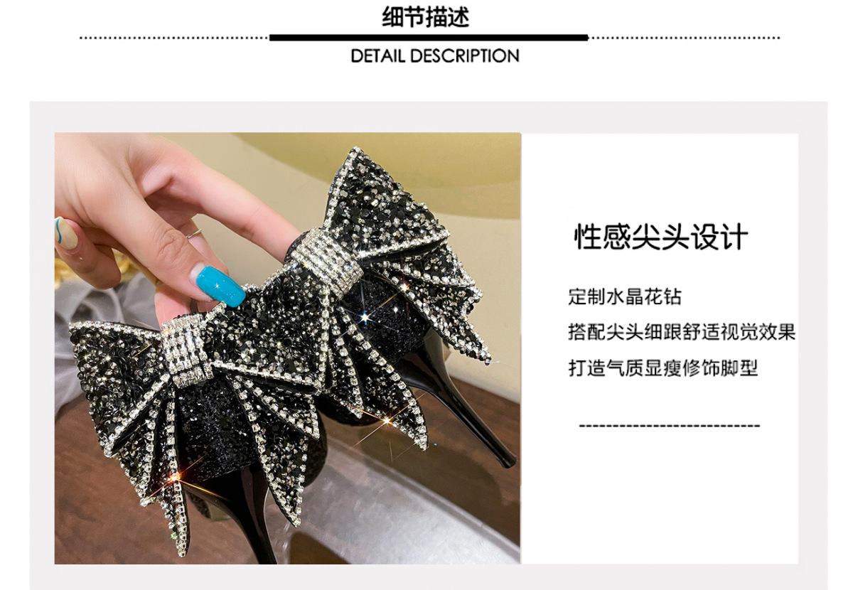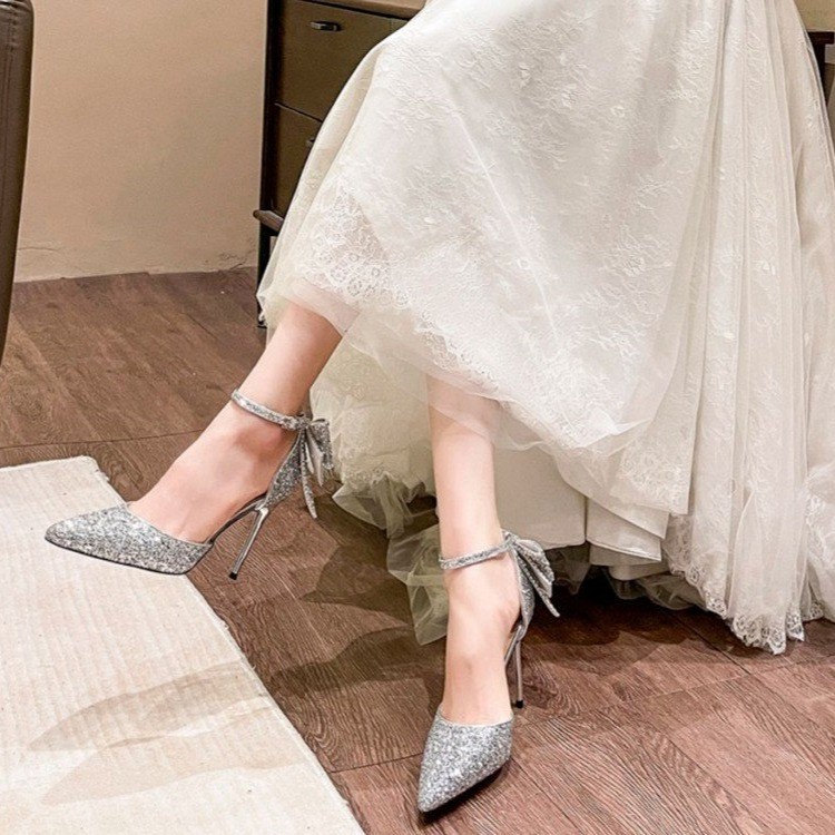 2025년 여름 신상품, 아름다운 스팽글 포인티드 토 페어리 리본 힐, 신부 웨딩 슈즈, 실버 하이힐 여성용스토어 가기