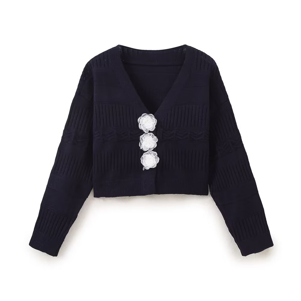 UC & ZA 재고 리얼 샷 2024 가을 여성의 작은 향기로운 꽃 장식 버클 니트 카디건 짧은 스웨터 재킷