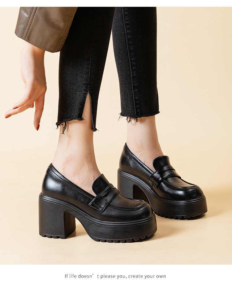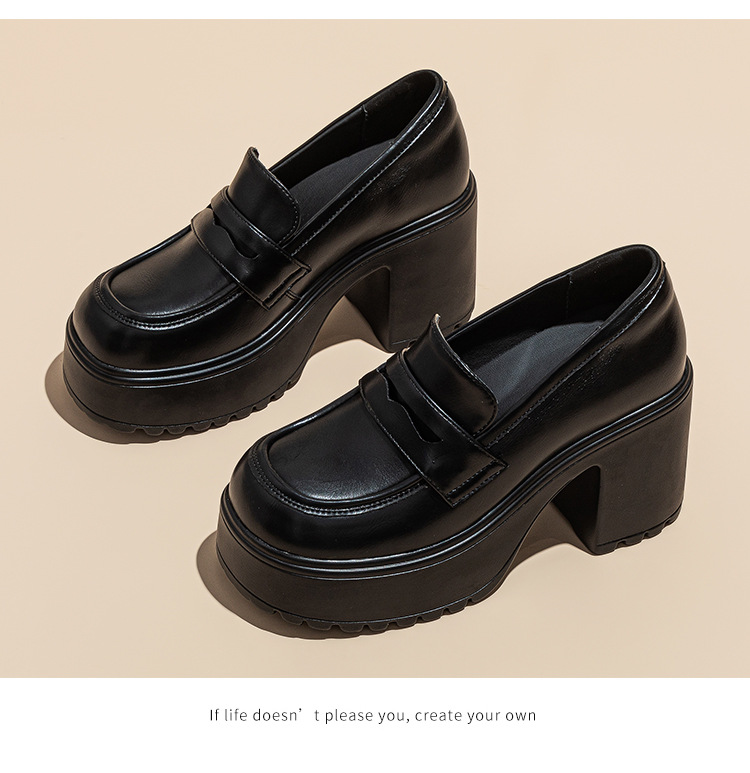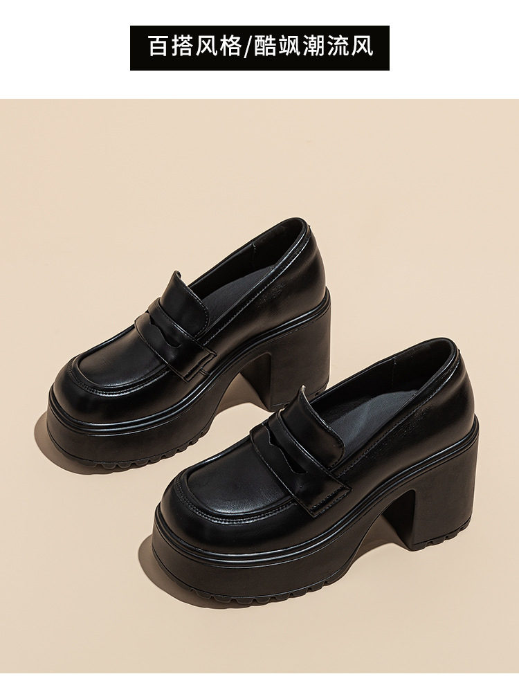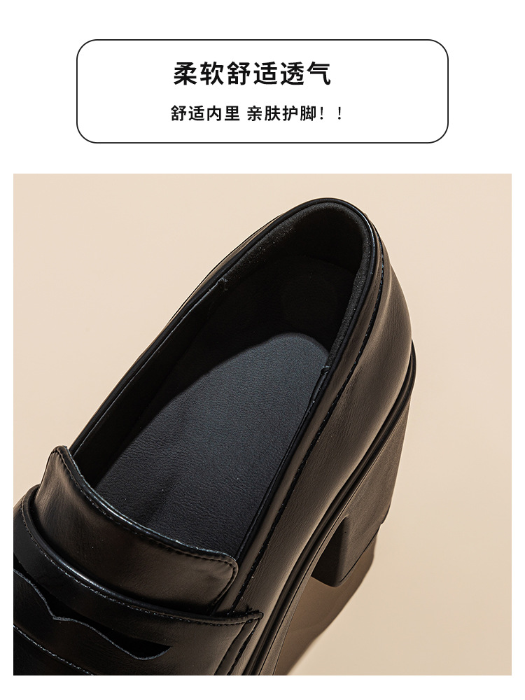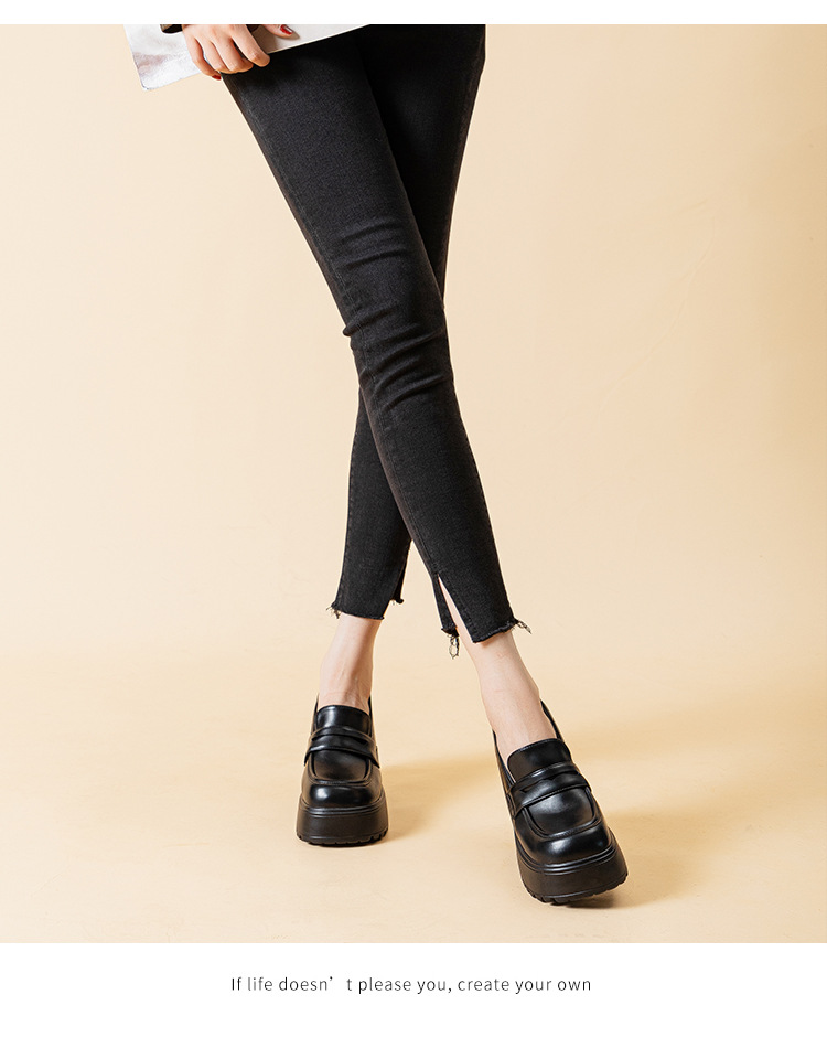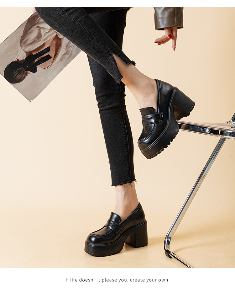 내부 높이 증가 작은 가죽 신발 라운드 머리 두꺼운 바닥 로퍼 여성의 2024 새로운 스타일 슬립 온 블랙 싱글 신발 두꺼운 가열 영국 스타일