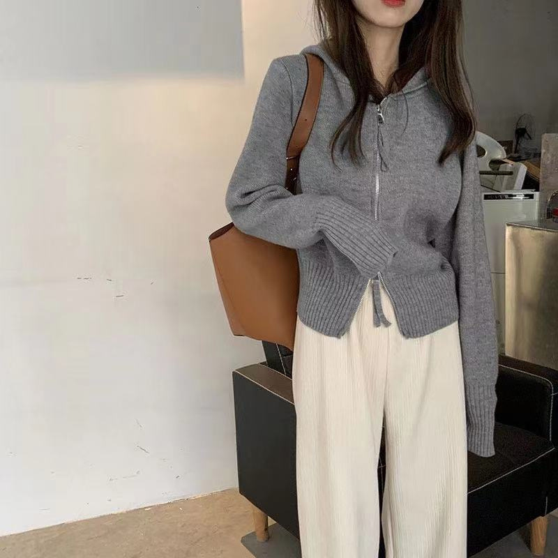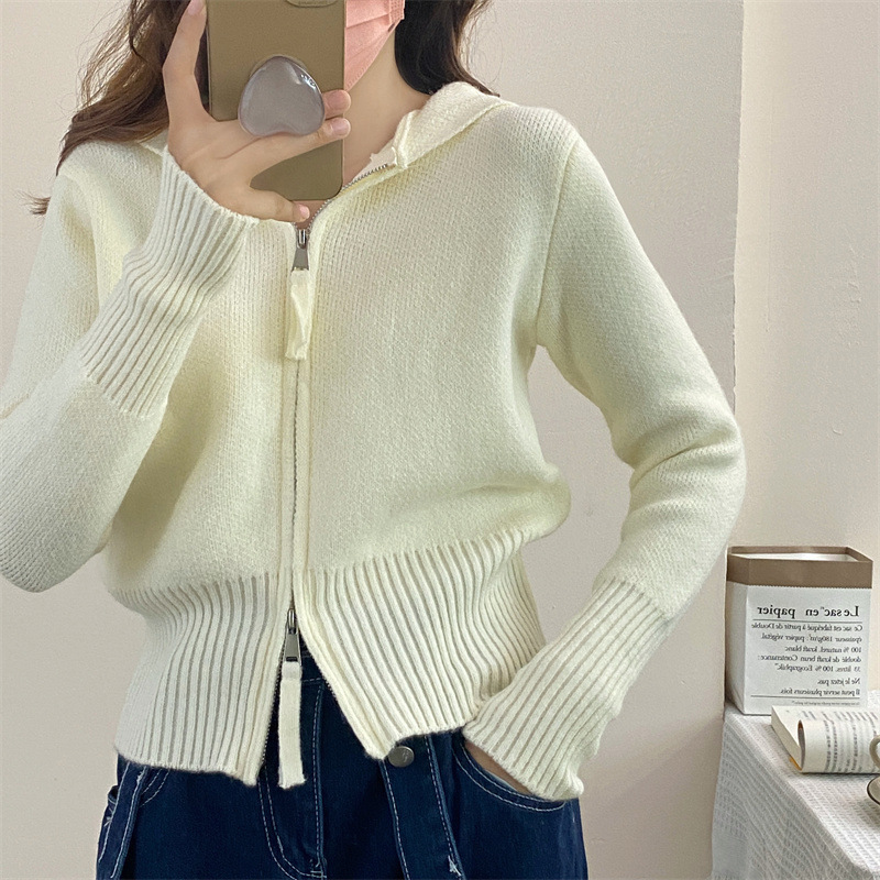 봄과 가을 새로운 한국 스타일 니트 더블 지퍼 카디건 여성용 어깨 소매 느슨한 단색 여성용 바느질 후드 스웨터