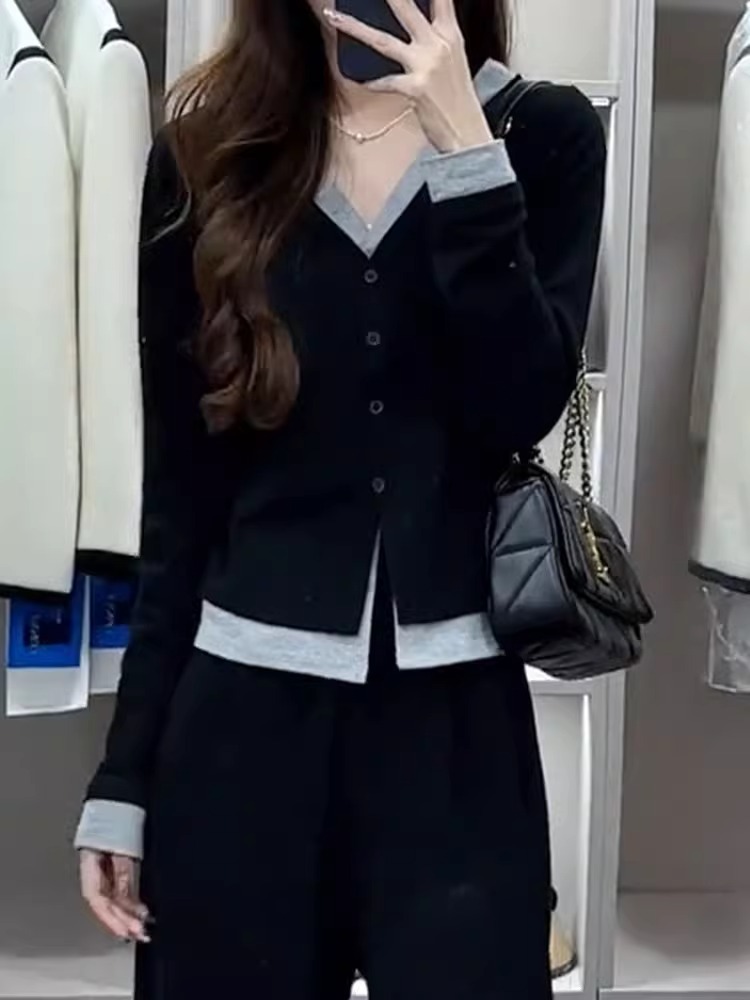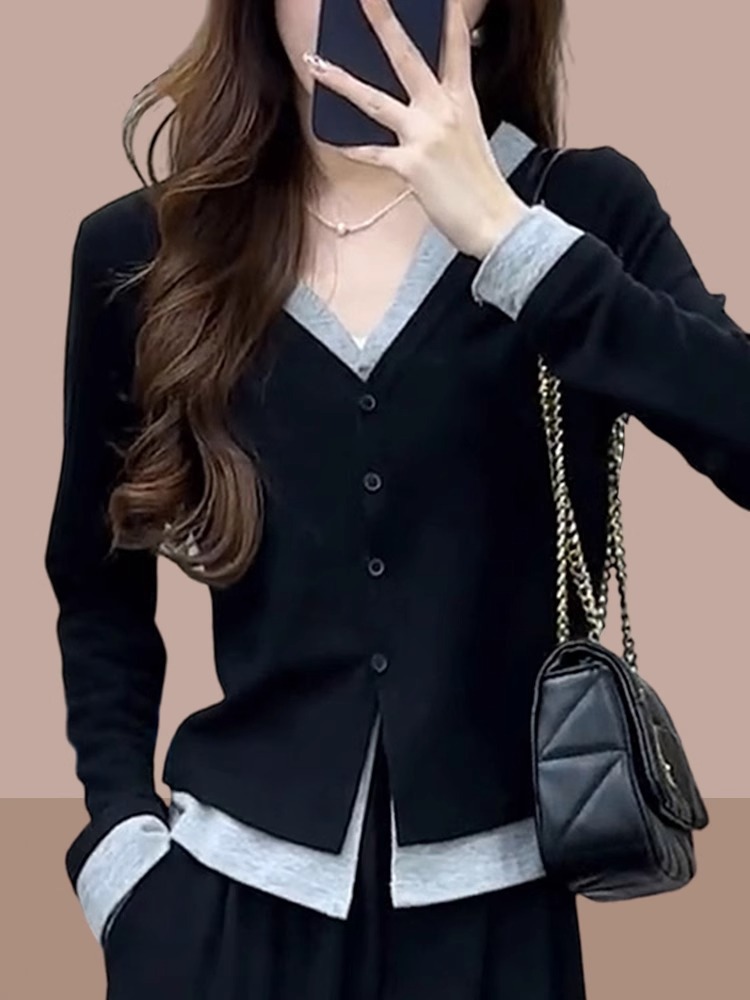 플러스 사이즈 바느질 가짜 투피스 V 넥 긴팔 티셔츠 여성의 봄과 가을 새로운 내베이스 셔츠 통통녀 슬리밍 카디건 탑