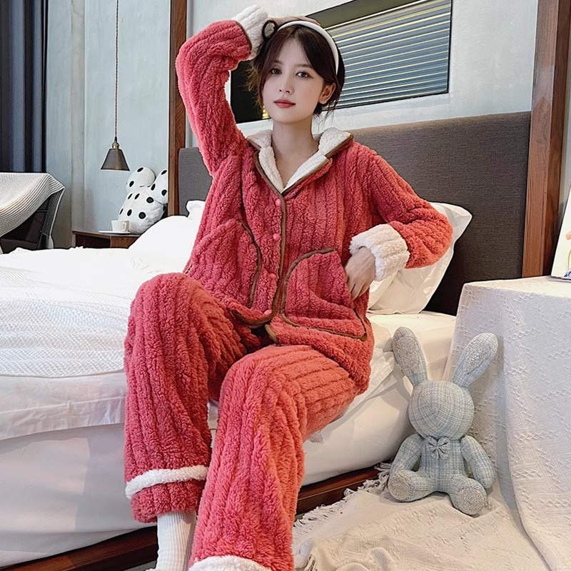 편안한 가을과 겨울 새로운 산호 양털 솔리드 컬러 여성용 플란넬 기모 두꺼운 외주 2 피스 홈 의류 세트