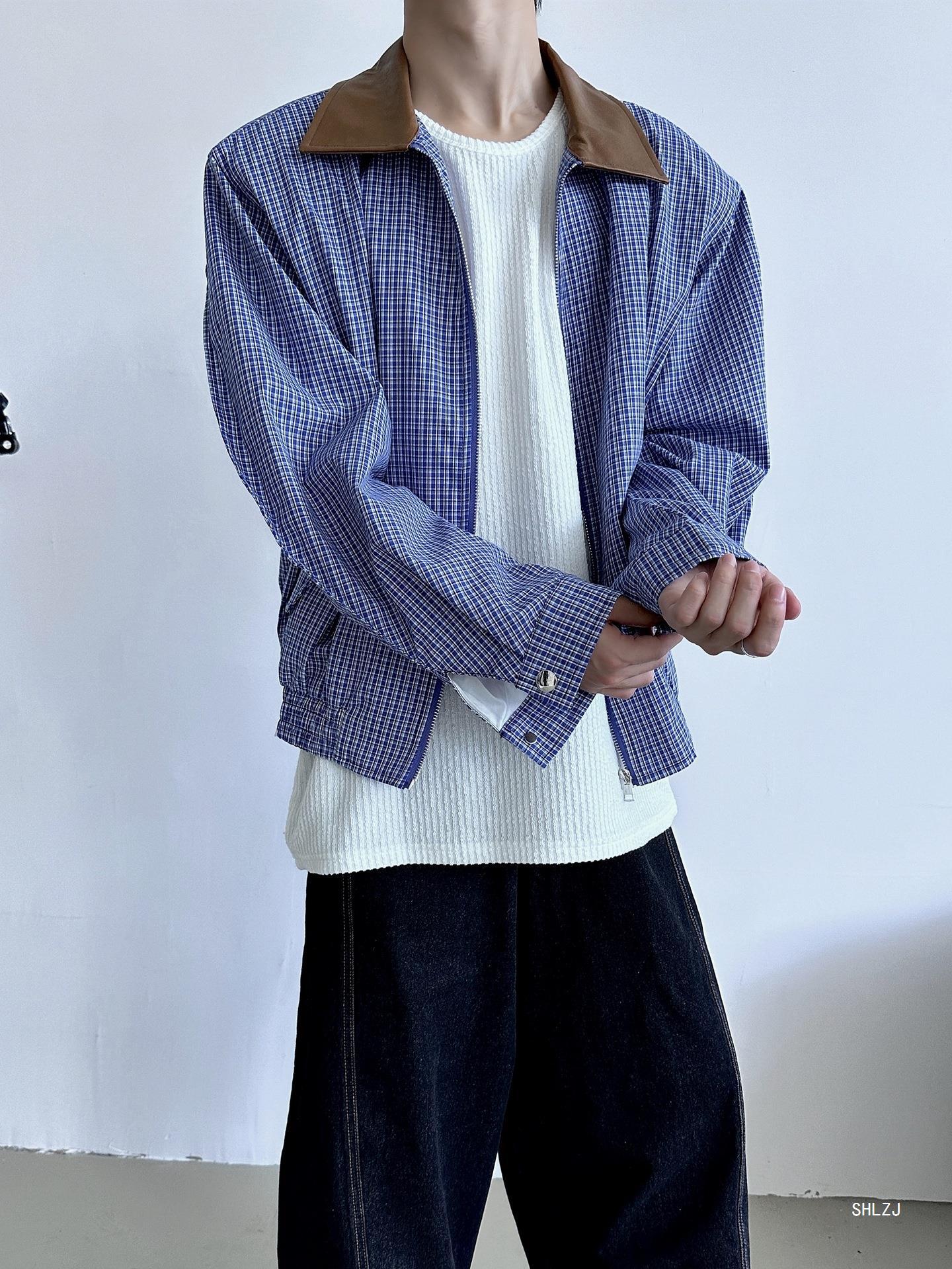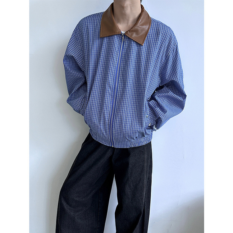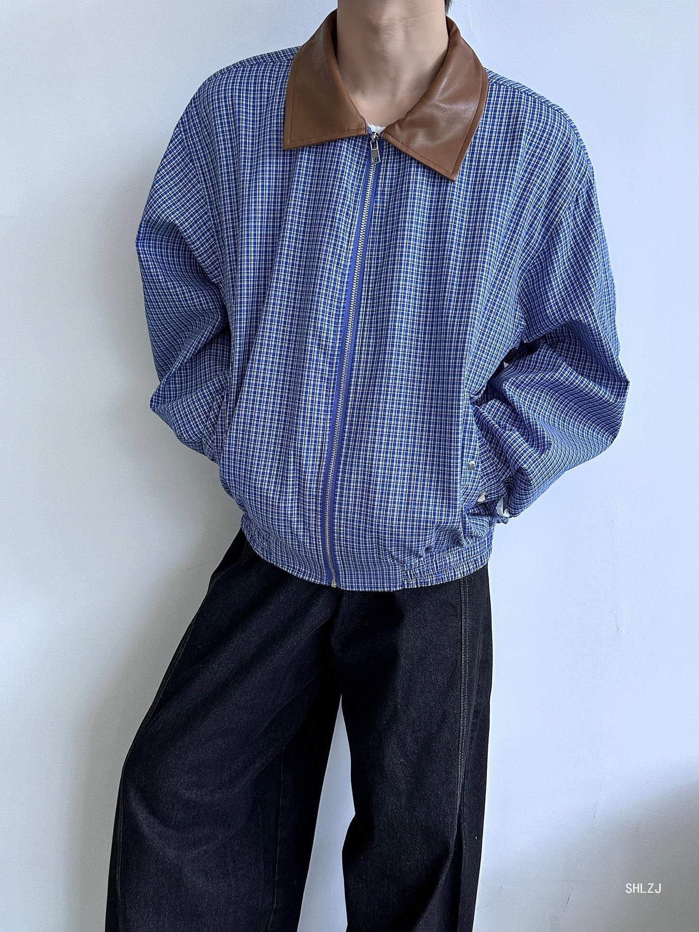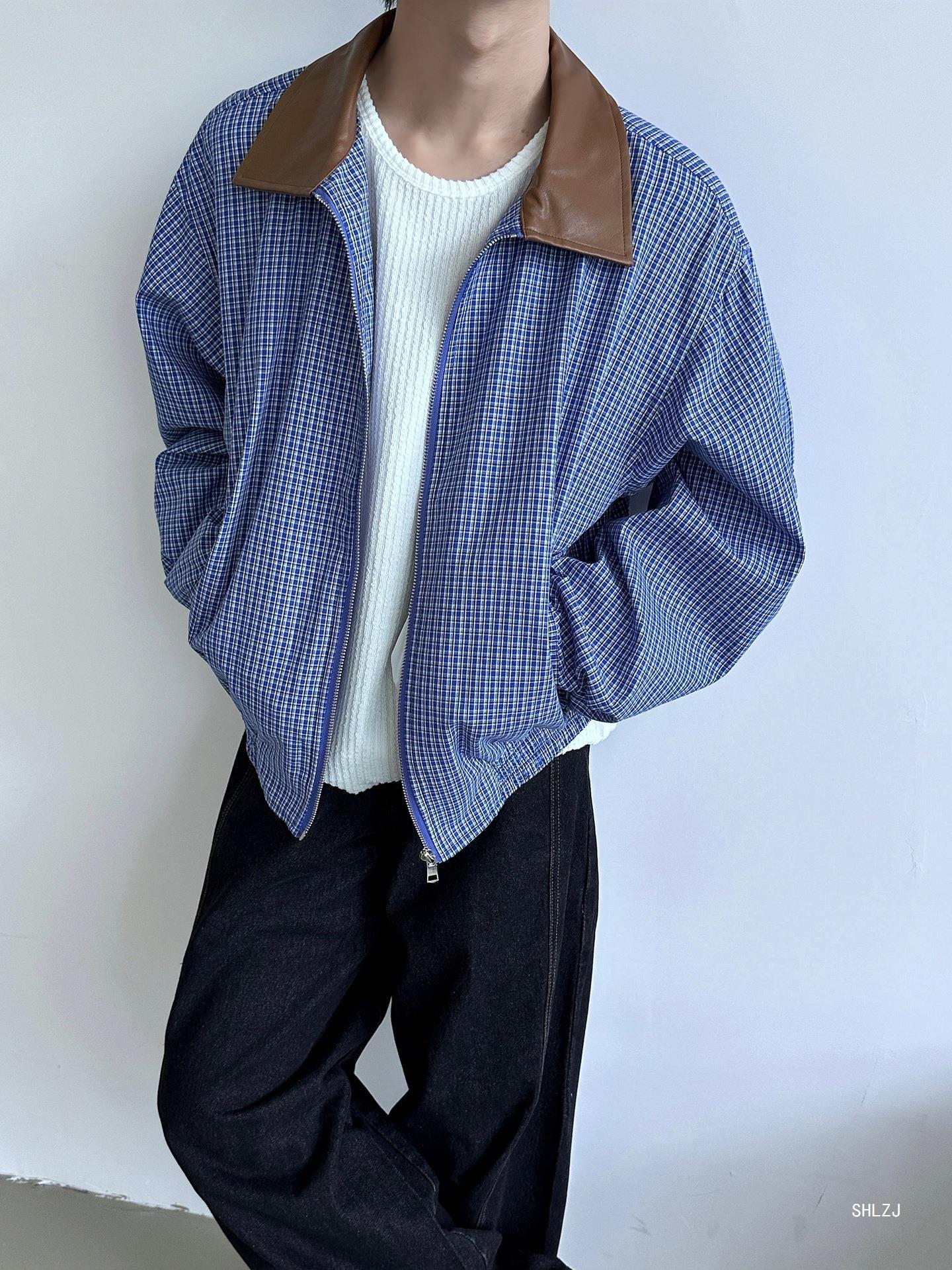 가을 2024 새로운 레트로 느슨한 명암 가죽 칼라 블루 격자 무늬 재킷 남자 올 매치 패드 어깨 최고 트렌디스토어 가기