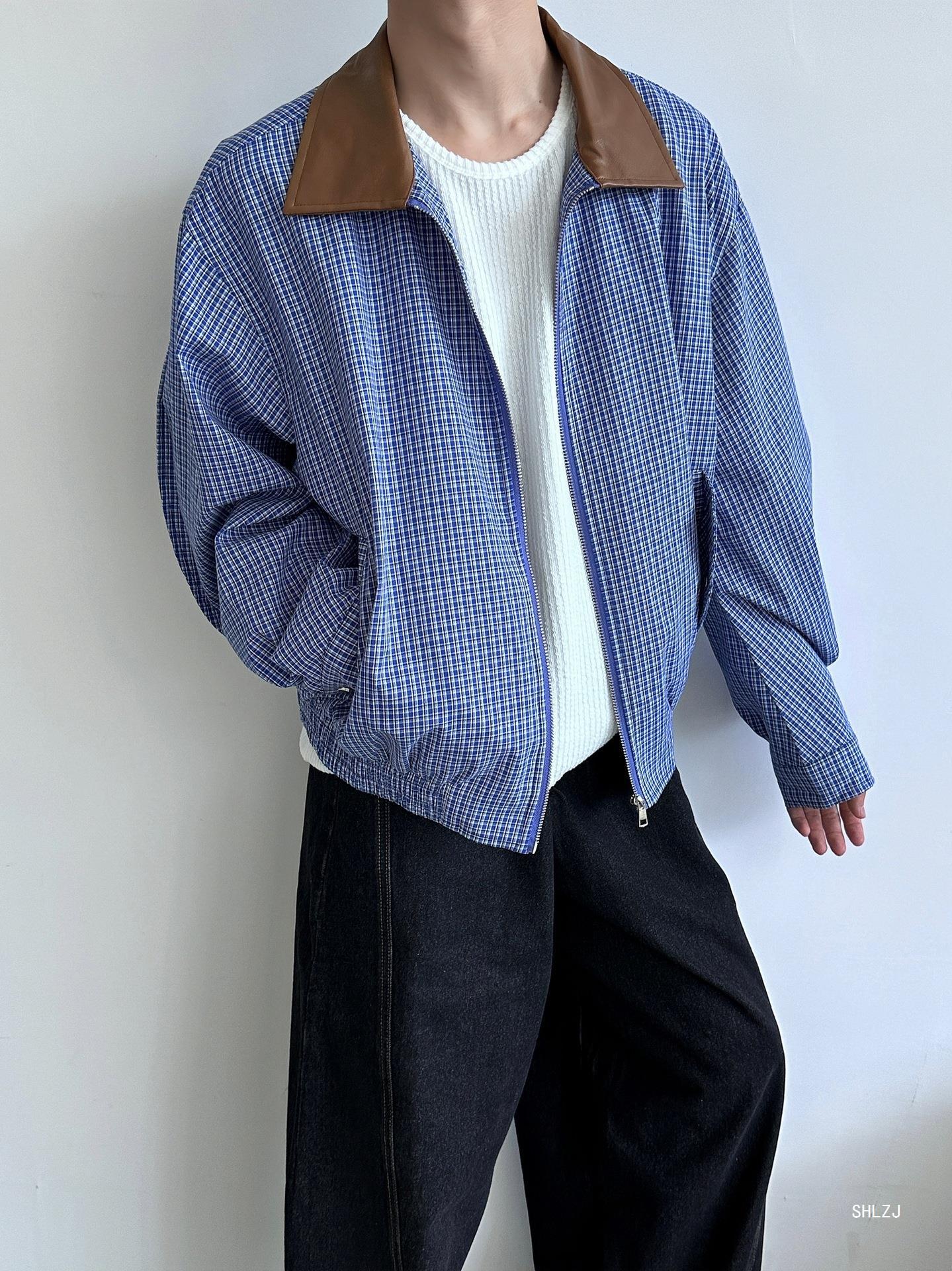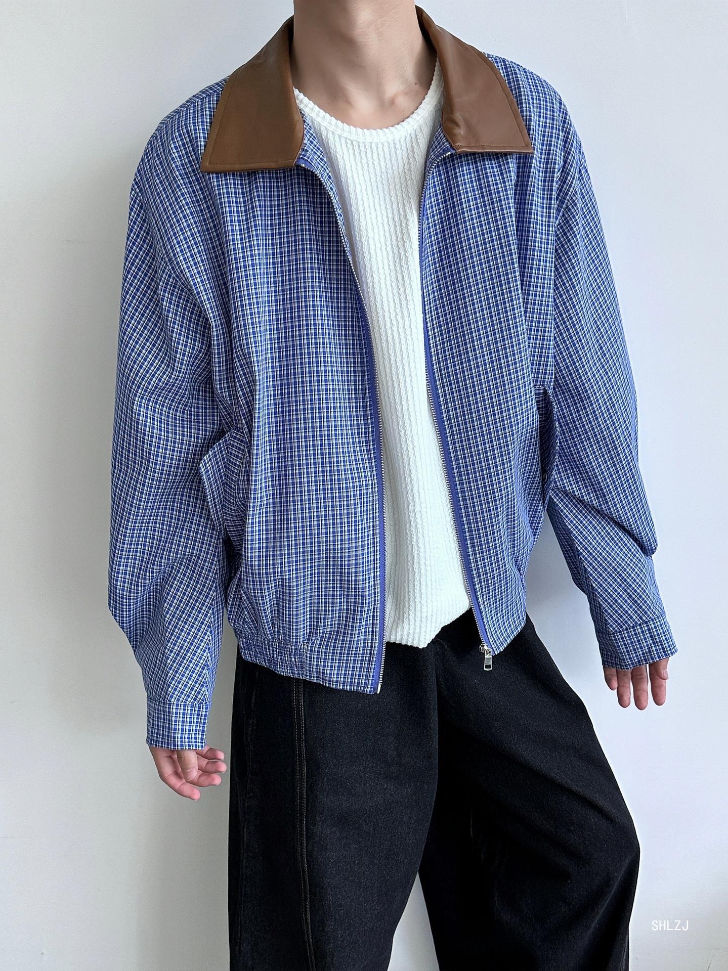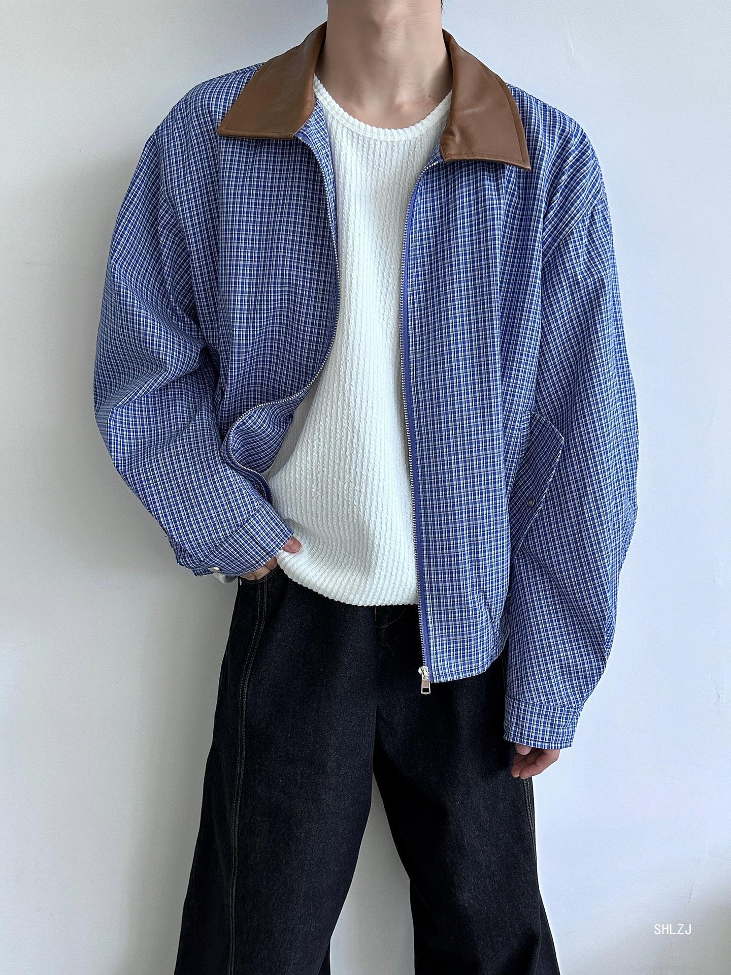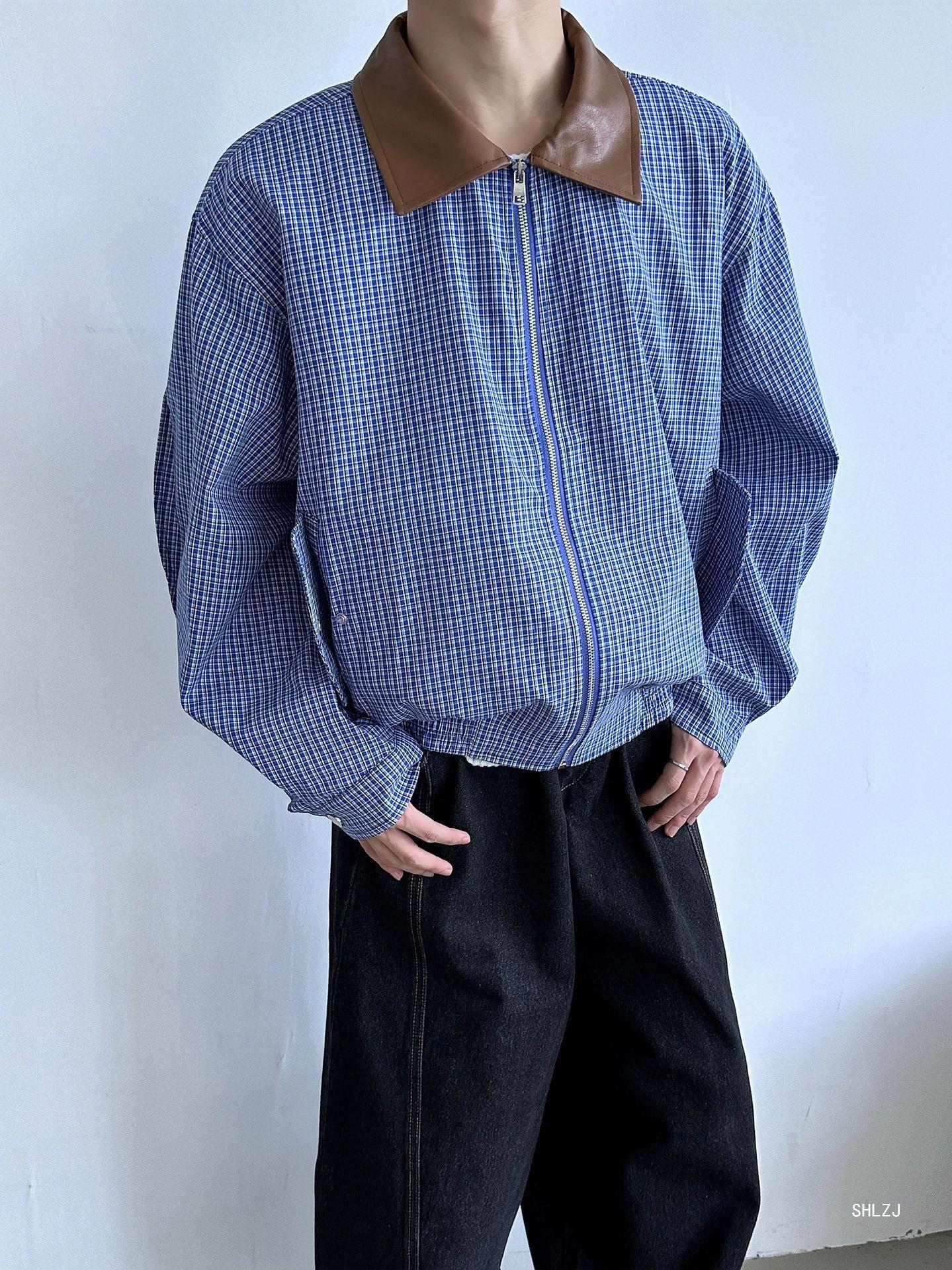가을 2024 새로운 레트로 느슨한 명암 가죽 칼라 블루 격자 무늬 재킷 남자 올 매치 패드 어깨 최고 트렌디스토어 가기