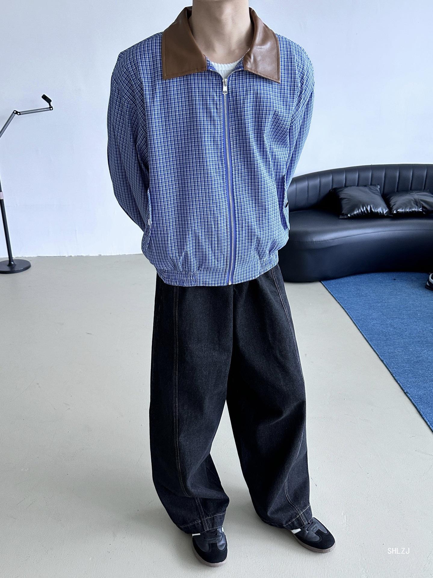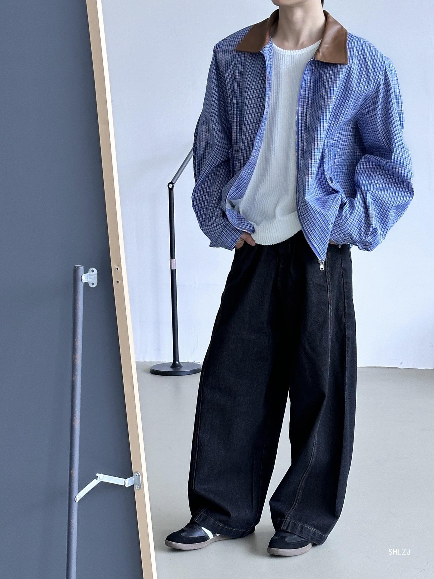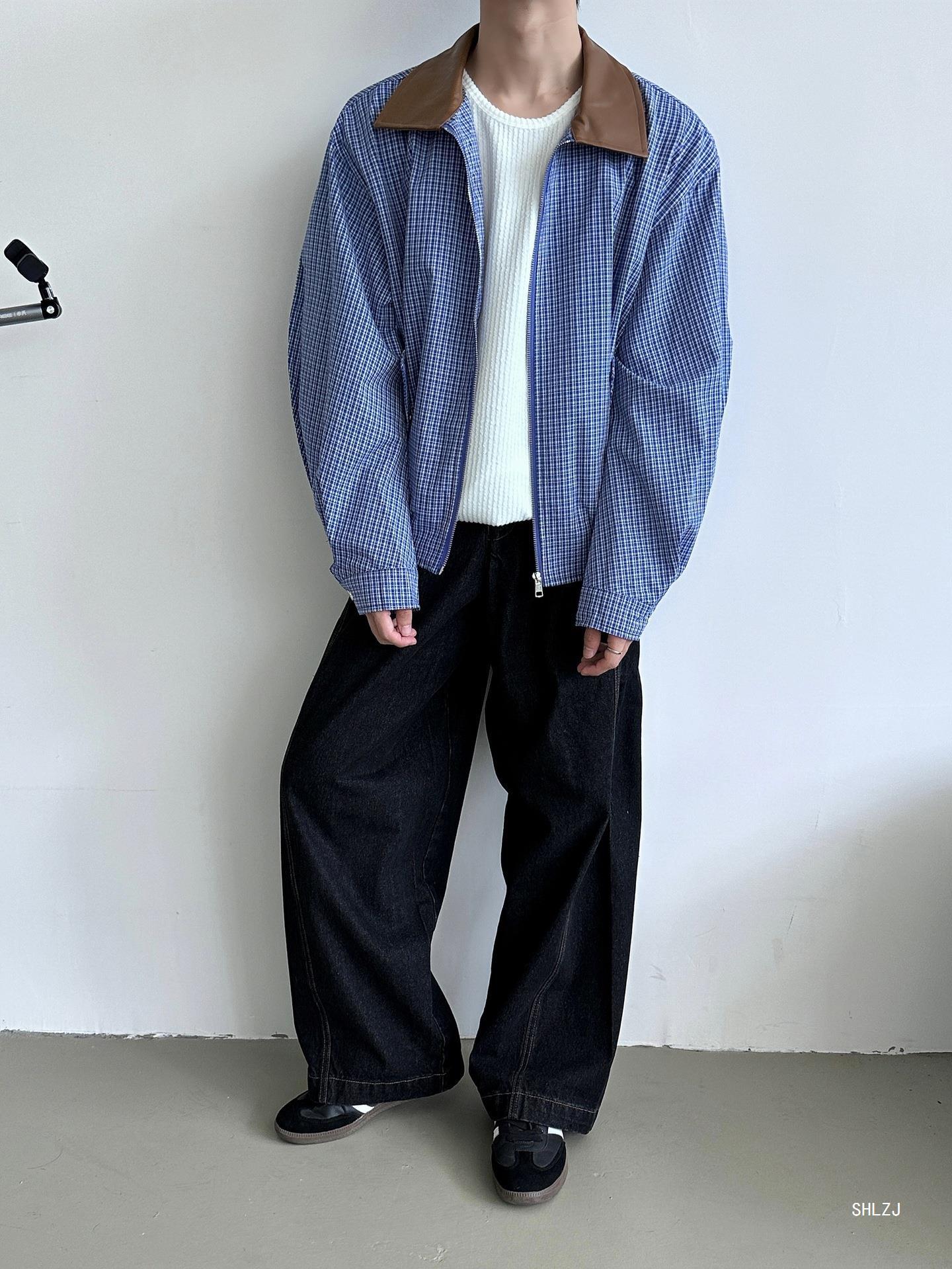가을 2024 새로운 레트로 느슨한 명암 가죽 칼라 블루 격자 무늬 재킷 남자 올 매치 패드 어깨 최고 트렌디스토어 가기
