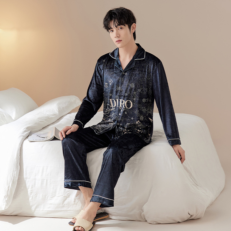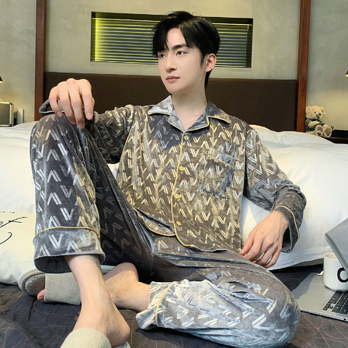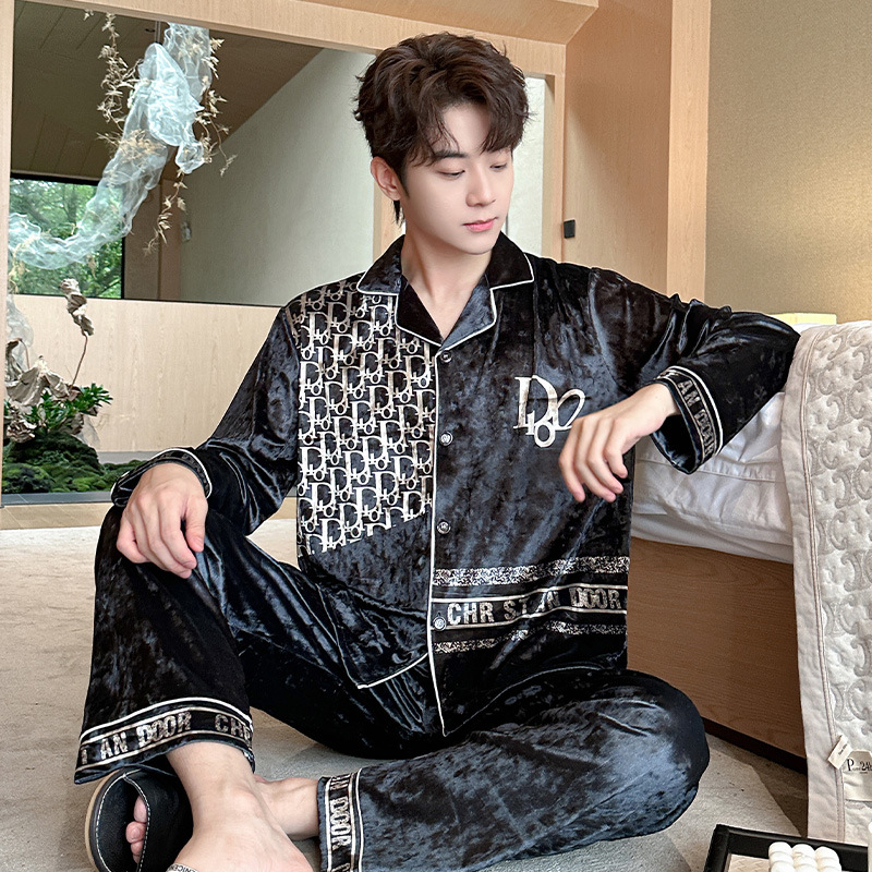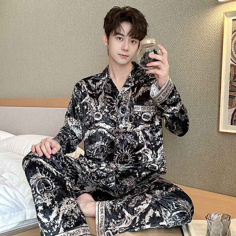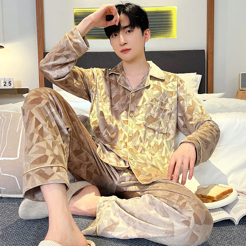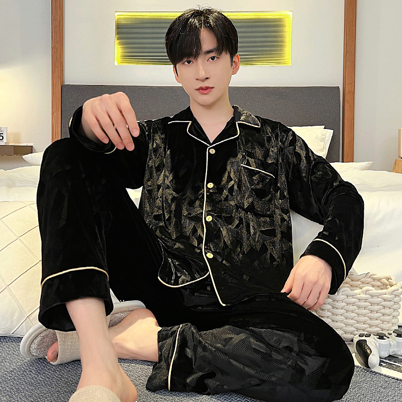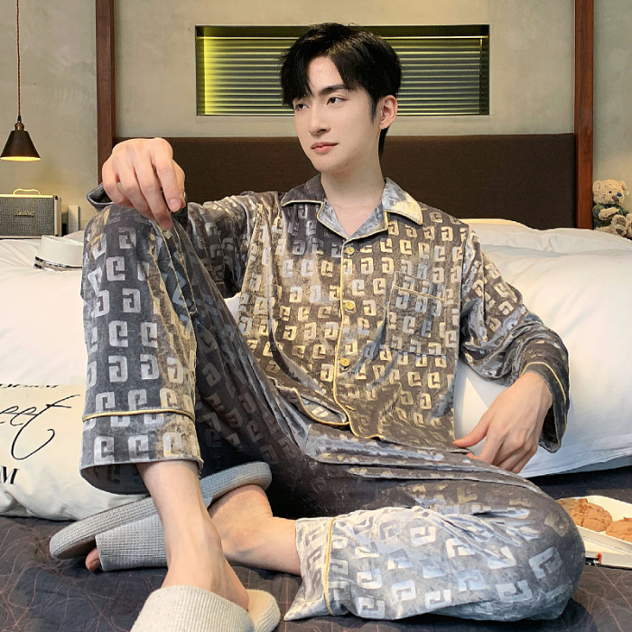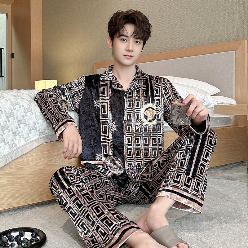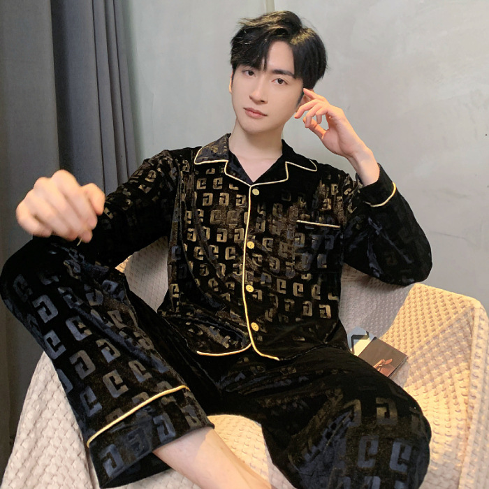 2024 다이아몬드 벨벳 남성 가을과 겨울 새로운 잠옷 잘 생긴 하이 엔드 센스 골드 벨벳 홈 옷은 세트 밖에서 입을 수 있습니다.