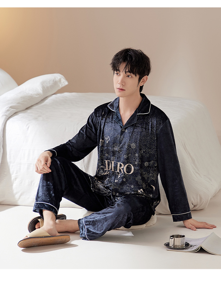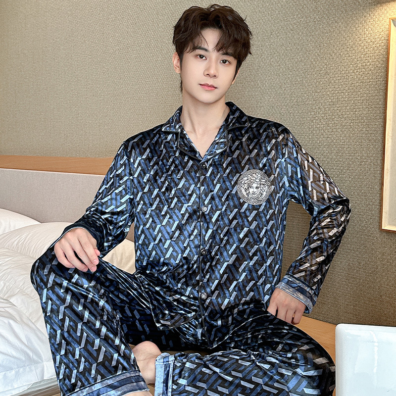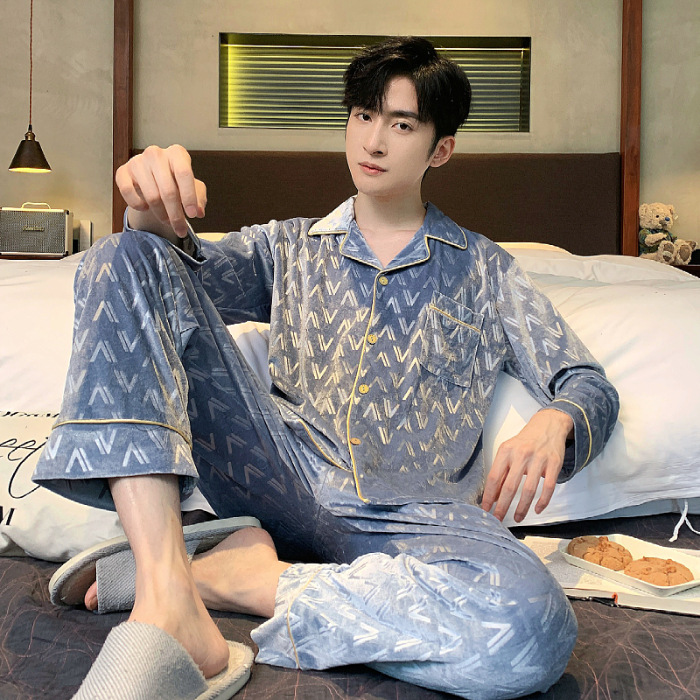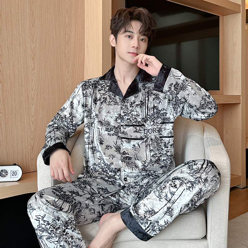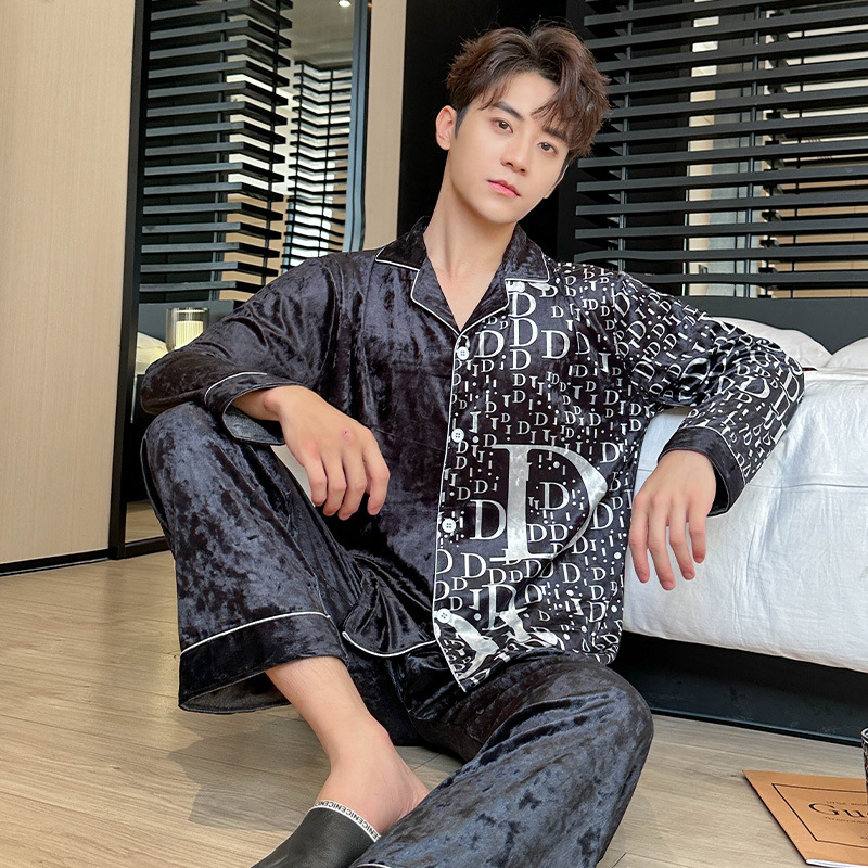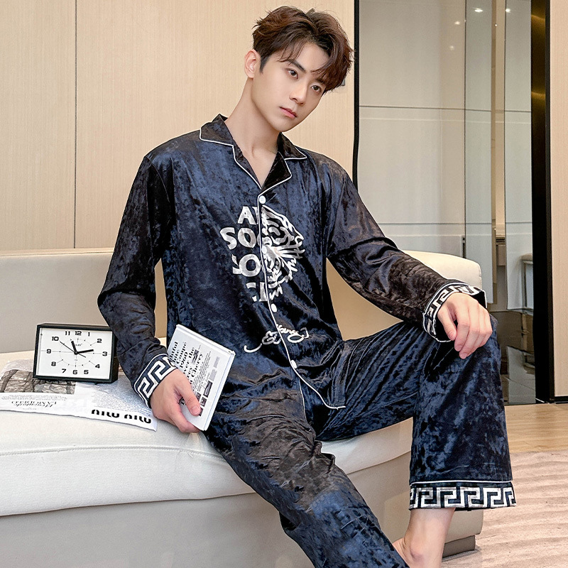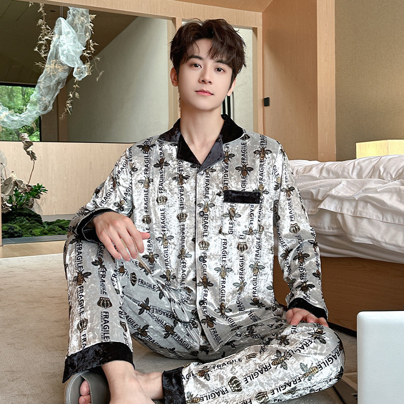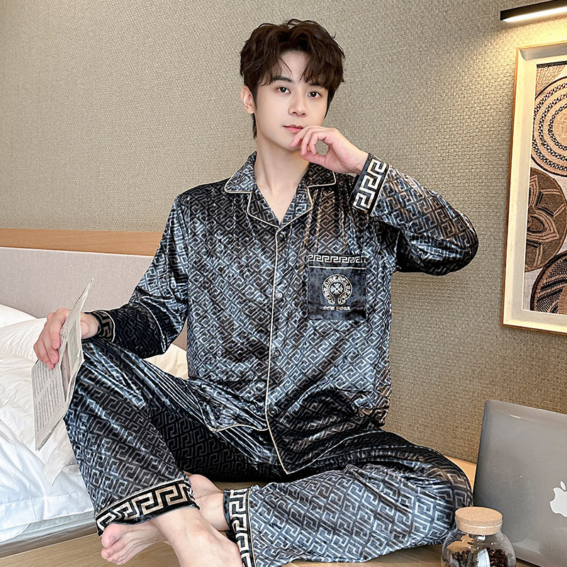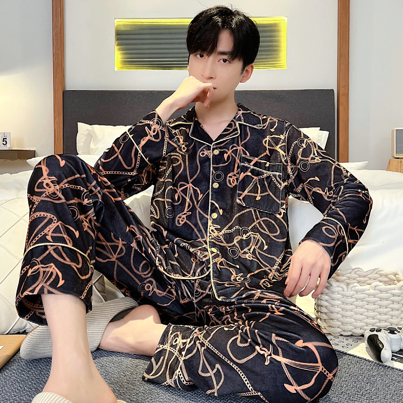 2024 다이아몬드 벨벳 남성 가을과 겨울 새로운 잠옷 잘 생긴 하이 엔드 센스 골드 벨벳 홈 옷은 세트 밖에서 입을 수 있습니다.