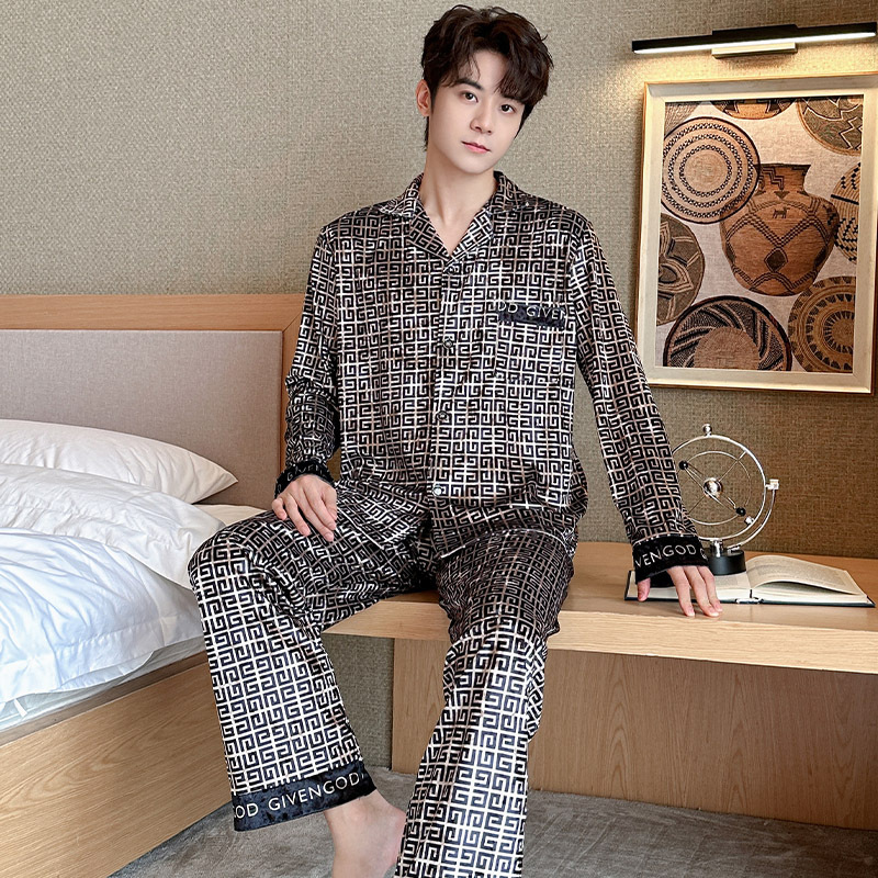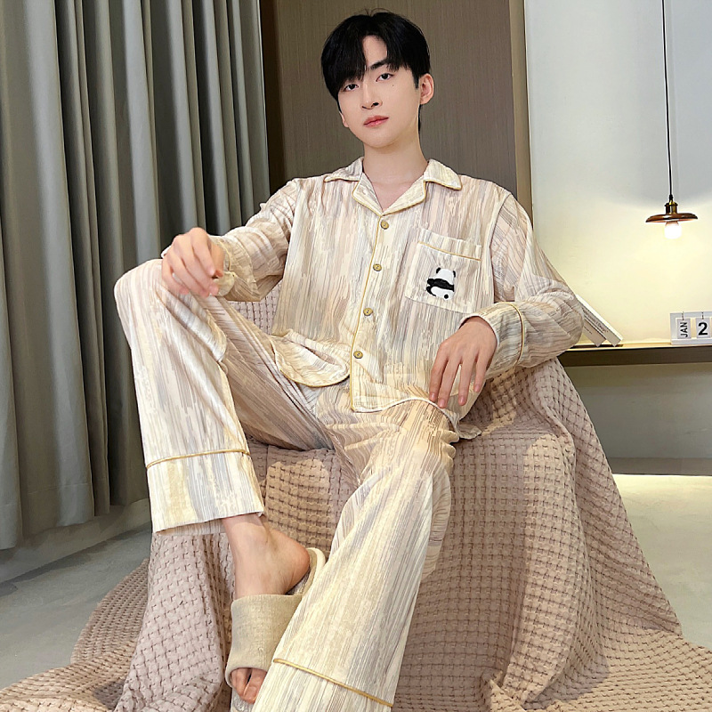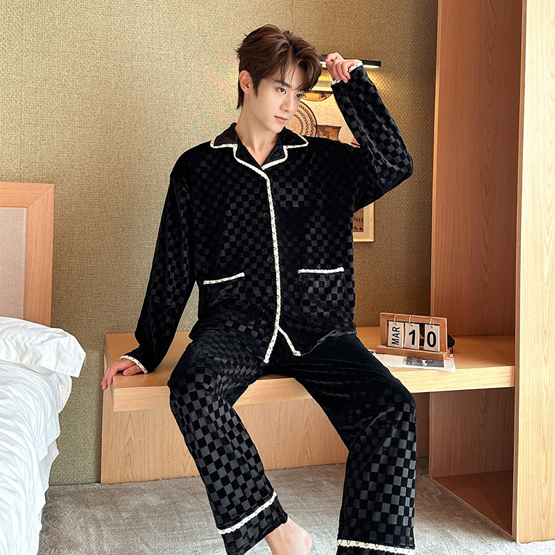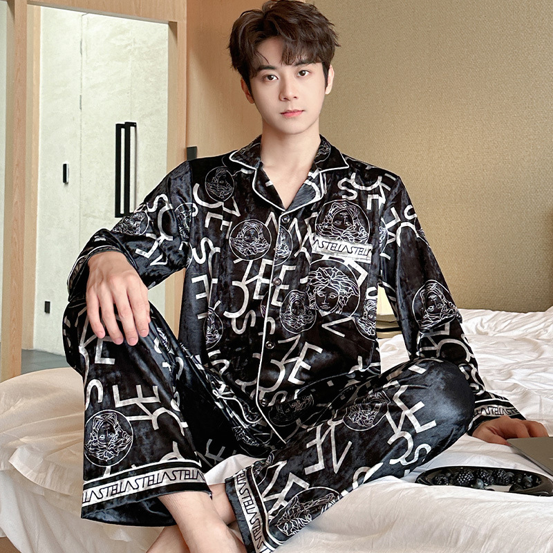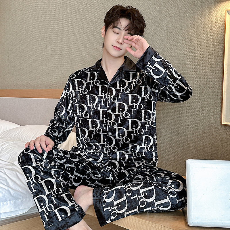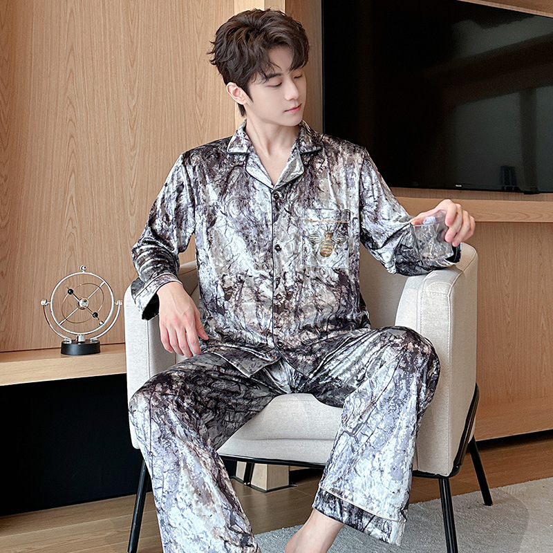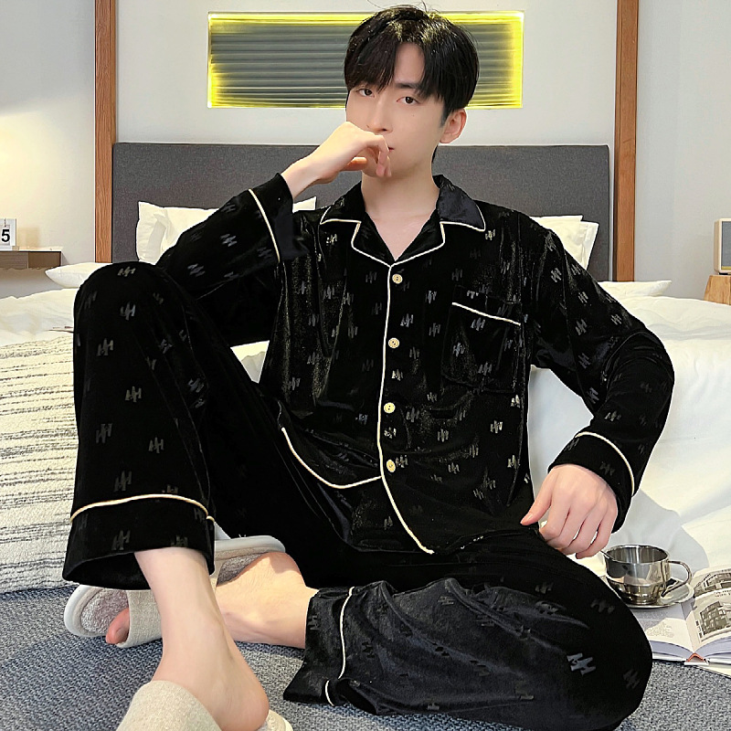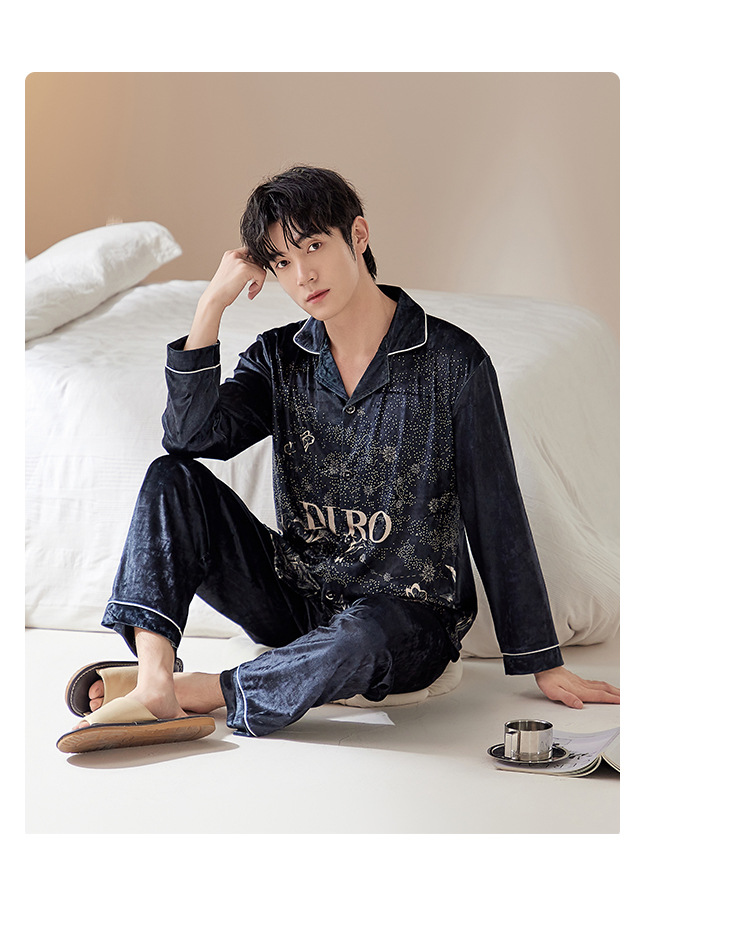 2024 다이아몬드 벨벳 남성 가을과 겨울 새로운 잠옷 잘 생긴 하이 엔드 센스 골드 벨벳 홈 옷은 세트 밖에서 입을 수 있습니다.